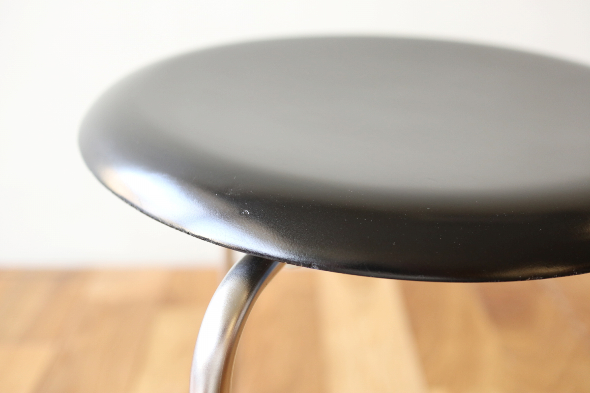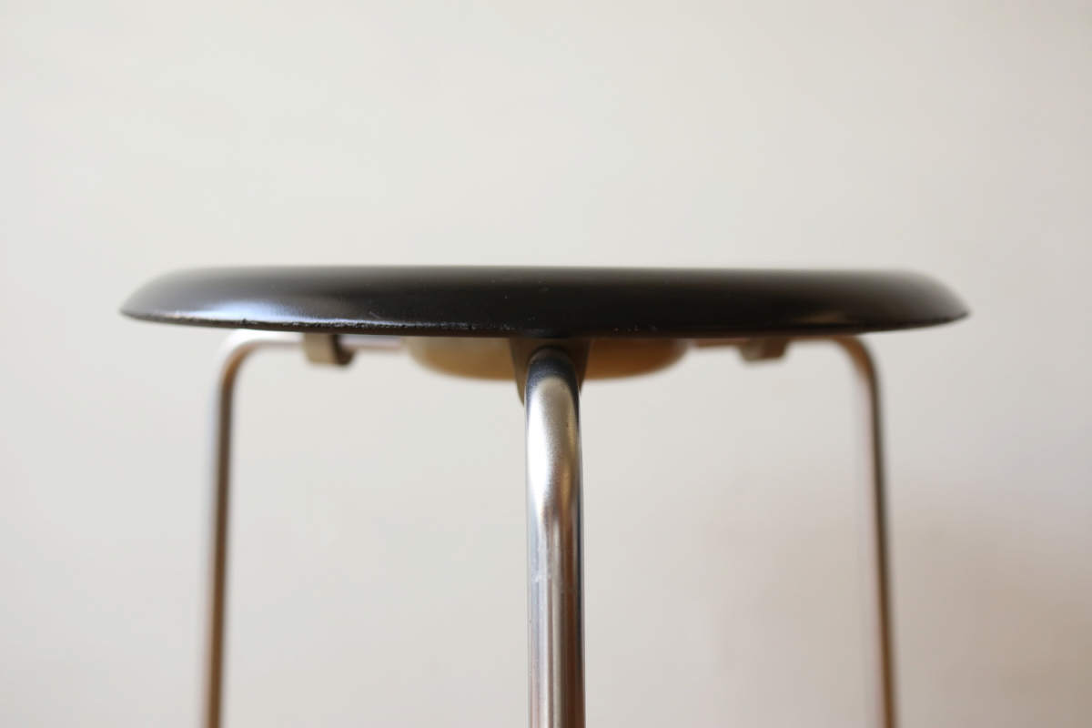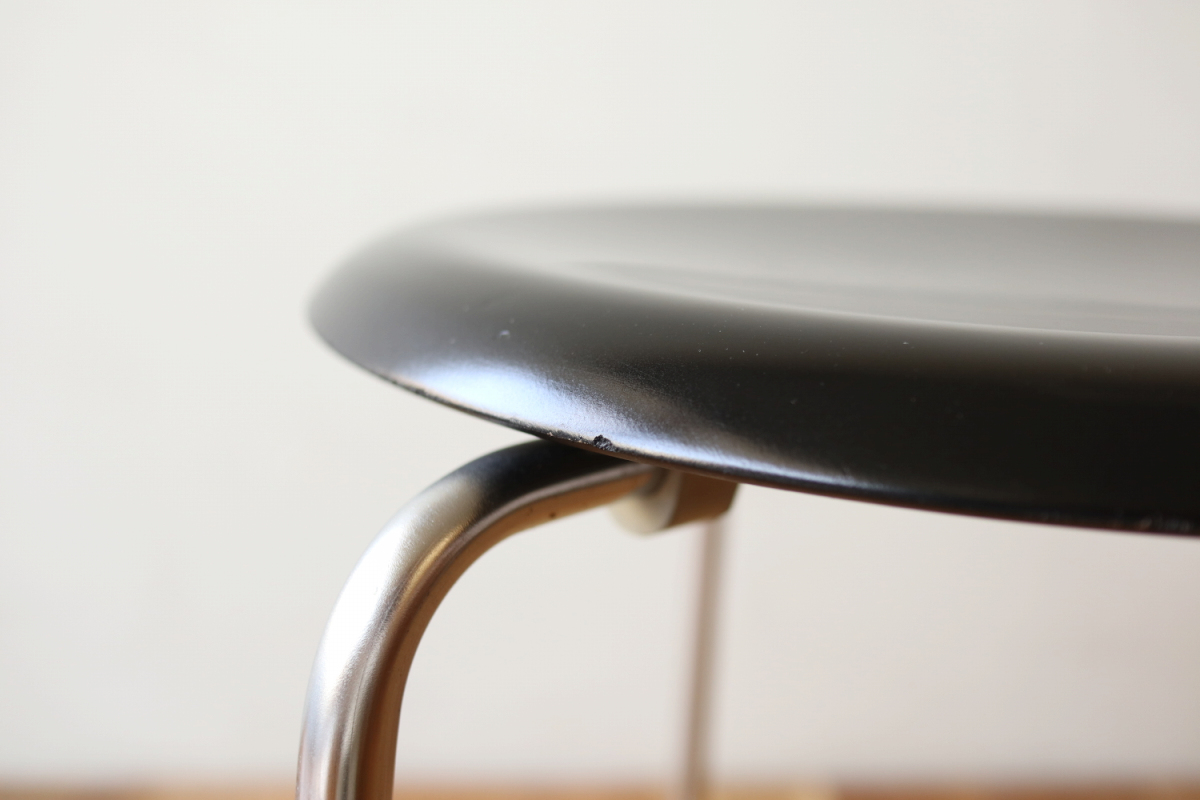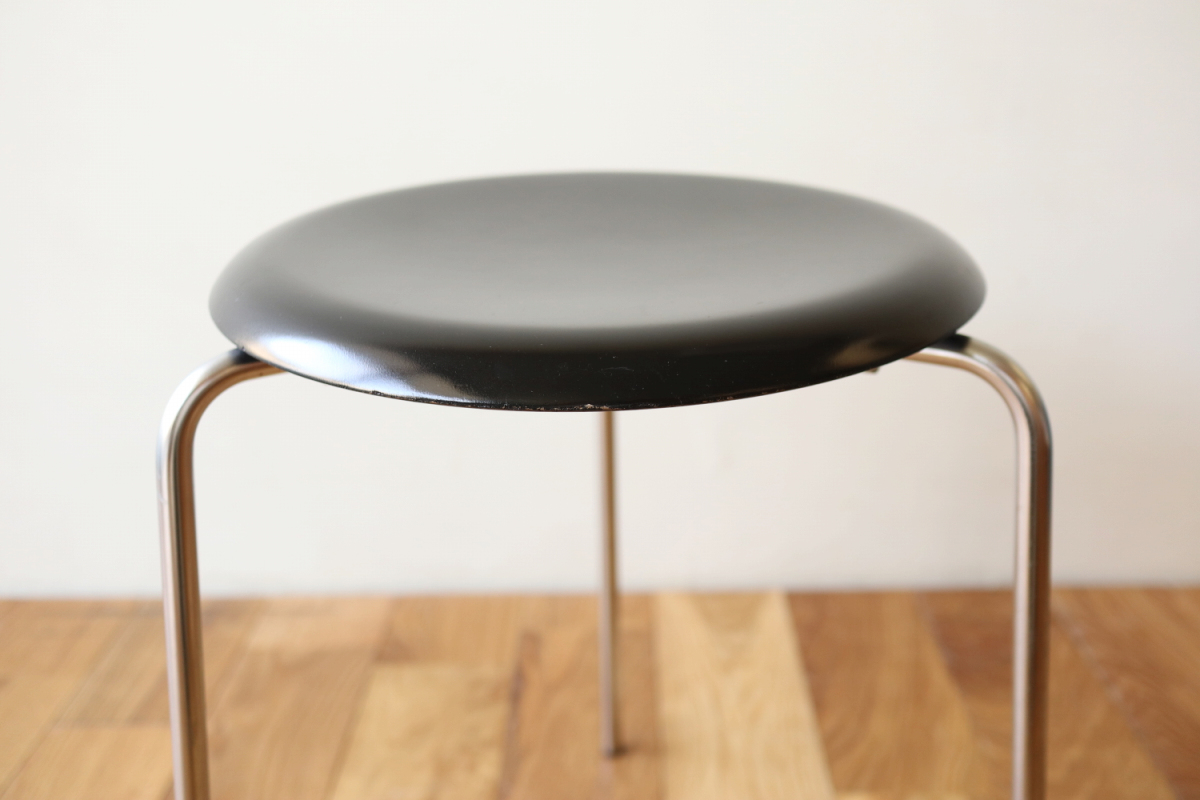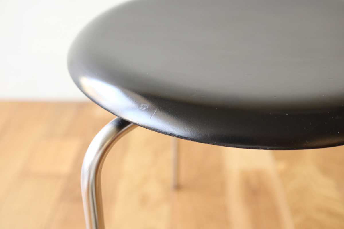 | Arne Jacobsenのどっとスツールです。 1970年製、FRITZ HANSEN社のVINTAGE、3本脚のドットスツール(3170)。 座面はもともとブラック塗装の仕様で、後年にオーバーラッカーされて綺麗にメンテされております。おります。 座面の中央をくぼませたデザインで実際の座り心地も良いです。 様々なシーンに合うミニマルデザインです。 |