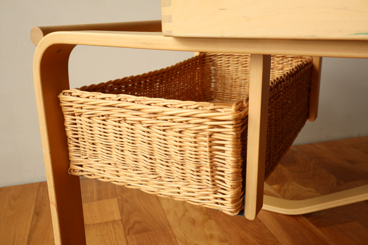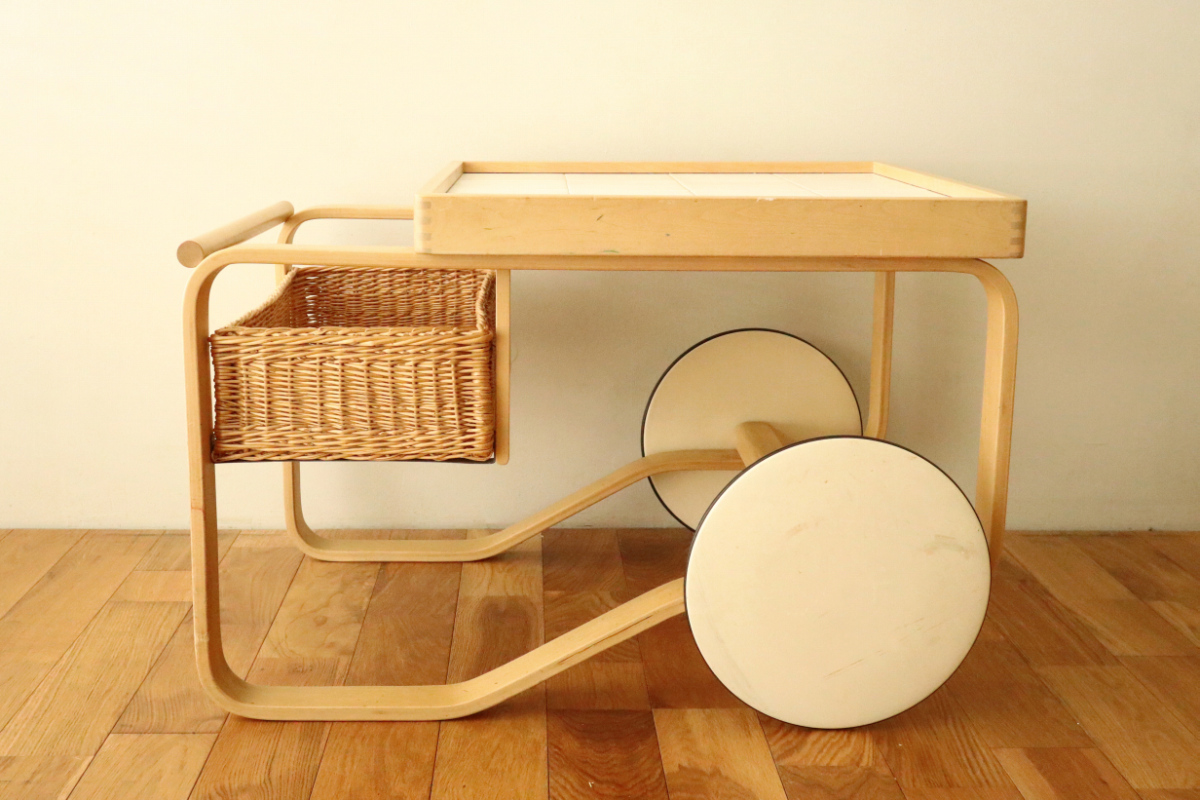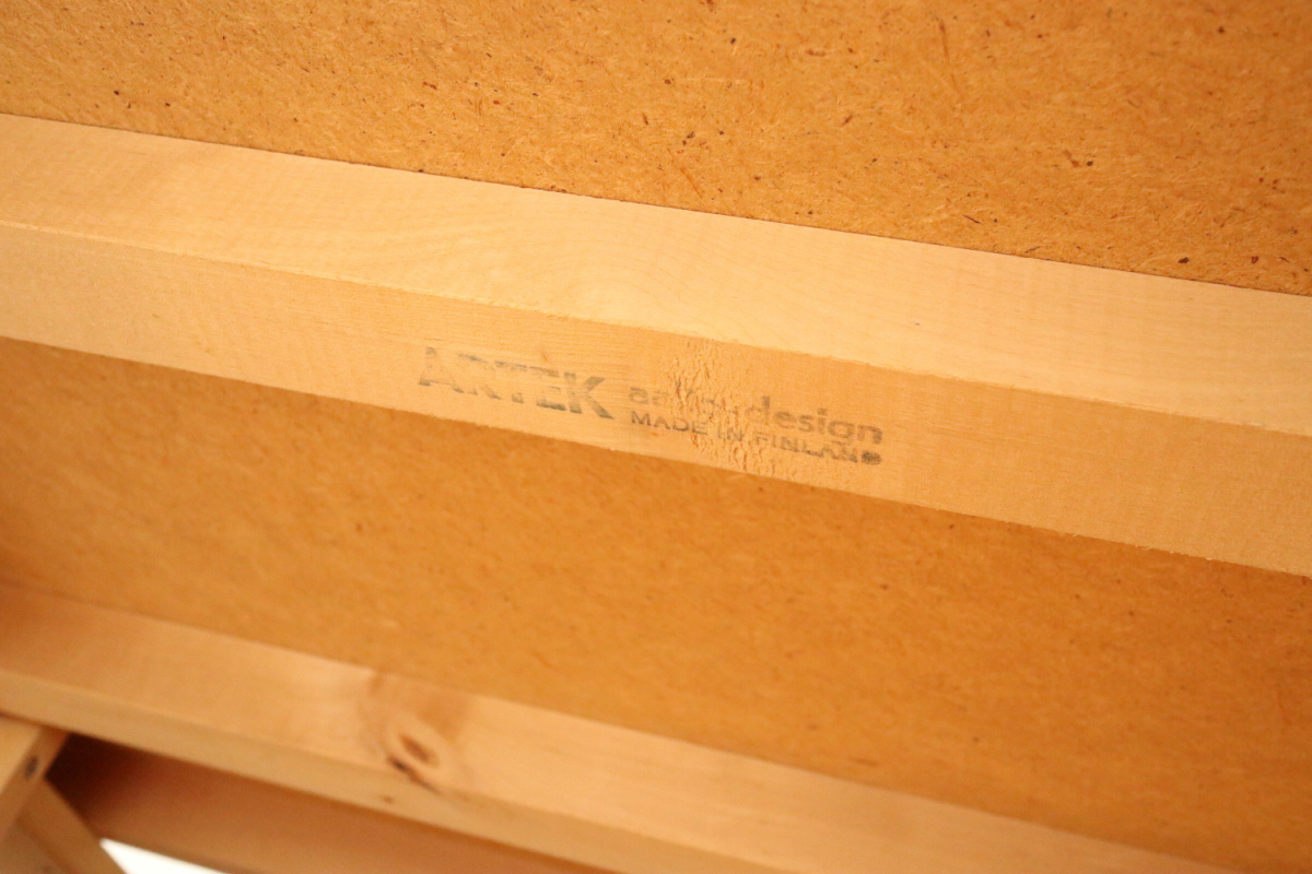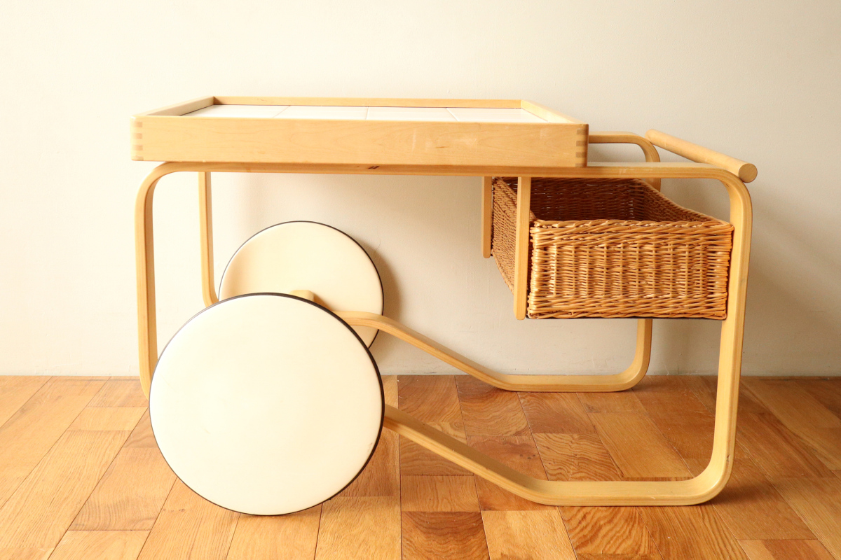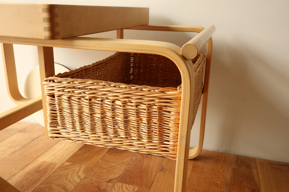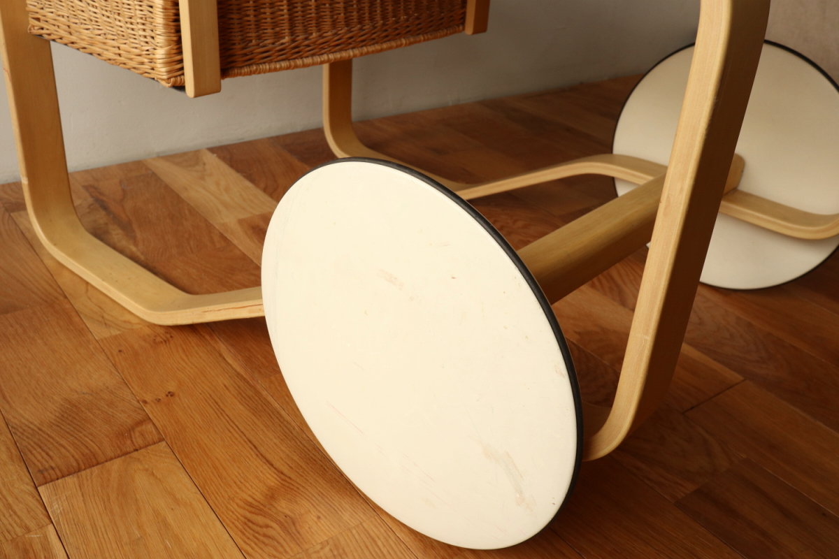 | アルヴァ・アアルトがデザインした名作 Tea Trolley 900。 その中でも、本品は1960年代製を示すオリジナルスタンプが明確に残る希少なヴィンテージ個体です。 ティートロリー900は、スツールやチェアに比べても当時のオリジナルが市場に出回る機会が非常に少なく、 とくにスタンプ付きの1960年代製となると、コレクターズピースとしての価値は年々高まっています。 タイル天板には、ヴィンテージならではの表面的なヘアラインクラックが見られますが、 構造的な割れはなく、使用に支障はありません。 長い年月を経た素材が生み出す表情として、オリジナルの魅力を損なわない範囲に収まっています。 籐製のバスケットは、張り・色艶ともに良好なコンディションを保っており、 実用はもちろん、空間のアクセントとしても美しい存在感を放ちます。 工業製品でありながら、木・籐・タイルという異素材を完璧なバランスでまとめ上げた一台。 現行品では決して再現できない、時代の空気を纏ったArtekの本質を感じていただけるティートロリーです。 |
