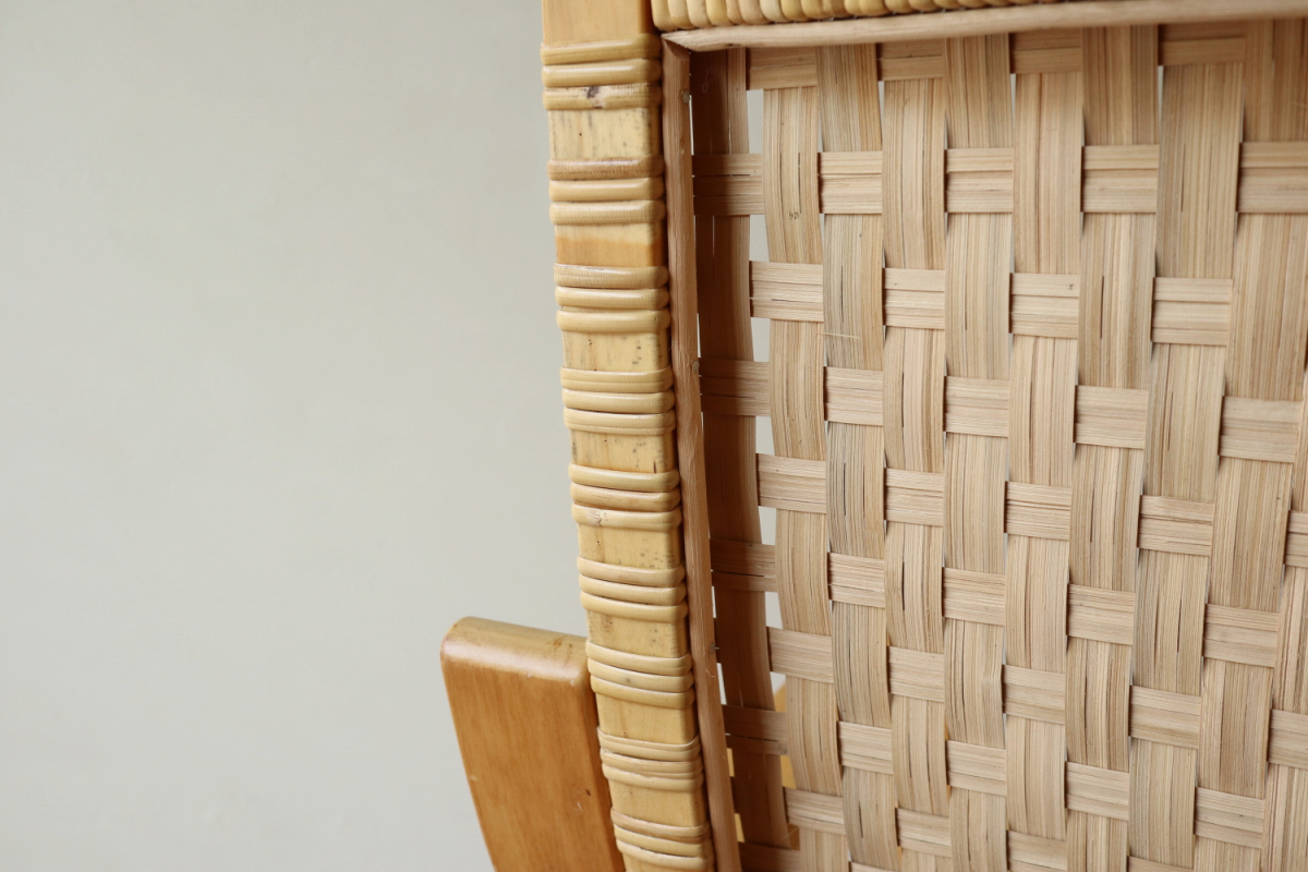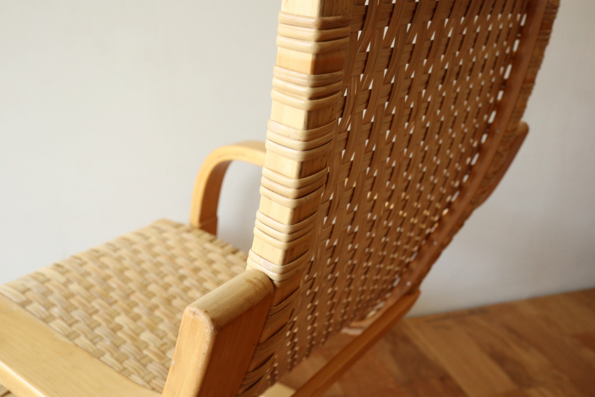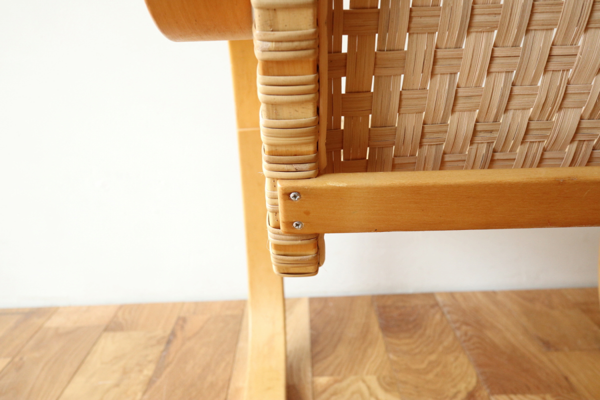 | 70-80年代のアームChair406です。 当店入荷後、新品の籐張に張り替えましたので将来的にも安心してお使いいただけます。 現行品よりも座面が低く、やや深く腰を掛ける感じになりますので、 よりリビングチェアとしての安楽性が良いかと思います。 現行品が約41cm、こちらは約36.5cmで、現行品とは全く別物の座り心地です。 夏はこのまま、冬はシープスキンなどを敷いてお使いいただいても良いです。 現在はウェービングテープ仕様しか生産しておらずましてや座面も高くなるので このスペックでの入手はなかなか難しいアイテムです。 |