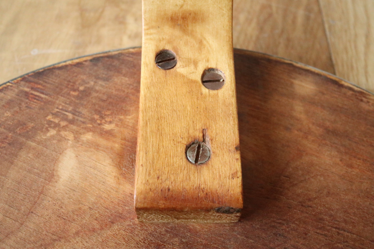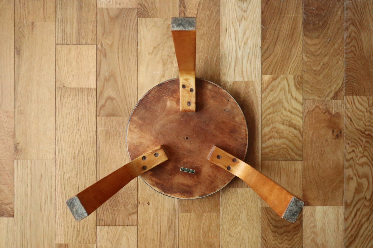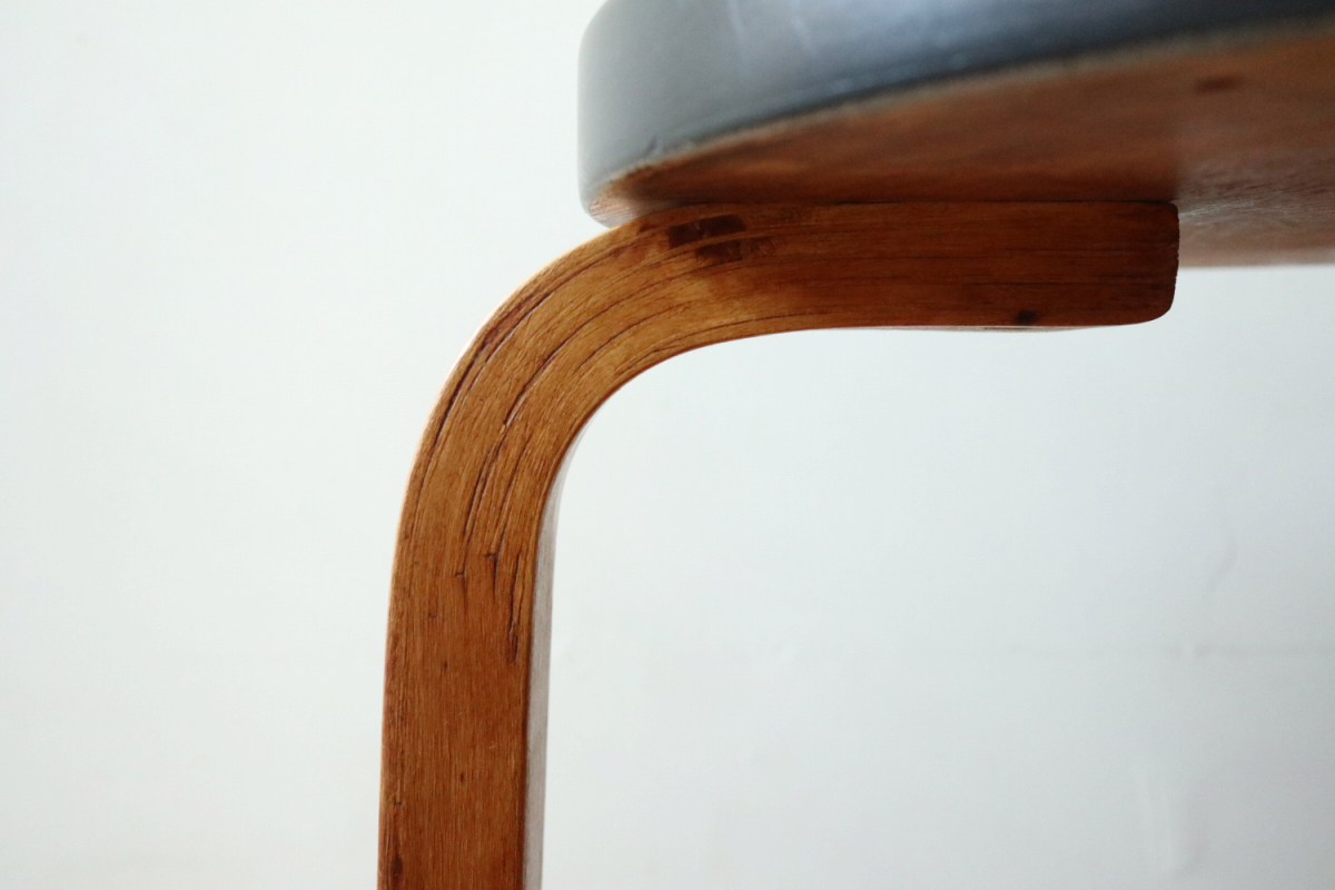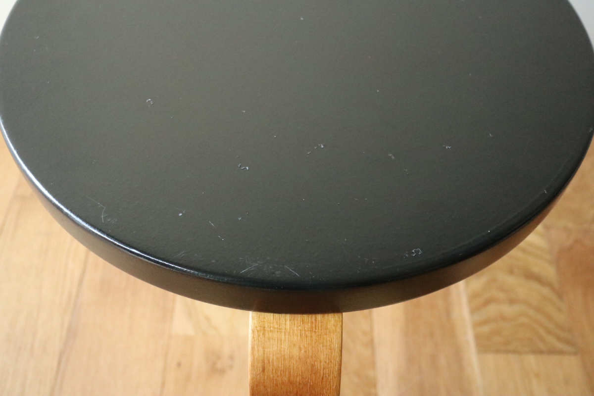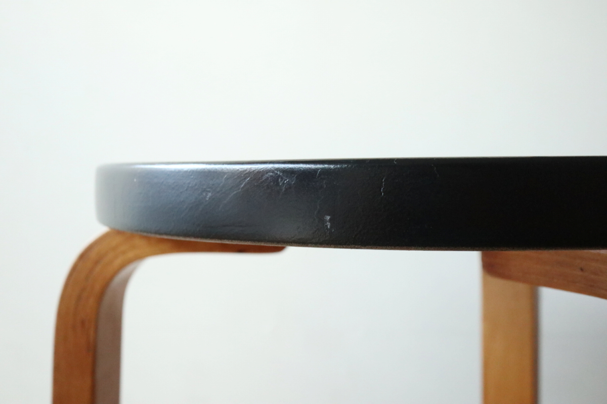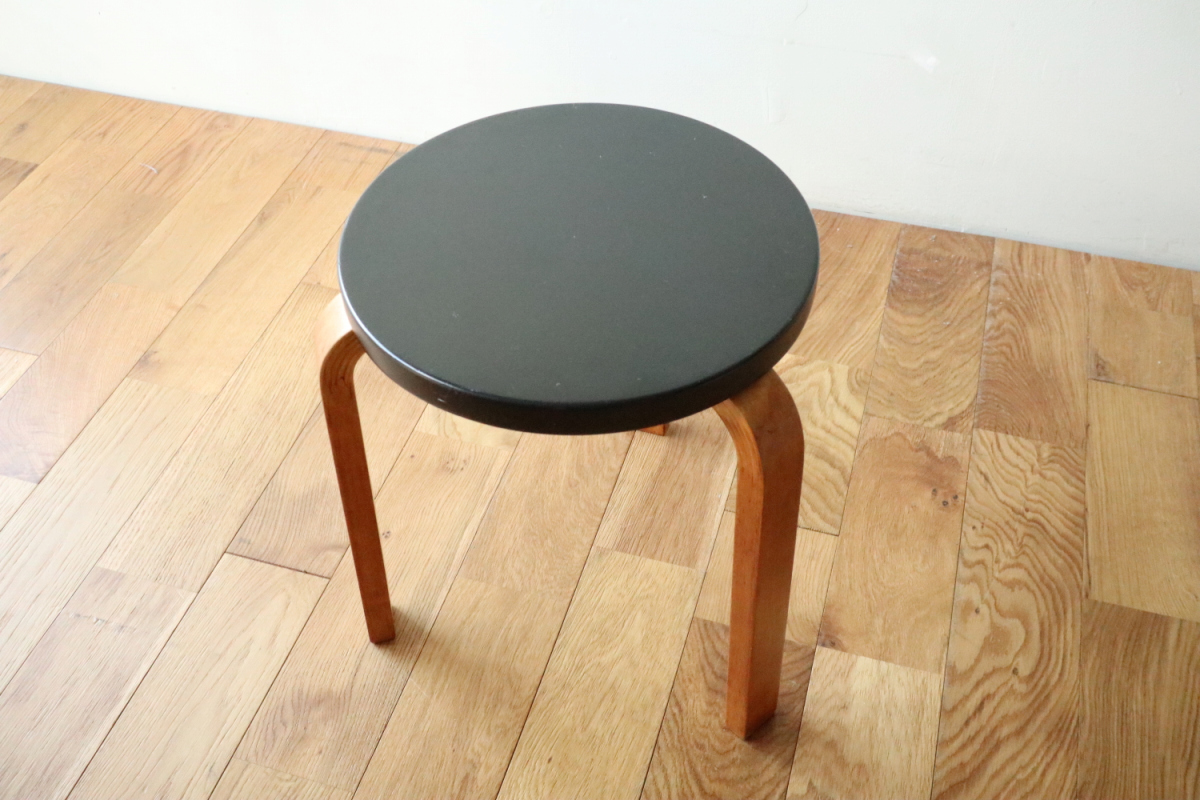 | これぞ30年代というルックスと雰囲気ののStool60です。 脚の部分はイエローバーチ呼ばれる。小麦色にやけた木肌、薄く痩せて木肌になじんだ塗装 ところどころにある傷と汚れ、どれをとっても数十年かけた経年変化によるエイジングです。 座面は黒で塗装されておりますが、質感といい、艶の具合といい、ヴィンテージの雰囲気があります。 Finmarラベルも綺麗に残っており、今後ますます入手が難しくなると思います。 |