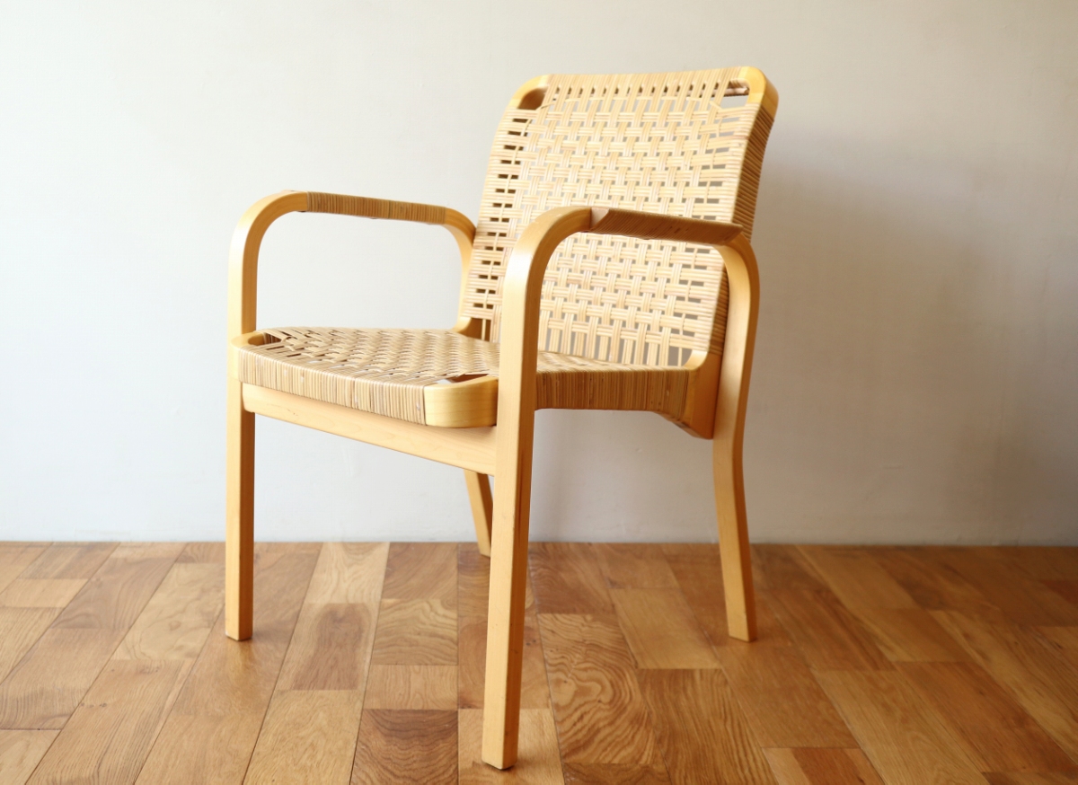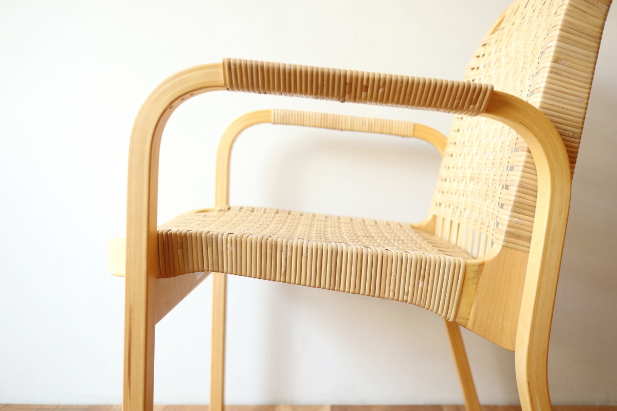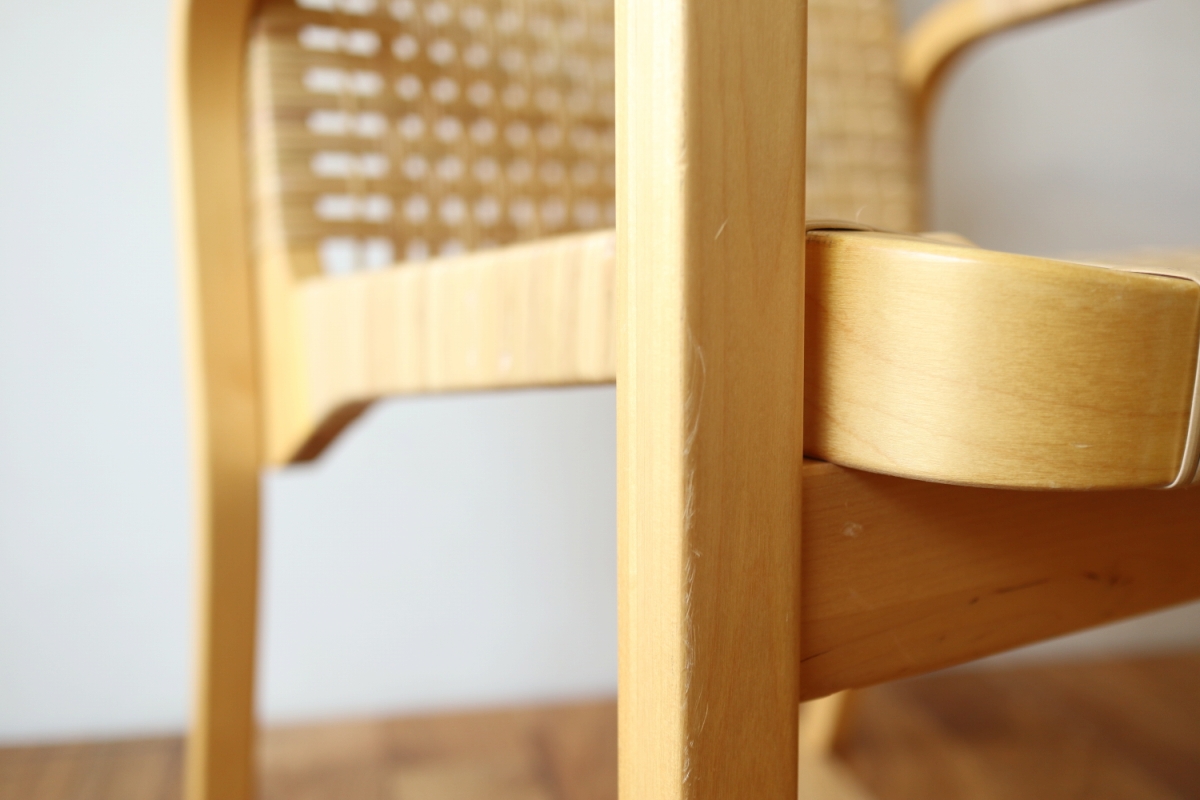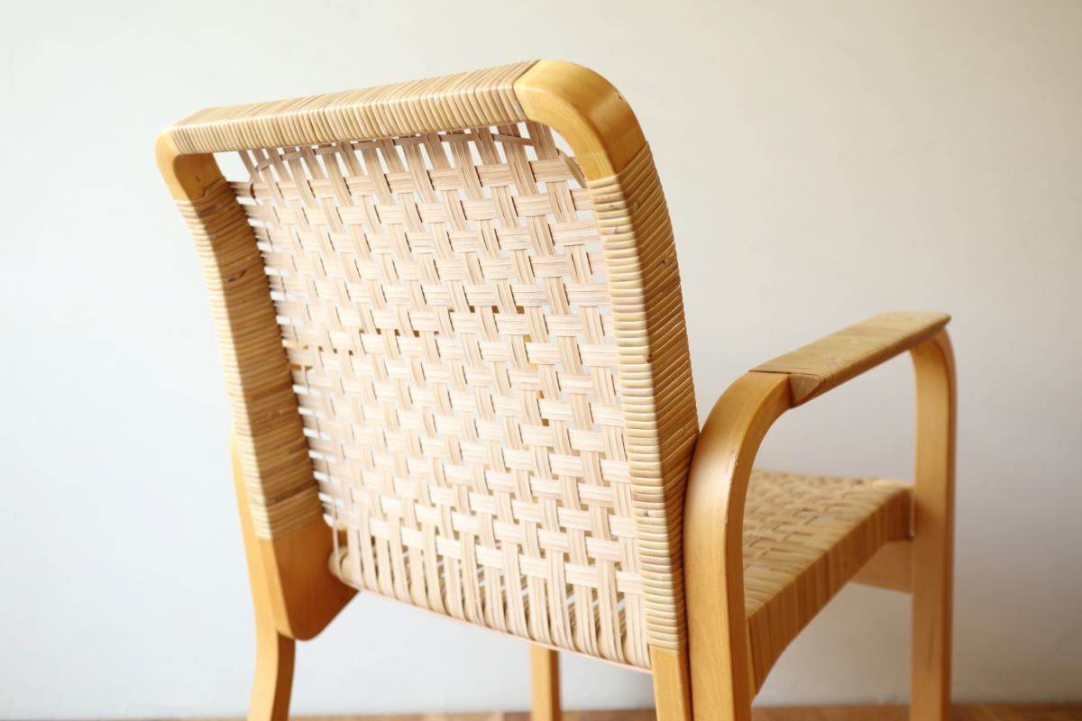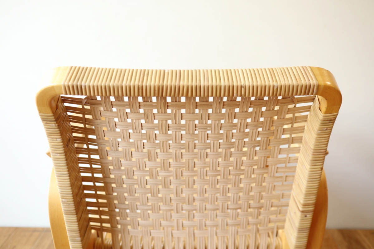 | ArtekのChair45です。80年代ごろのヴィンテージ。 Chair45は現在は廃番となっておりますが、ウェービングテープ仕様で定価20万円以上していた高級ラインのチェアです。 当店入荷後、籐張にしております。アーム部の籐も張り替えております。 適度な張りとしなやかさがあり非常に座り心地が良くしあがっております。 耐久性もあり、長くお使いいただけます。 |
