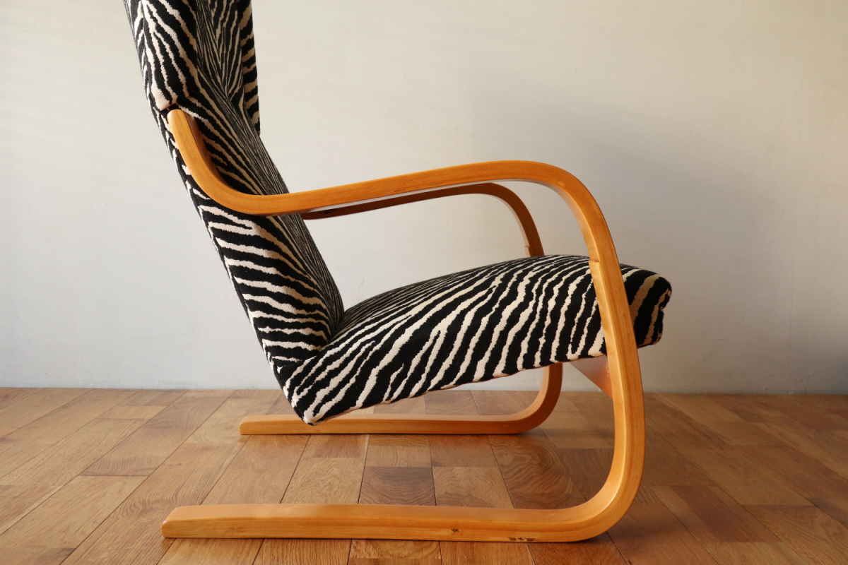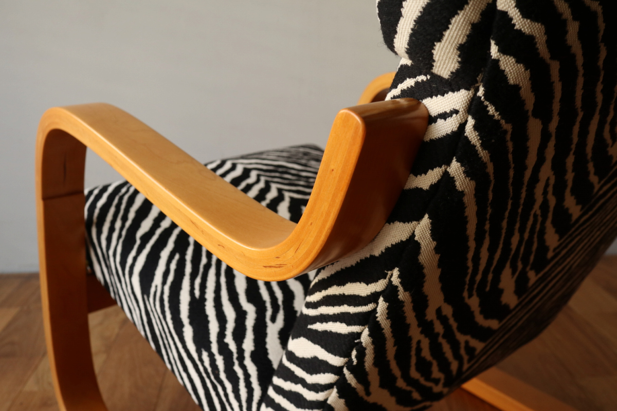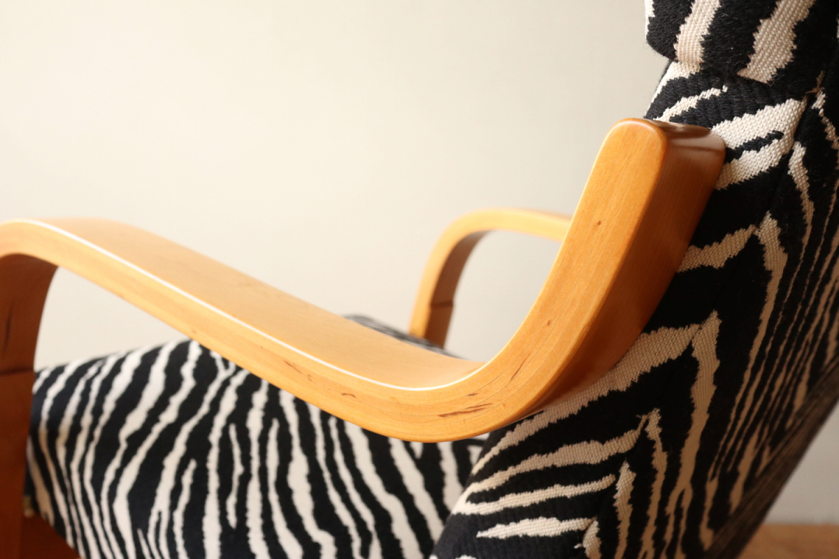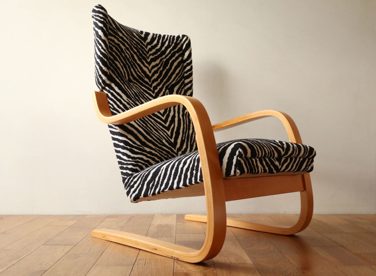 | アルテックのラウンジチェアの中でロングセラーの一つ、Arm Cahir 401です。 1933年にデザインされた最古参の一つで現在も生産が続くロングセラーアイテム。 現行品は座面の角度がかなり浅くなりリクライニングチェアというよりもリーディングチェアのような座り心地ですが グラビアなどでみる初期のものは深くのけぞるように座るデザインとなっています。 しかし残念ながらひずみが発生したりねじれたりするものが多いです。 こちらはそれらの歪みがほぼなく大変健康的なヴィンテージコンディションになります。 本来アアルトがデザインしたのはこんな椅子だったのかと実感できると思います。 ファブリックはアイノのゼブラ。フレームは塗装も含めてフルメンテナンスを行いました。 またこの年代はシートとフレームを金具で固定されておりますが その金具もあたらに製作いたしましたので将来的にも安心してお使いいただけます。 30-40年代のスタンプも残っており、実用できるコレクションとして大変おすすめの1台です。 |