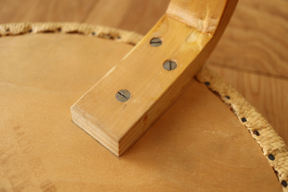 | オリジナルペーパーファブリックの一台です。 保存状態がよく、ペーパーファブリックもきれいなコンディションで残っております。 釘の穴はすべてオリジナルで張り替えられた形跡はございません。 座面裏には40-50年代のスタンプが残っておりコレクションとしてもおすすめです。 |