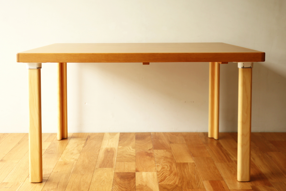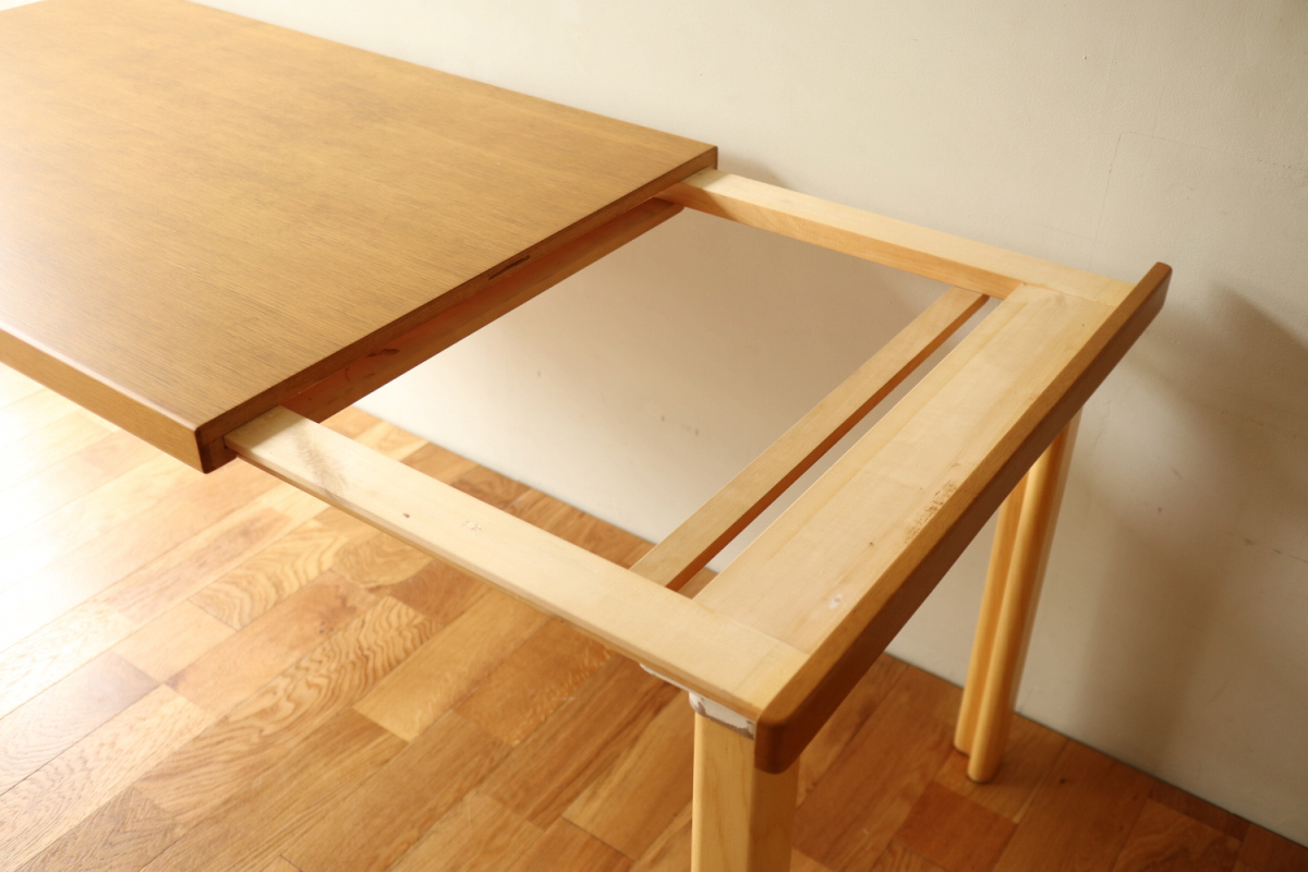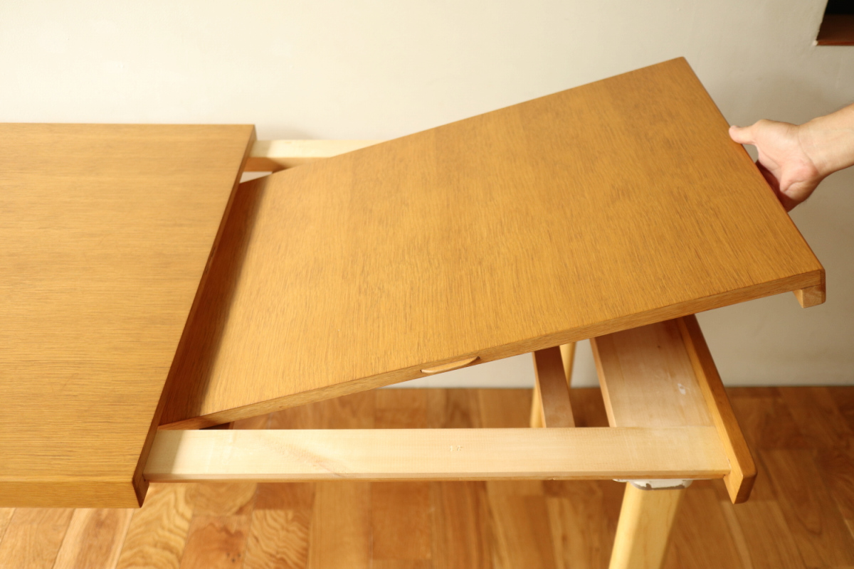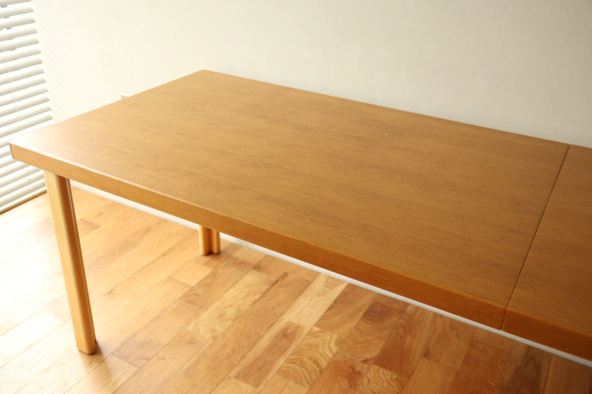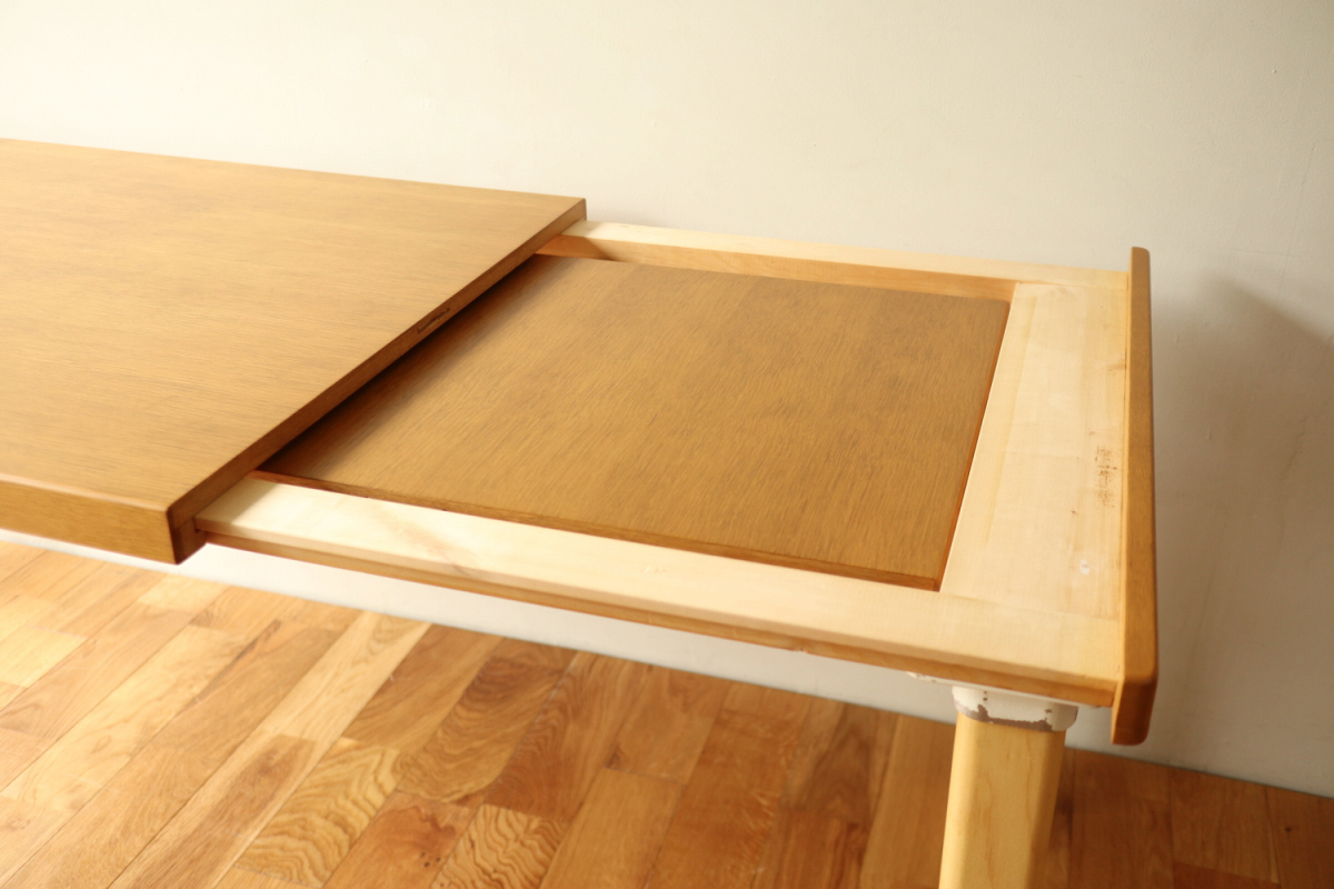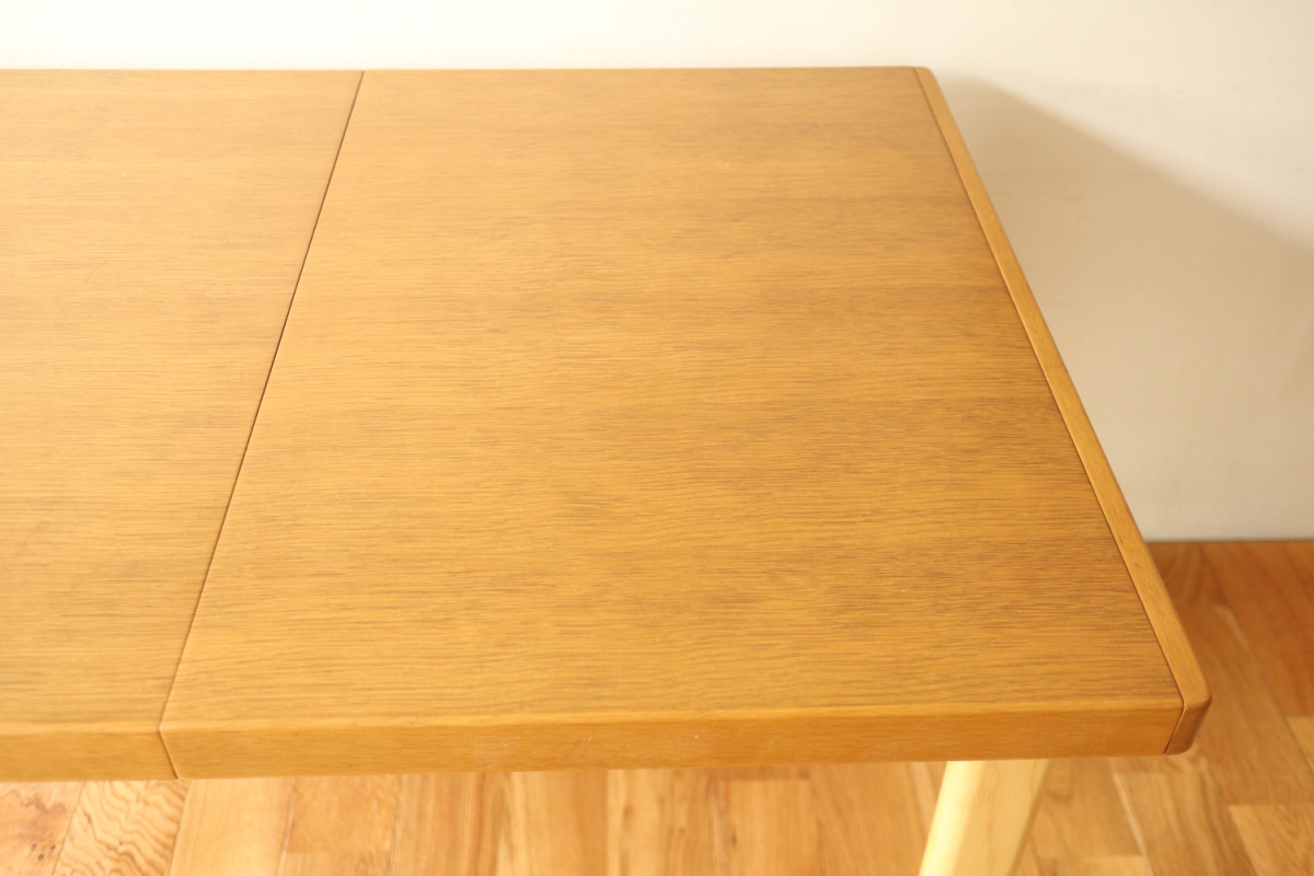 | ArtekのエクステンションテーブルH95です。 トップはオーク、脚はHL-2 legでバーチです。 以前にHL-1 legが取りつけられていたようですが、現在はもともとのHL-2になっております。 幅55cmの拡張板拡張が収納されており、拡張すればすれば180x80サイズの大型テーブルになります。 HL-2ですのでずっしりと安定感もあります。 トップの塗装はやり直しましたのできれいなコンディションで気持ちよくお使いいただけると思います。 エクステンションといえば2枚の拡張版が付いた93が有名ですが、 こちらのH95は数が少なく希少なうえ、このコンディションのものはなかなか出会えないと思います。 |