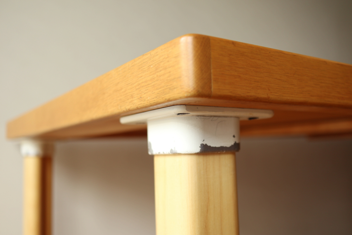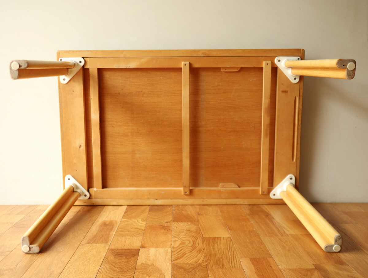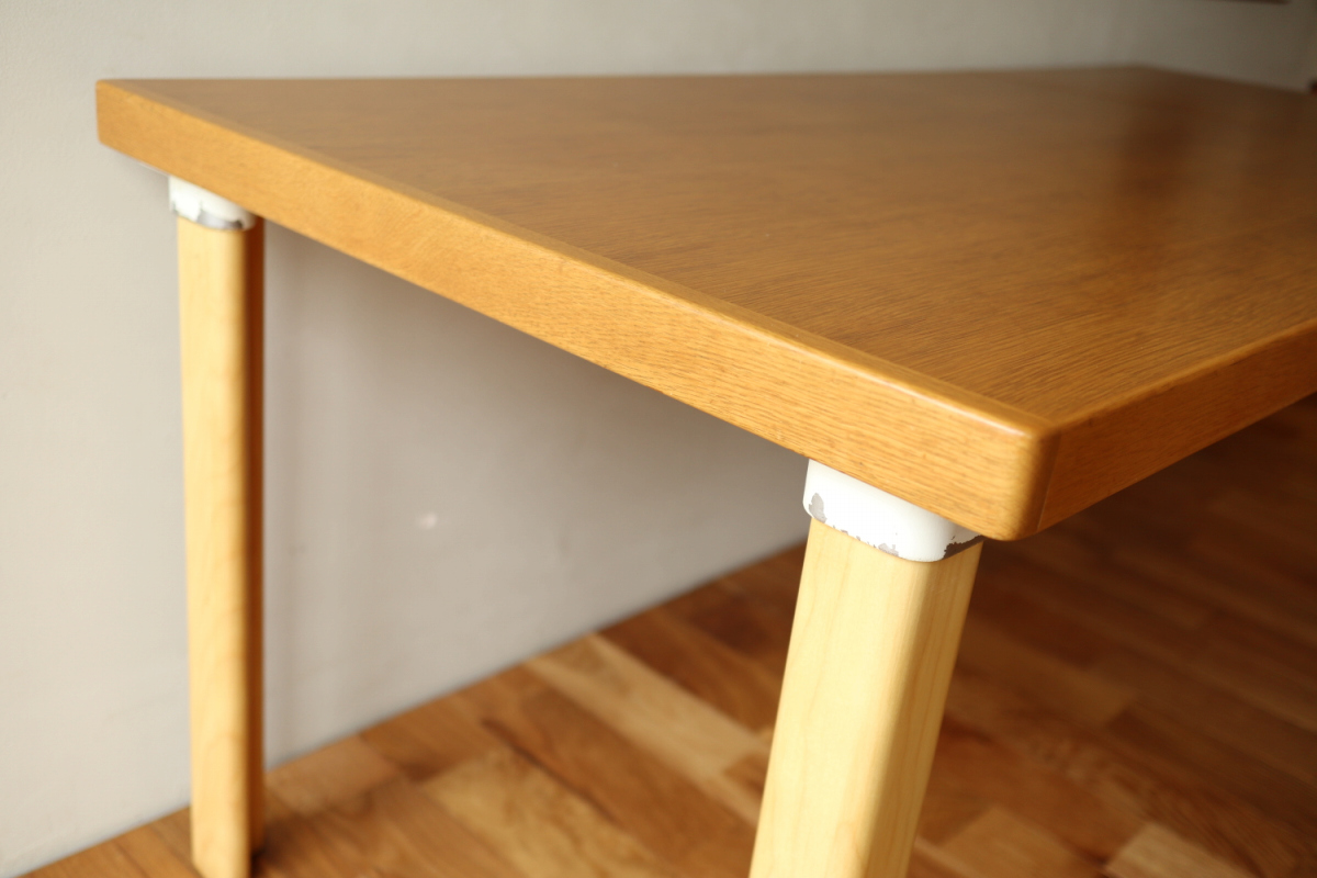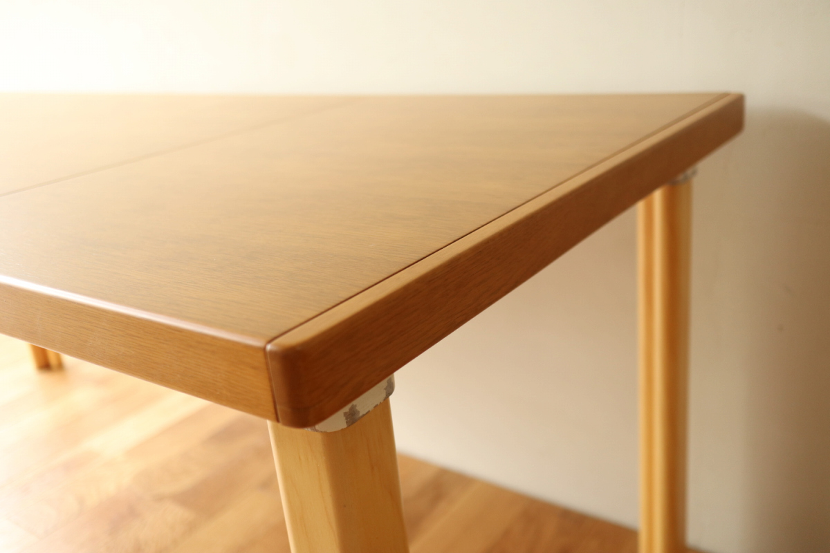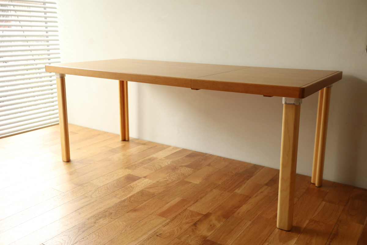 | ArtekのエクステンションテーブルH95です。 トップはオーク、脚はHL-2 legでバーチです。 以前にHL-1 legが取りつけられていたようですが、現在はもともとのHL-2になっております。 幅55cmの拡張板拡張が収納されており、拡張すればすれば180x80サイズの大型テーブルになります。 HL-2ですのでずっしりと安定感もあります。 トップの塗装はやり直しましたのできれいなコンディションで気持ちよくお使いいただけると思います。 エクステンションといえば2枚の拡張版が付いた93が有名ですが、 こちらのH95は数が少なく希少なうえ、このコンディションのものはなかなか出会えないと思います。 |