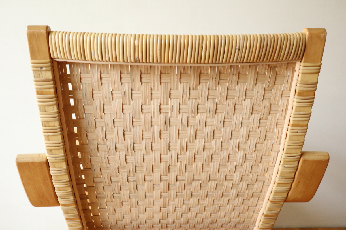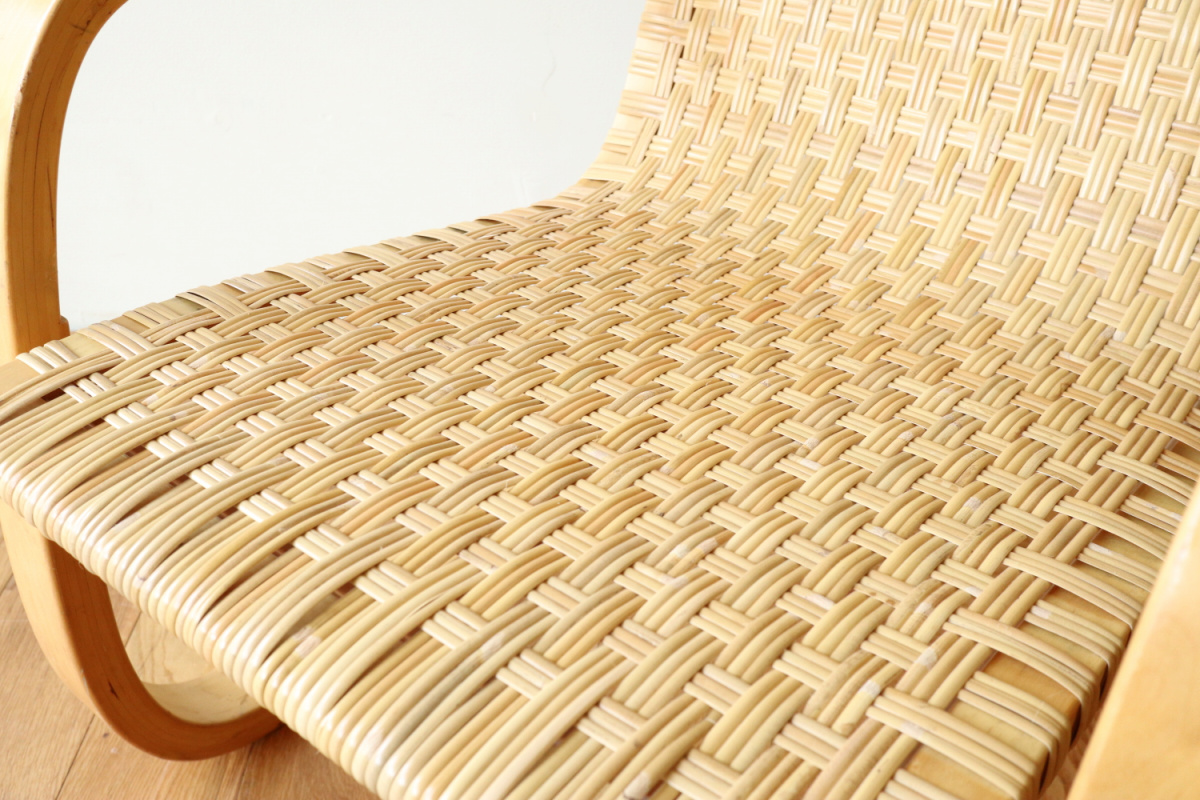 | 70-80年代のアームChair406です。 当店入荷後、新品の籐張に張り替えましたので将来的にも安心してお使いいただけます。 現行品よりも座面が低く、やや深く腰を掛ける感じになりますので、 よりリビングチェアとしての安楽性が良いかと思います。 現行品が約41cm、こちらは約36.5cmで、現行品とは全く別物の座り心地です。 夏はこのまま、冬はシープスキンなどを敷いてお使いいただいても良いです。 現在はウェービングテープ仕様しか生産しておらずましてや座面も高くなるので このスペックでの入手はなかなか難しいアイテムです。 |