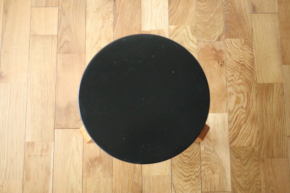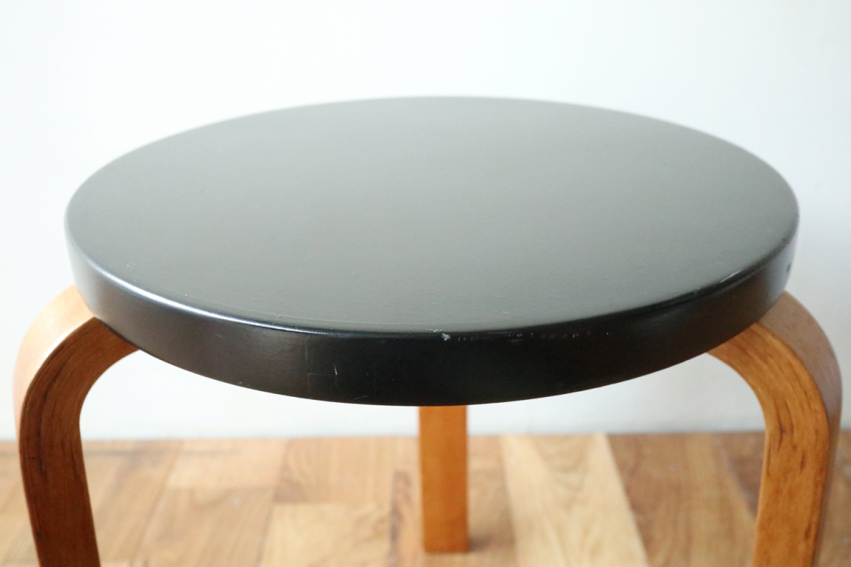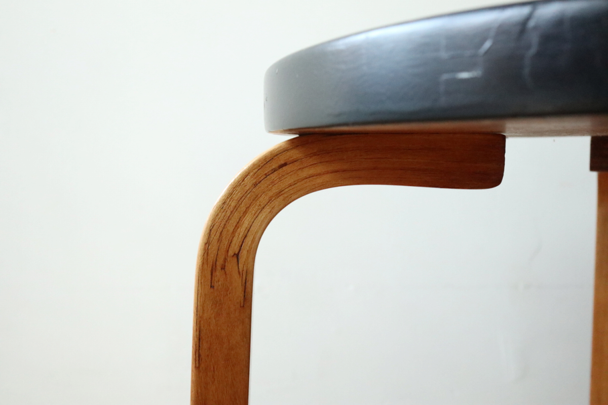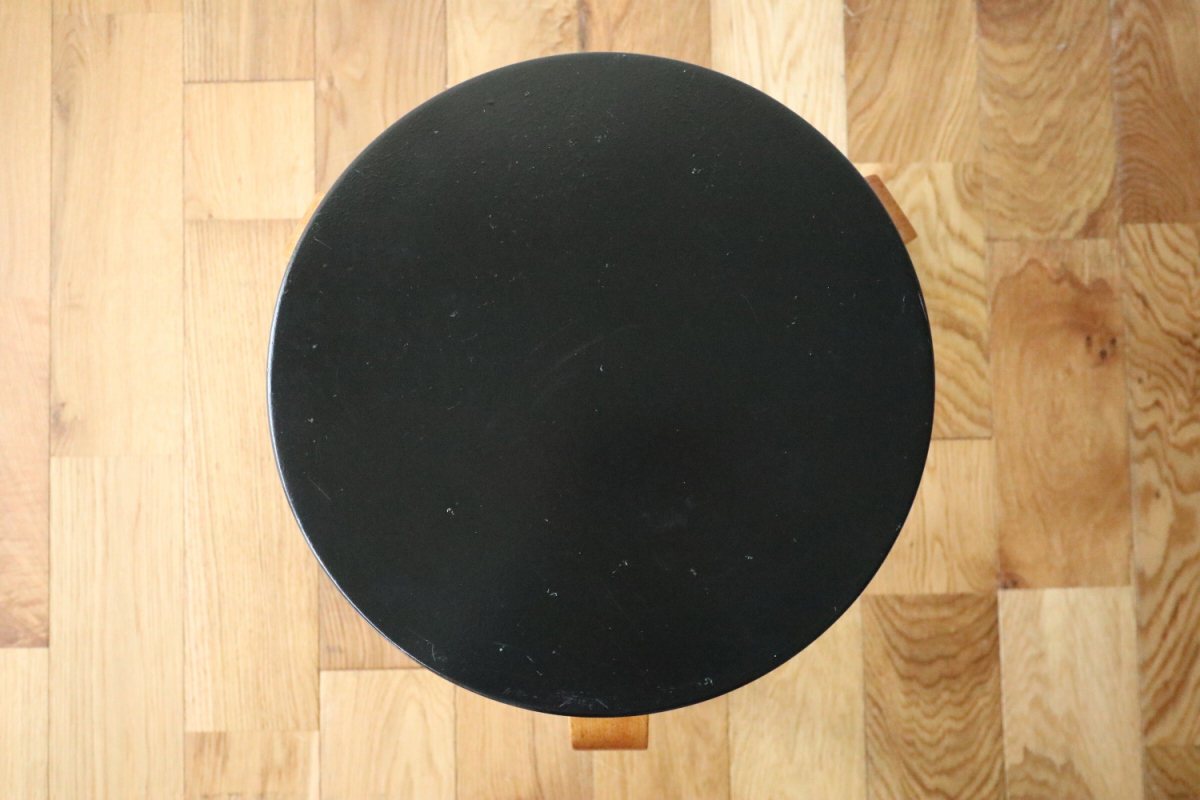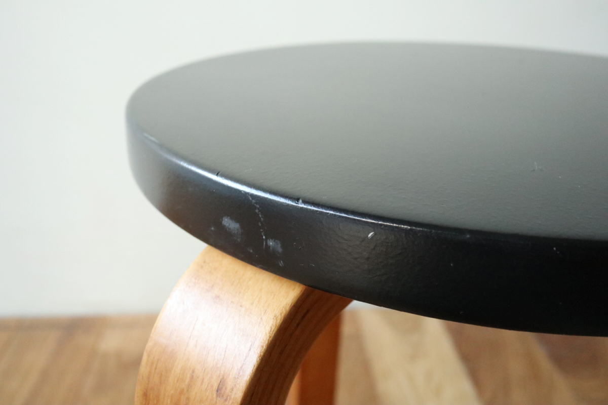 | これぞ30年代というルックスと雰囲気ののStool60です。 脚の部分はイエローバーチ呼ばれる。小麦色にやけた木肌、薄く痩せて木肌になじんだ塗装 ところどころにある傷と汚れ、どれをとっても数十年かけた経年変化によるエイジングです。 座面は黒で塗装されておりますが、質感といい、艶の具合といい、ヴィンテージの雰囲気があります。 Finmarラベルも綺麗に残っており、今後ますます入手が難しくなると思います。 |