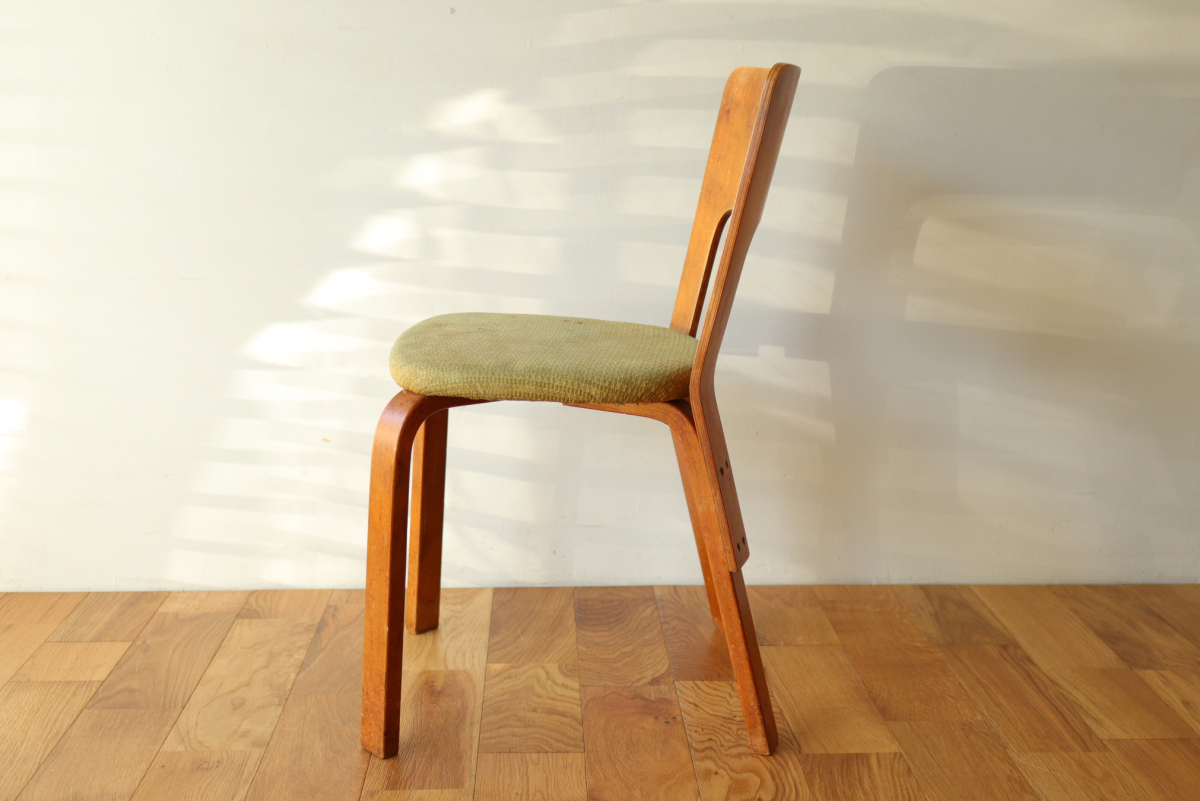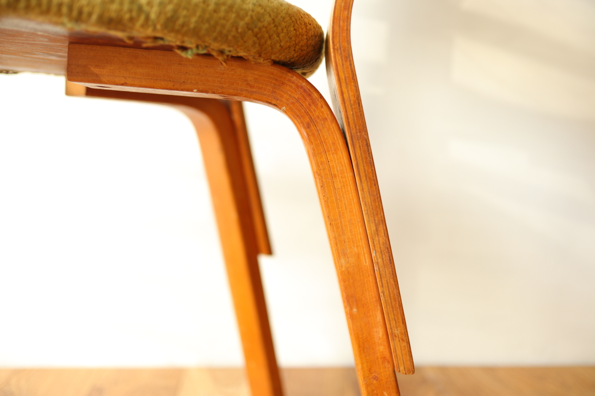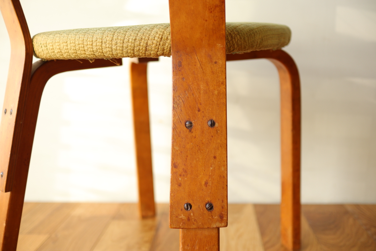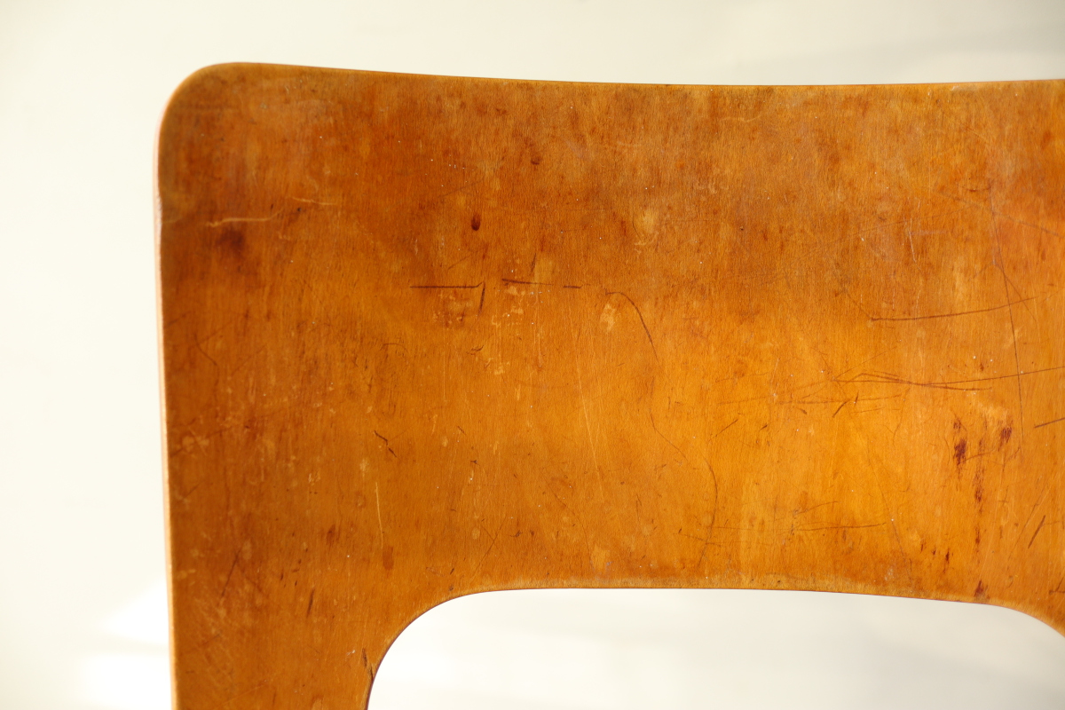| 1940年、アアルトはアメリカでの販路拡大のためアルテック・パスコを立ち上げました。 当時のタイムズ紙に掲載された記事によると、 デザイン面ではアルテック社のデザインを踏襲したうえでマイナーチェンジを行い、 アメリカのウィスコンシン州で生産しニューヨークで組み立てて販売ということをしていたようです。 メイドインUSAのアルテックということになります。 こちらはChair66の背もたれとChair69の座面をもつハイブリッドチェアです。 背もたれの合板は同年代のフィンランド製に比べて少し厚みがあり安定感があります。 一方、脚はスリムになっており、幅、厚みは若干小さいです。 こちらは座面裏にパスコのスタンプが残っております。 アアルト作品をコレクションする上で、40年代を埋める大変重要で貴重なワンピースだと思います。 |