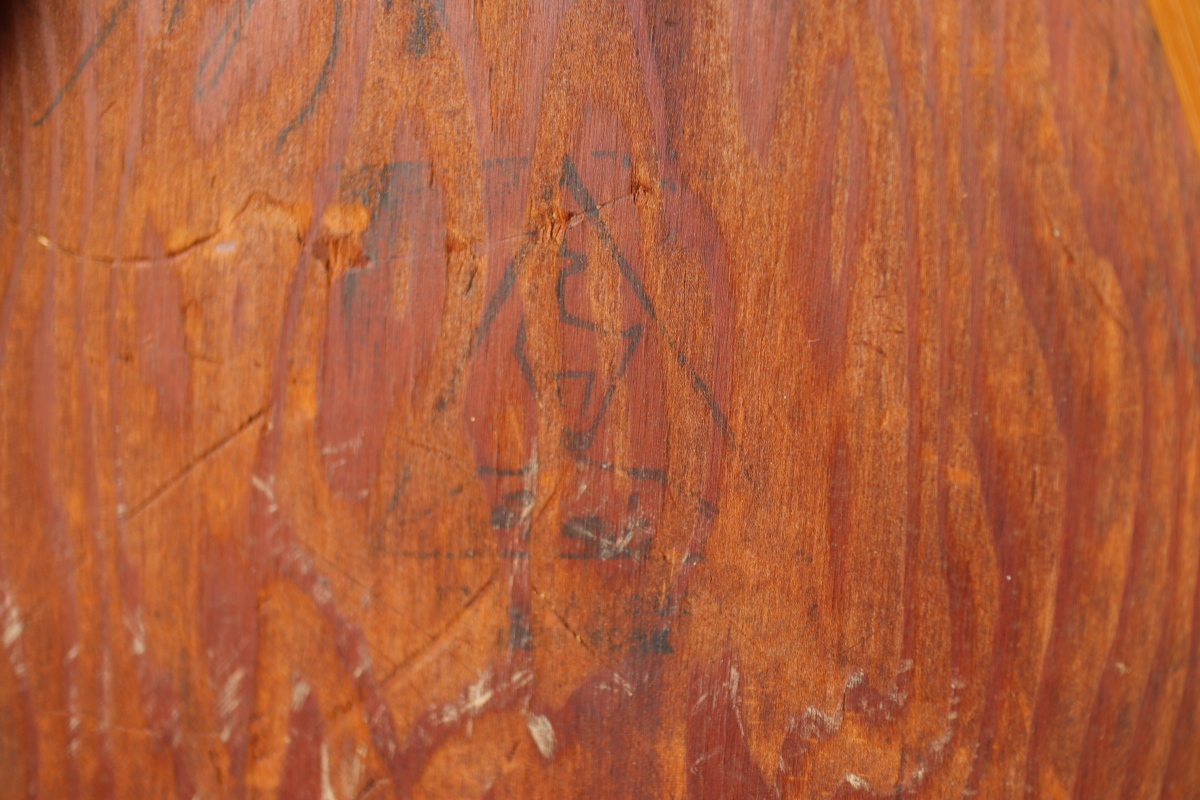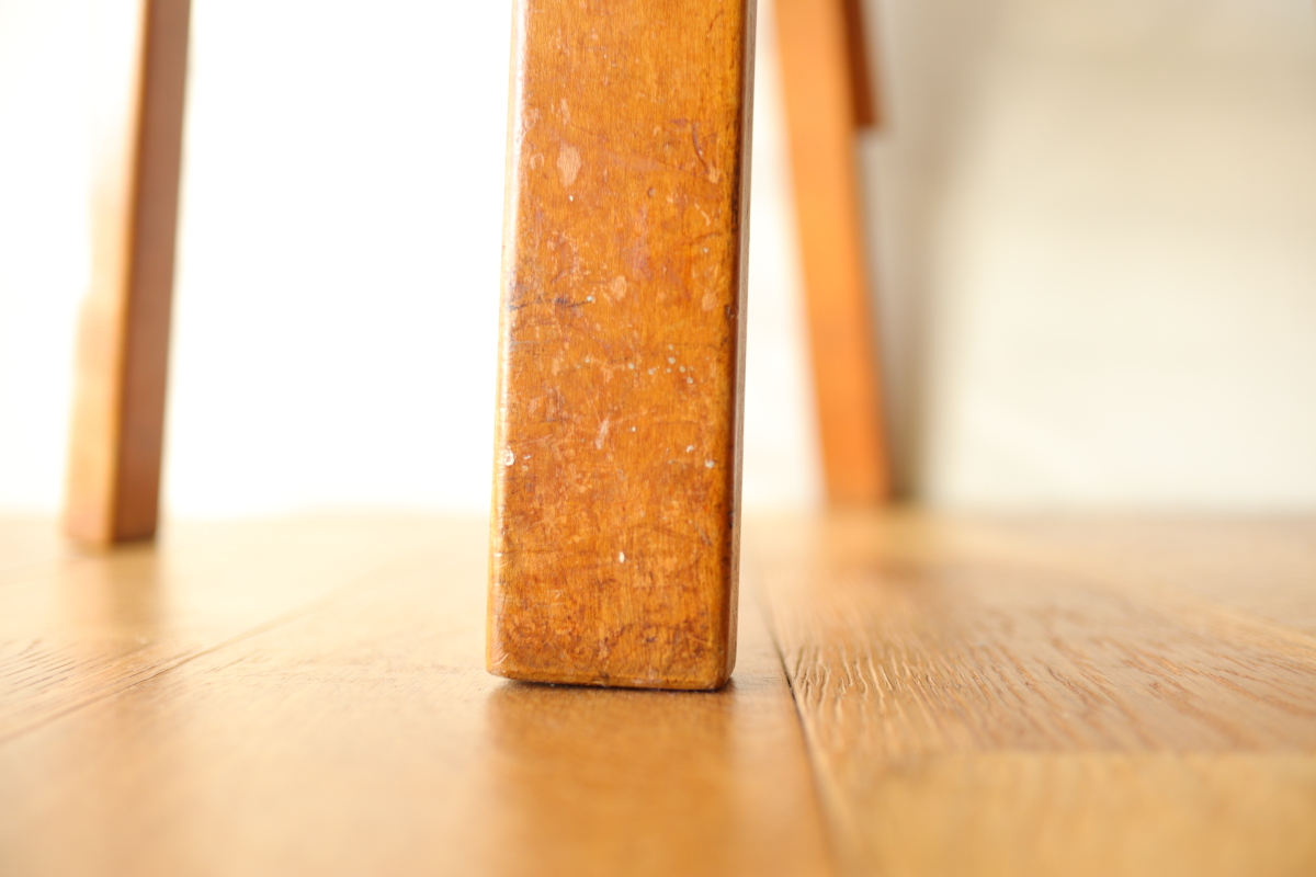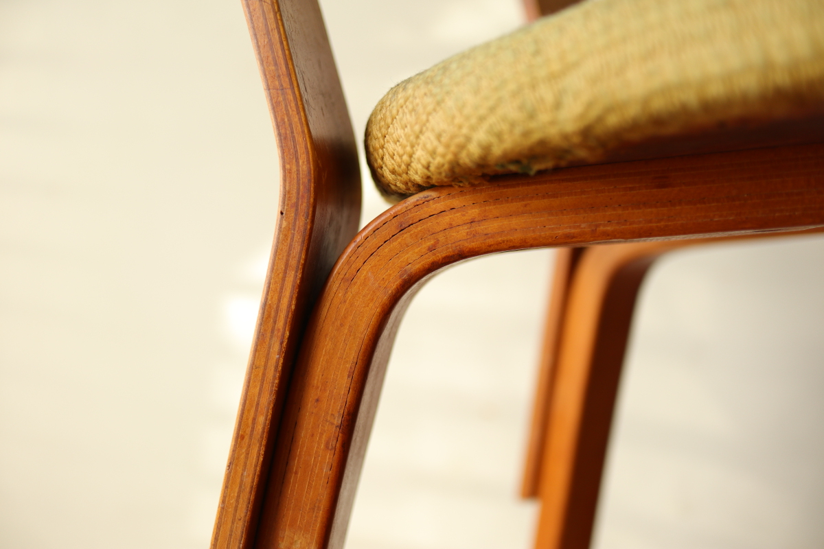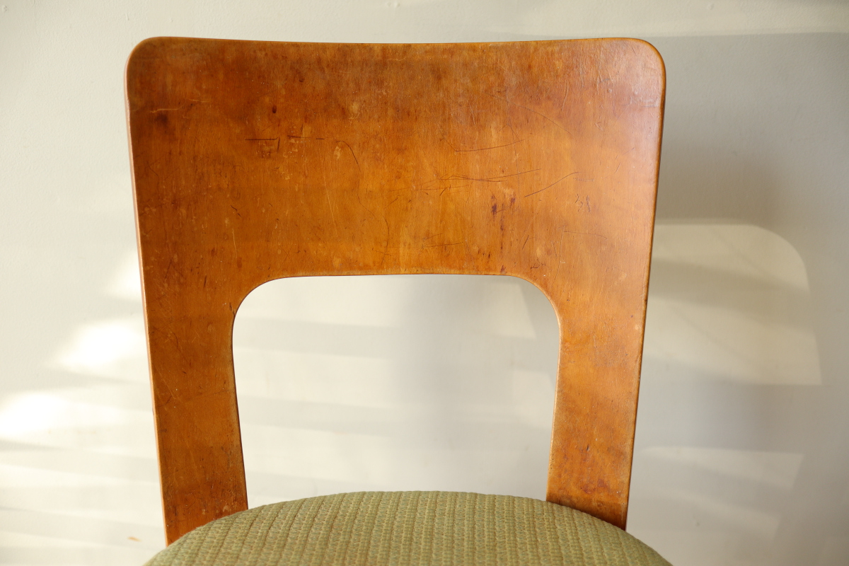 | 1940年、アアルトはアメリカでの販路拡大のためアルテック・パスコを立ち上げました。 当時のタイムズ紙に掲載された記事によると、 デザイン面ではアルテック社のデザインを踏襲したうえでマイナーチェンジを行い、 アメリカのウィスコンシン州で生産しニューヨークで組み立てて販売ということをしていたようです。 メイドインUSAのアルテックということになります。 こちらはChair66の背もたれとChair69の座面をもつハイブリッドチェアです。 背もたれの合板は同年代のフィンランド製に比べて少し厚みがあり安定感があります。 一方、脚はスリムになっており、幅、厚みは若干小さいです。 こちらは座面裏にパスコのスタンプが残っております。 アアルト作品をコレクションする上で、40年代を埋める大変重要で貴重なワンピースだと思います。 |