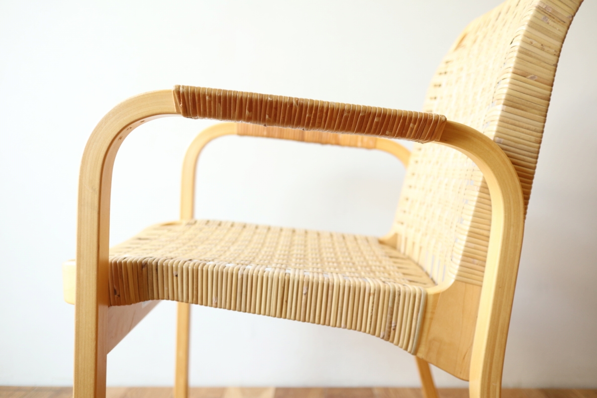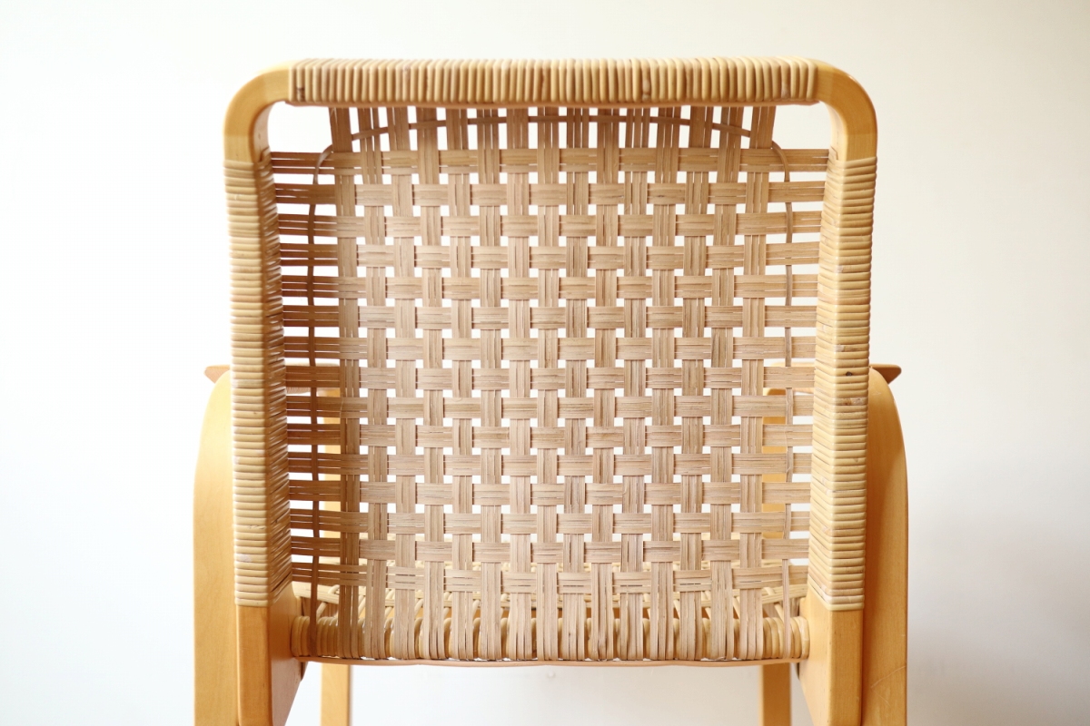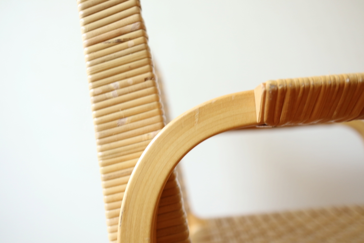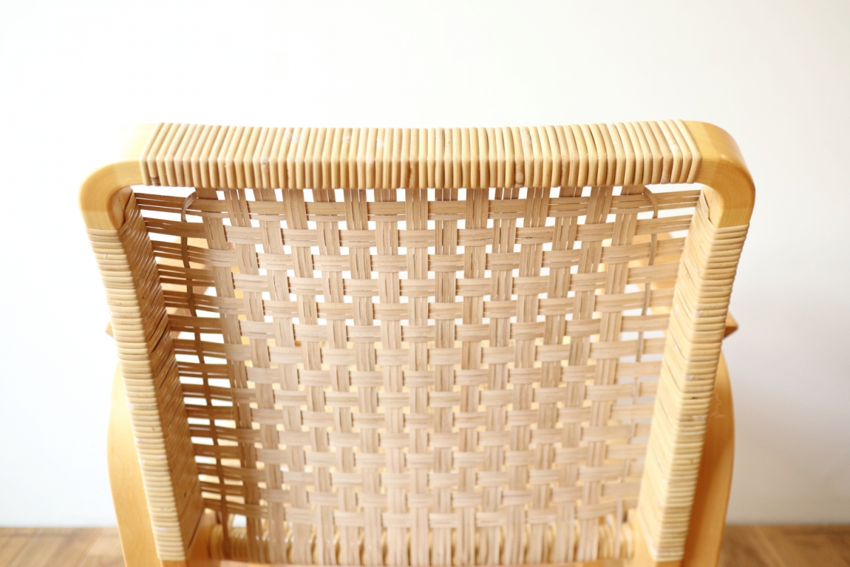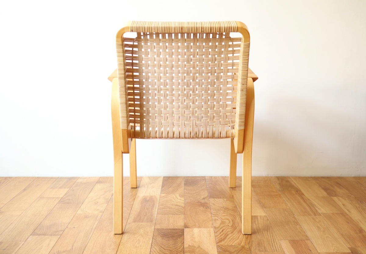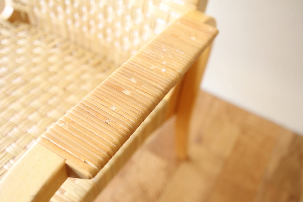 | ArtekのChair45です。80年代ごろのヴィンテージ。 Chair45は現在は廃番となっておりますが、ウェービングテープ仕様で定価20万円以上していた高級ラインのチェアです。 当店入荷後、籐張にしております。アーム部の籐はオリジナルのまま残しております。。 適度な張りとしなやかさがあり非常に座り心地が良くしあがっております。 耐久性もあり、長くお使いいただけます。 |