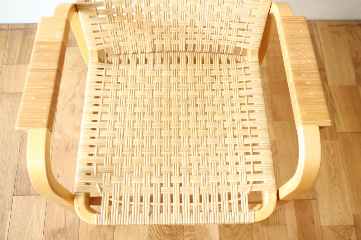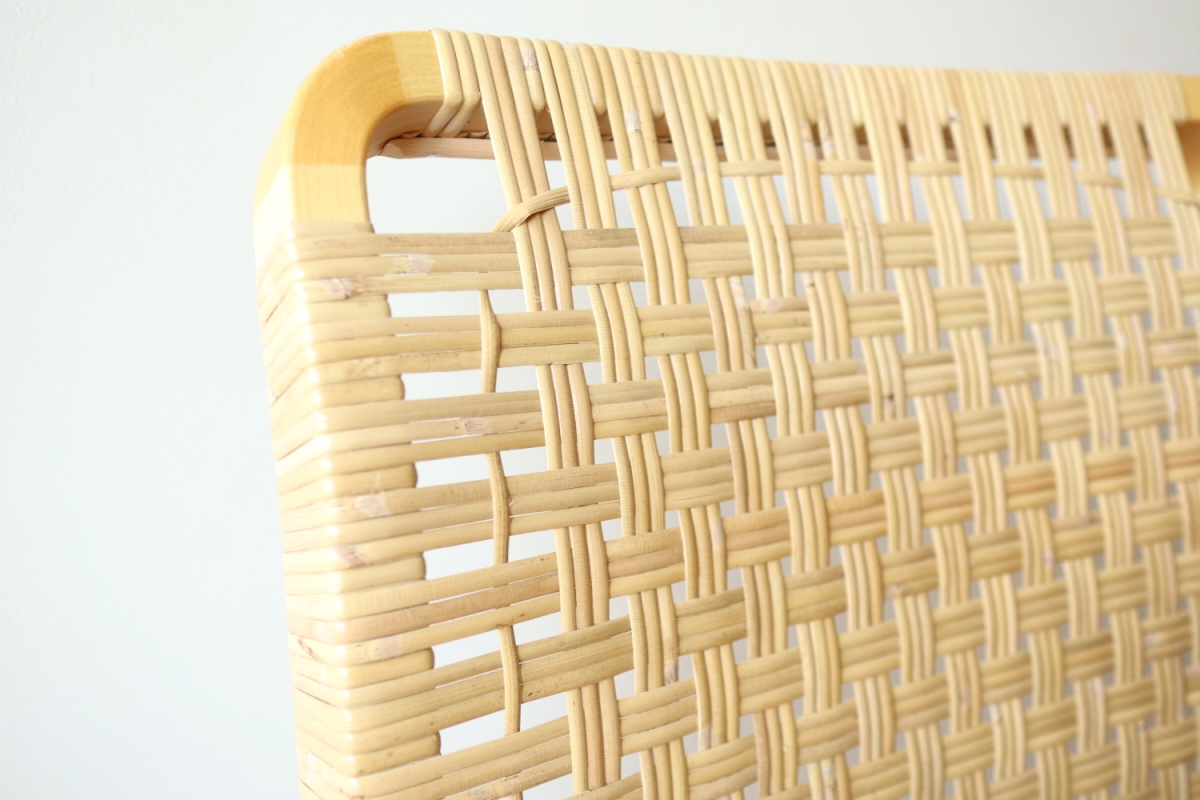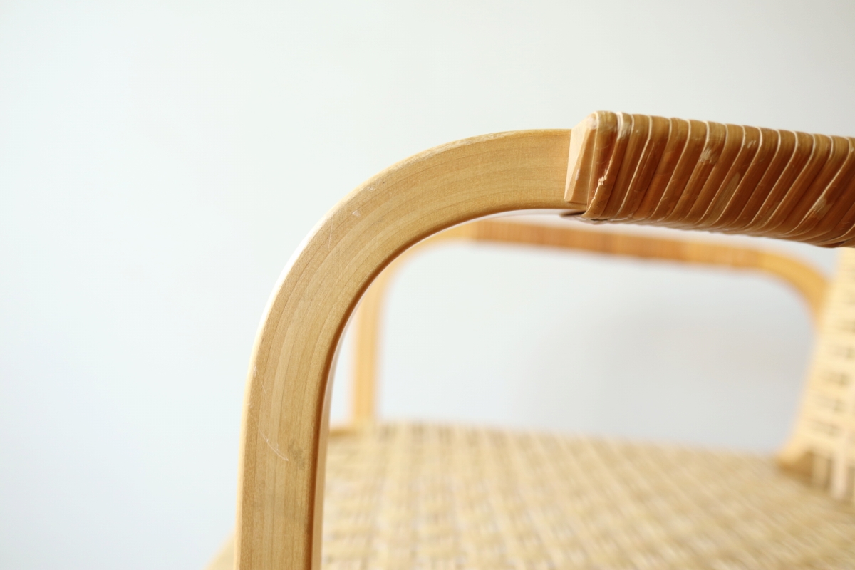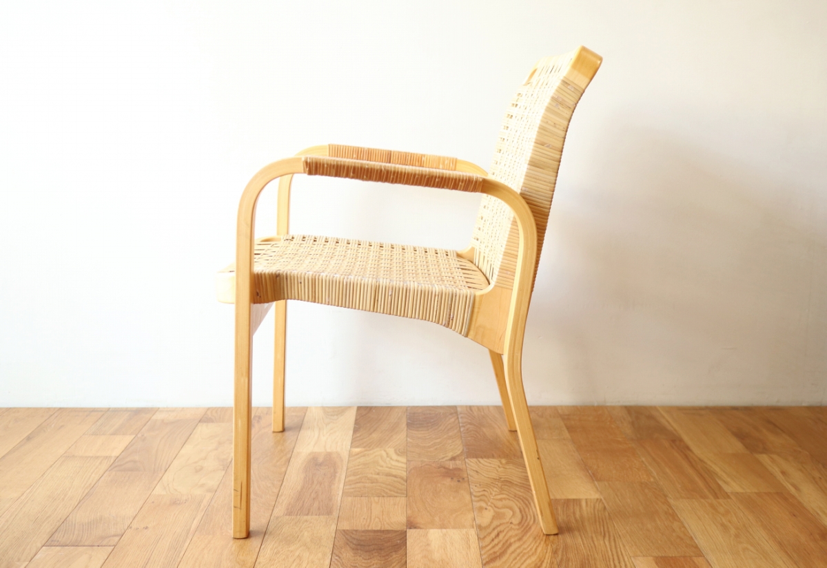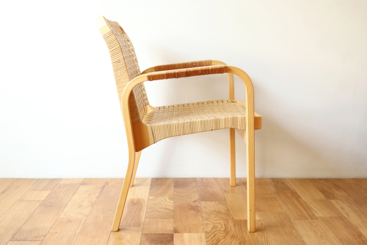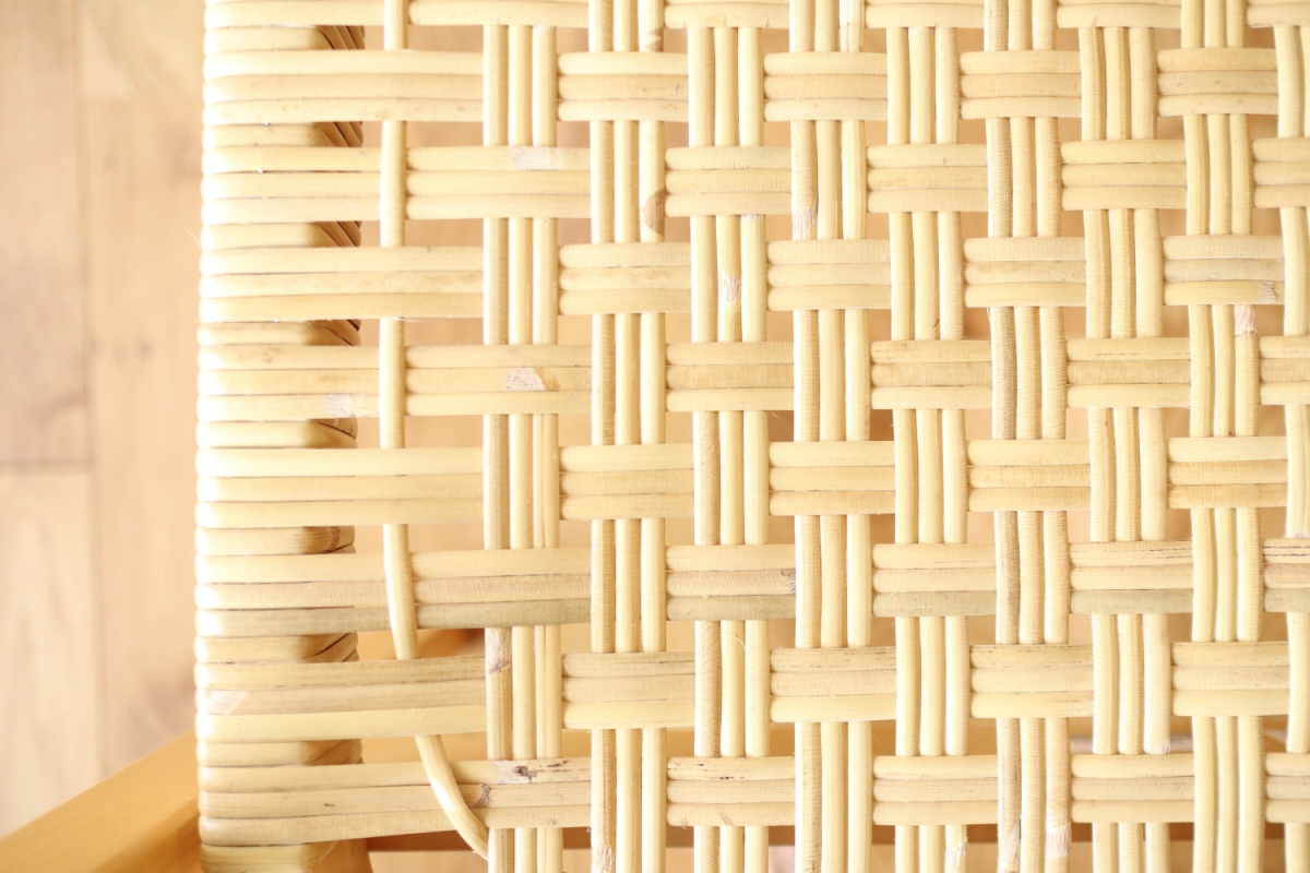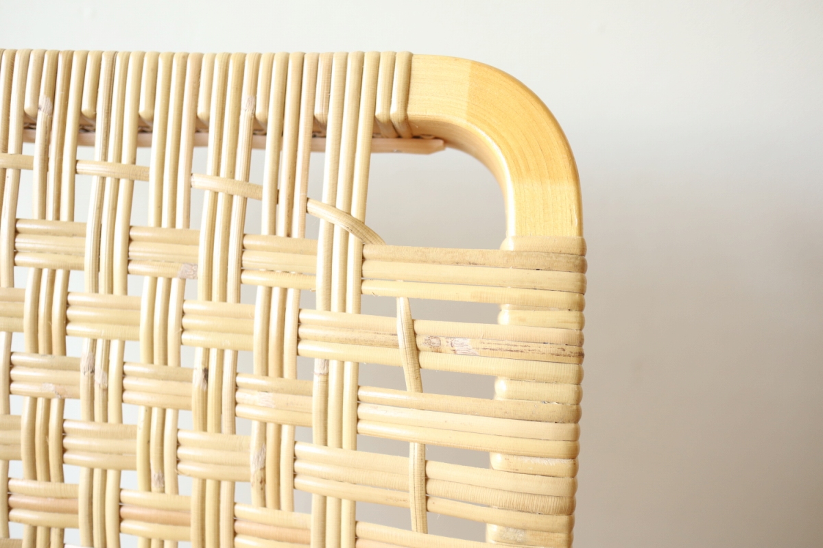 | ArtekのChair45です。80年代ごろのヴィンテージ。 Chair45は現在は廃番となっておりますが、ウェービングテープ仕様で定価20万円以上していた高級ラインのチェアです。 当店入荷後、籐張にしております。アーム部の籐はオリジナルのまま残しております。。 適度な張りとしなやかさがあり非常に座り心地が良くしあがっております。 耐久性もあり、長くお使いいただけます。 |