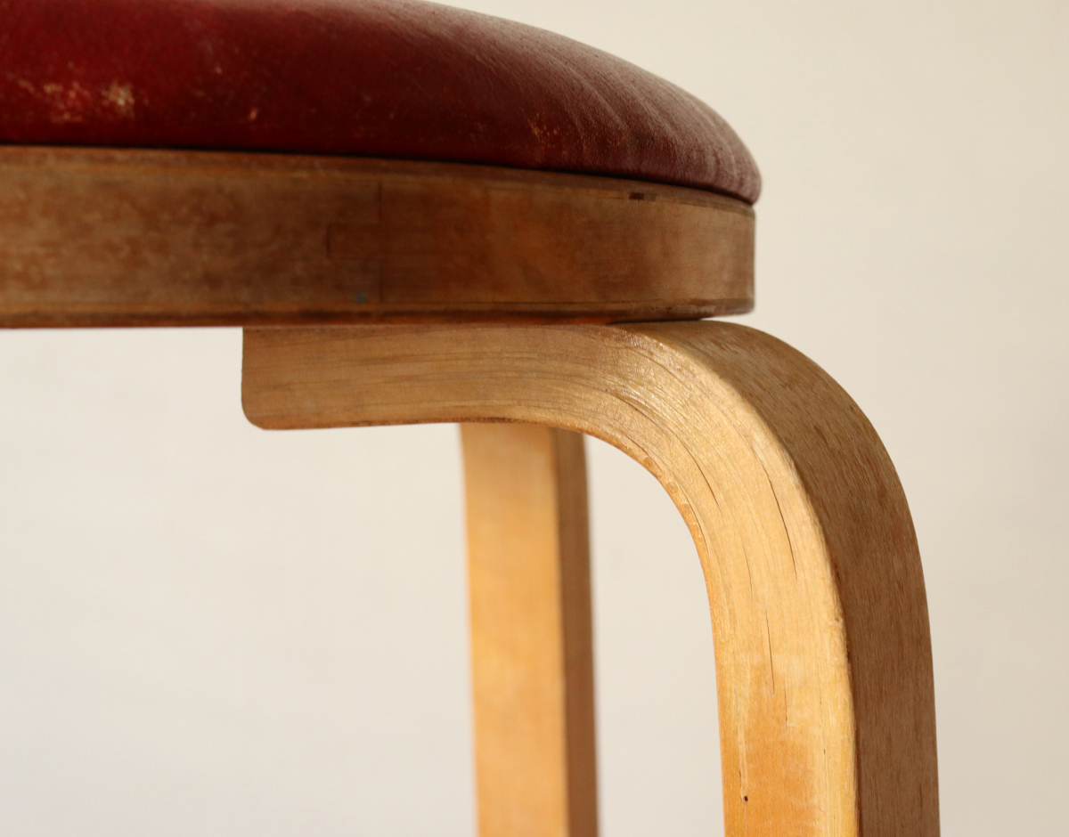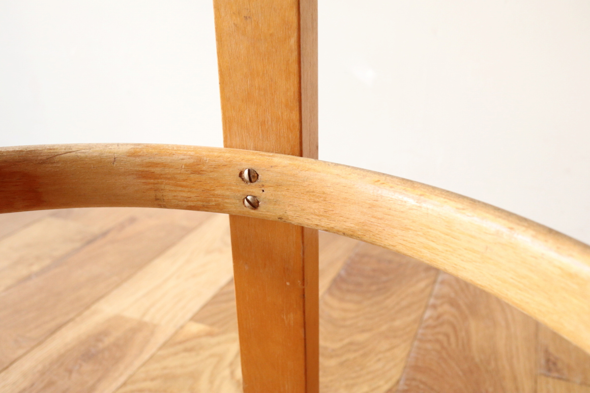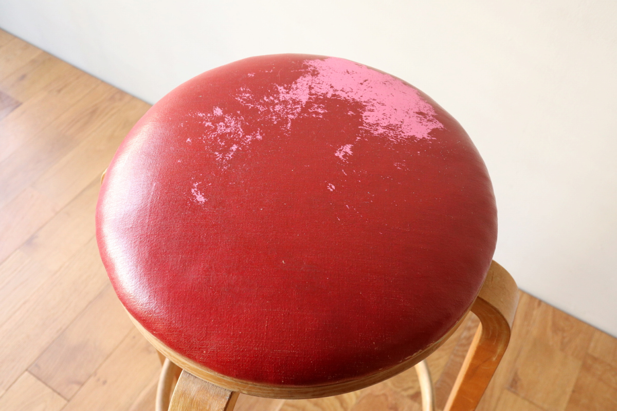 | 大変希少な30年代のBarStool64。当時のカタログ表記では64/86。 とにかく50年代以前のBarStoolは極端に個体数がすくなくめったに出てこないアイテムです。 中でも最初期の30年代物は別格で希少性は大変高いです。 こちらは当時のフェイクレザーが張られたモデルです。 塩ビのレザーが一般的ではなかった当時、布にニトロセルロースを塗布したものがフェイクレザーとして使われていました。 オリジナルのまま残ったこちらは大変希少です。 実用も可能ですが、このまま残すためにはコレクション的な扱いが良いかもしれません。張替も可能です。 |