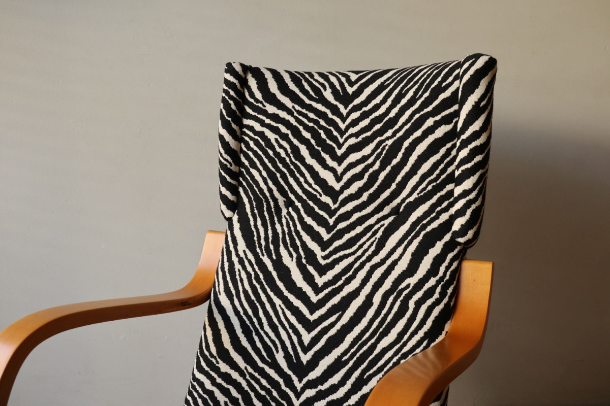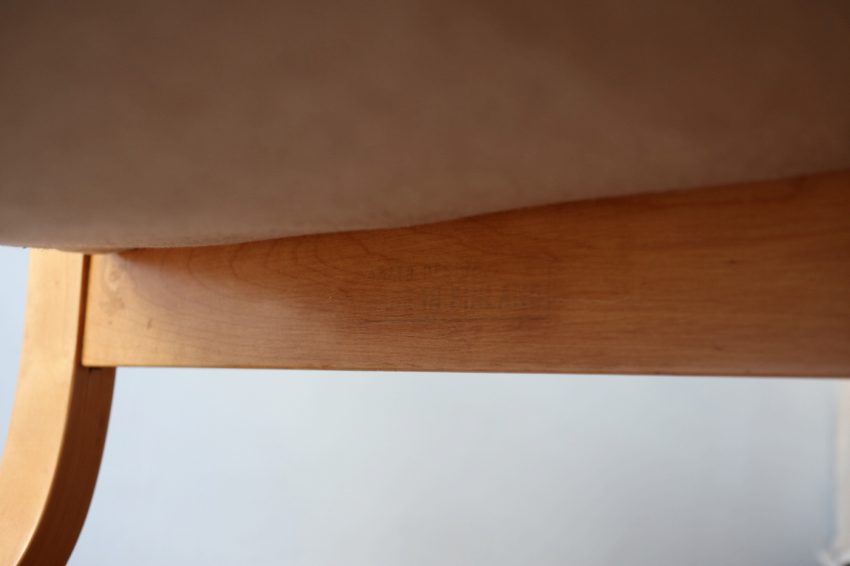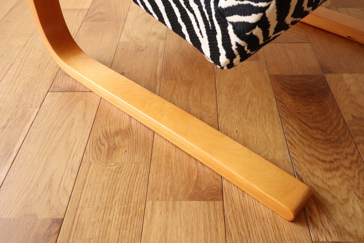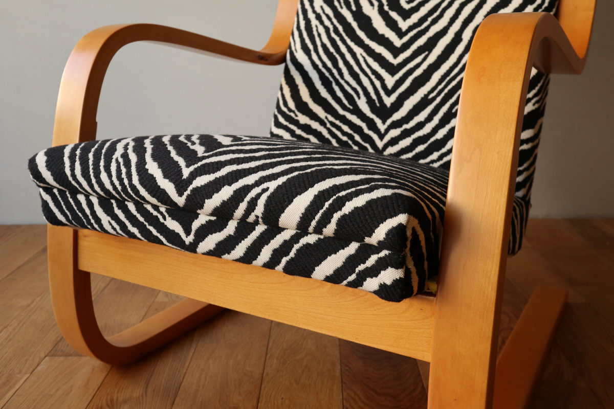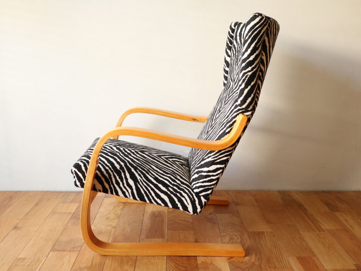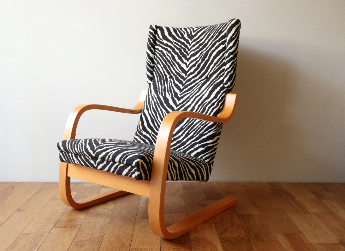 | アルテックのラウンジチェアの中でロングセラーの一つ、Arm Cahir 401です。 1933年にデザインされた最古参の一つで現在も生産が続くロングセラーアイテム。 現行品は座面の角度がかなり浅くなりリクライニングチェアというよりもリーディングチェアのような座り心地ですが グラビアなどでみる初期のものは深くのけぞるように座るデザインとなっています。 しかし残念ながらひずみが発生したりねじれたりするものが多いです。 こちらはそれらの歪みがほぼなく大変健康的なヴィンテージコンディションになります。 本来アアルトがデザインしたのはこんな椅子だったのかと実感できると思います。 ファブリックはアイノのゼブラ。フレームは塗装も含めてフルメンテナンスを行いました。 またこの年代はシートとフレームを金具で固定されておりますが その金具もあたらに製作いたしましたので将来的にも安心してお使いいただけます。 30-40年代のスタンプも残っており、実用できるコレクションとして大変おすすめの1台です。 |