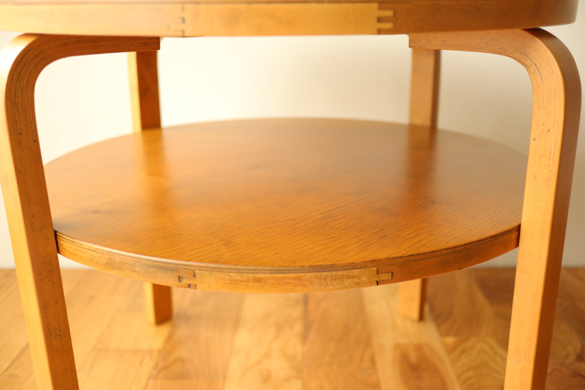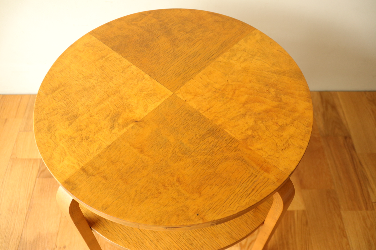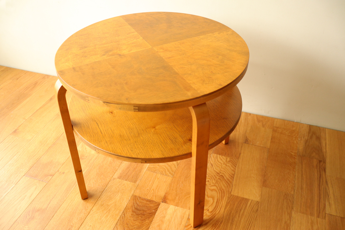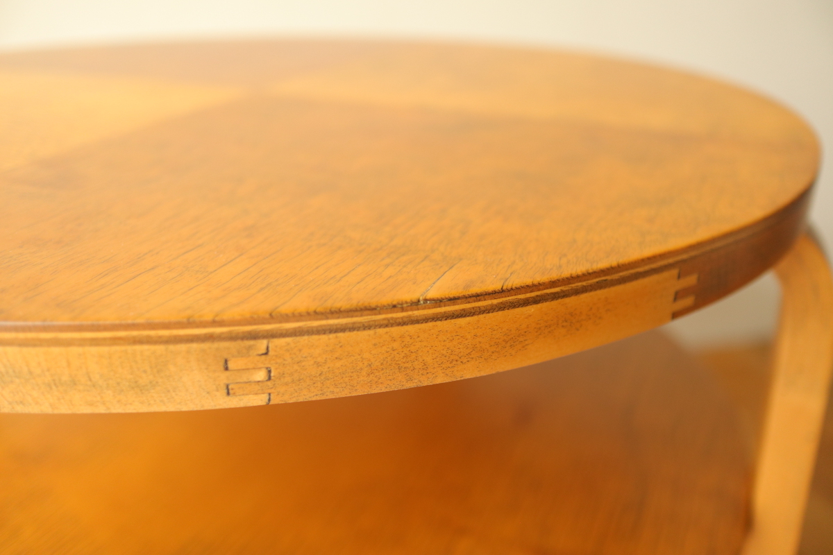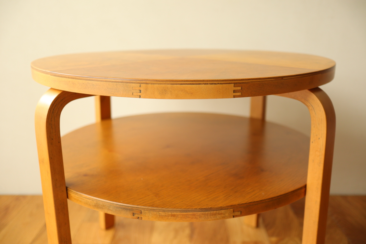 | 30年代のクラブテーブルです。 1,2段目共に同じ厚身のデザインでTable70とは違う種類になります。 1段目は突板が4等分になるデザインで初期のころに見られる仕様です。 当店入荷後、全体のリフィニッシュを行いましたので、 塗装もきれいで非常に好感が持てる一台です。 1段目の裏にスタンプがしっかりと残っております。。 |