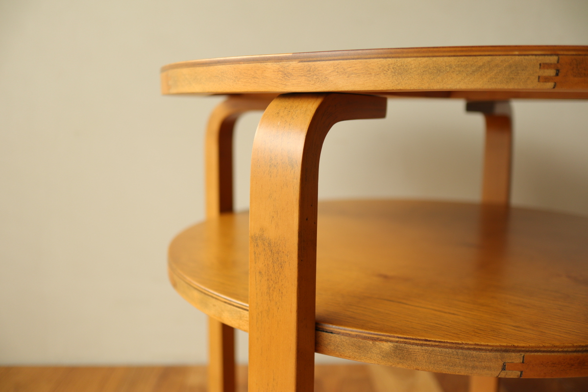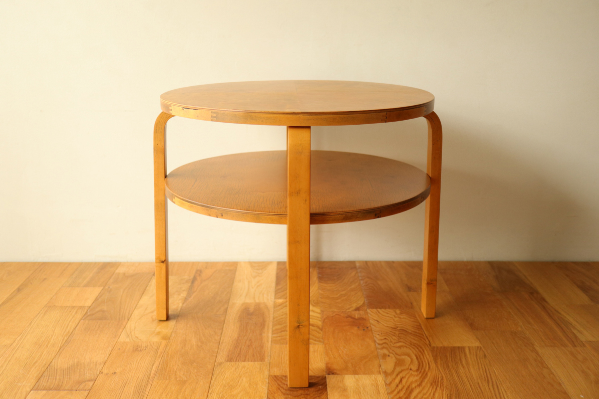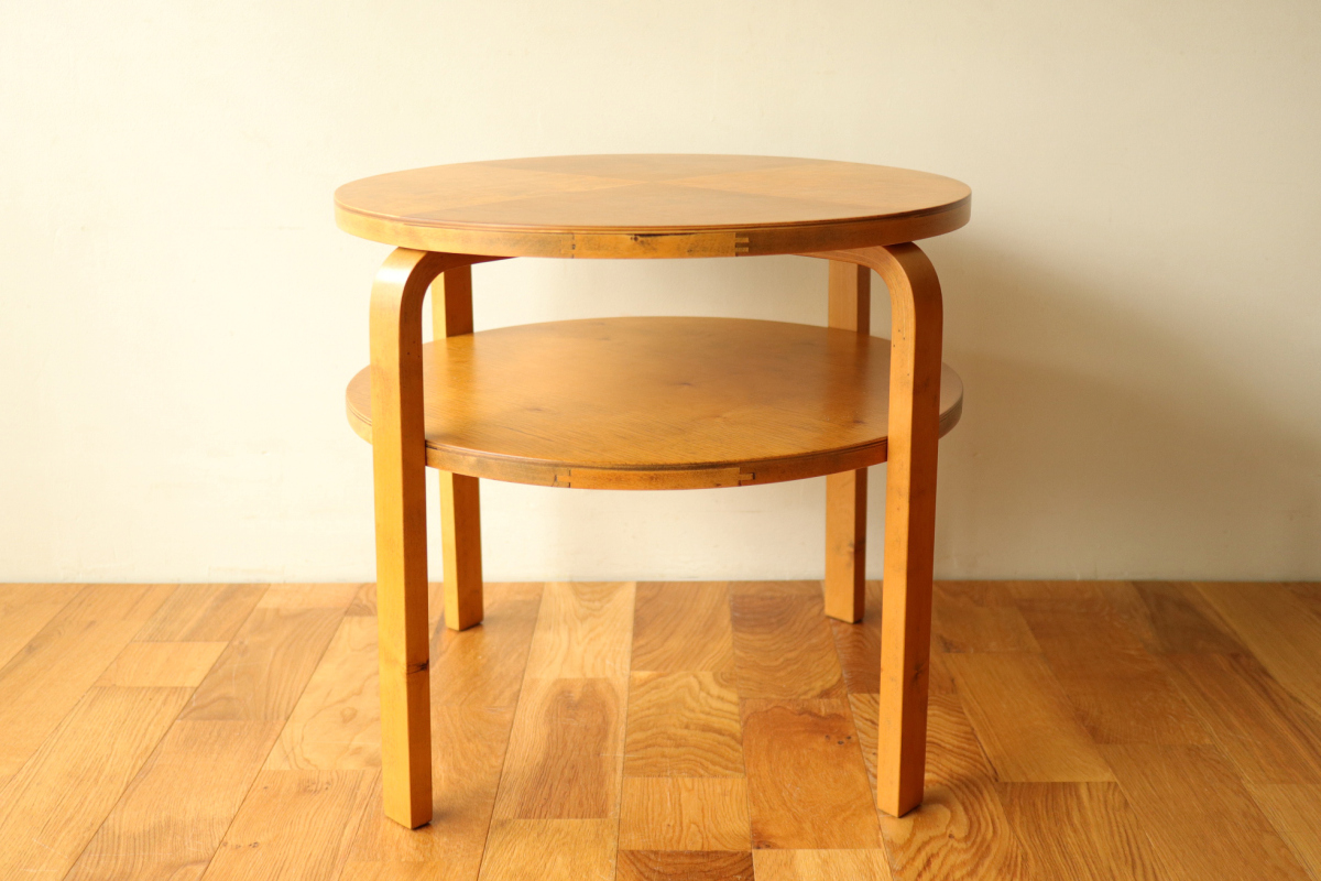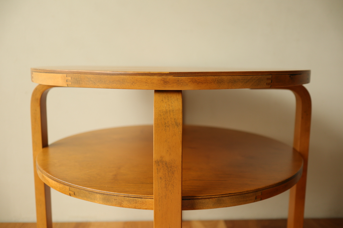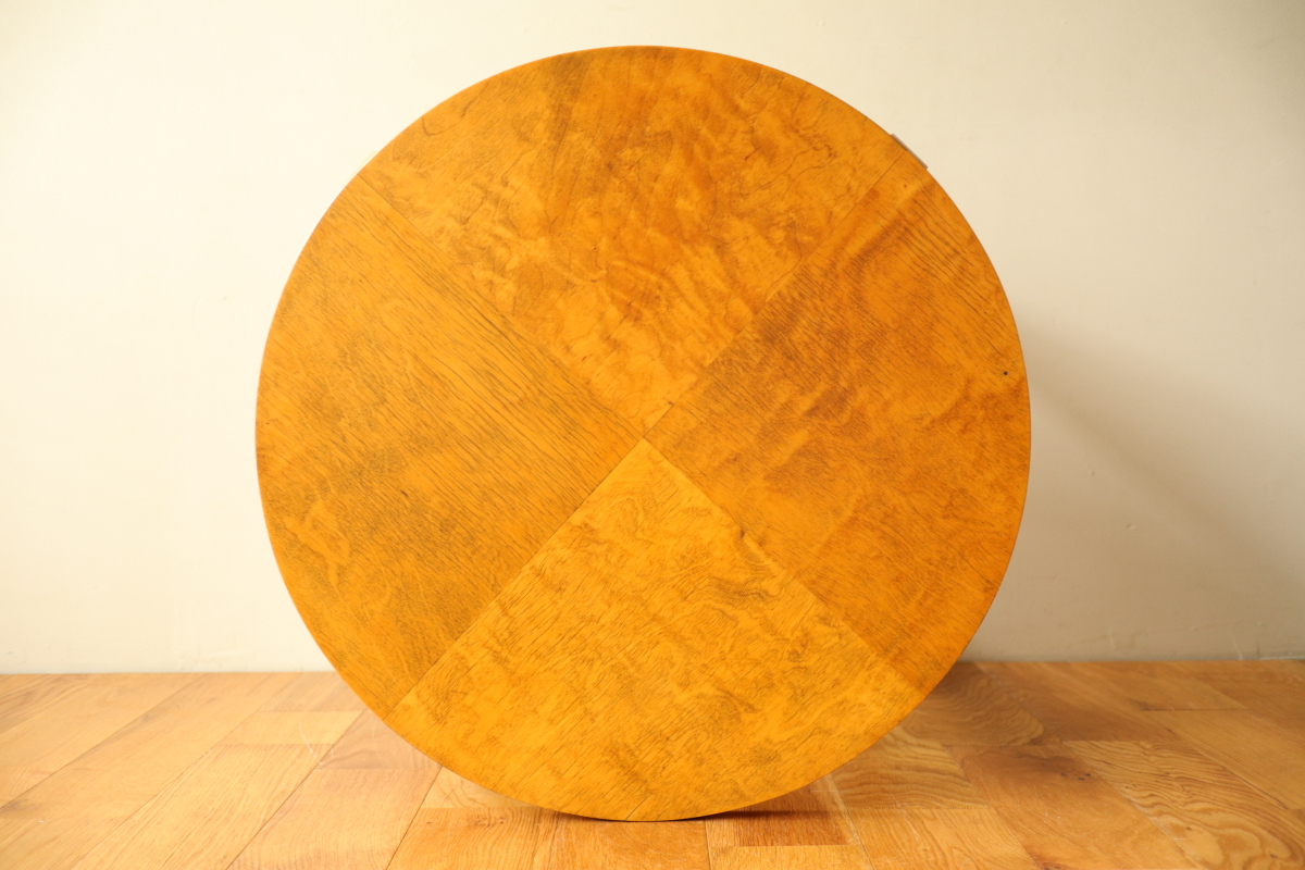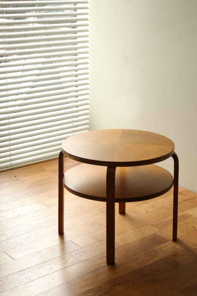 | 30年代のクラブテーブルです。 1,2段目共に同じ厚身のデザインでTable70とは違う種類になります。 1段目は突板が4等分になるデザインで初期のころに見られる仕様です。 当店入荷後、全体のリフィニッシュを行いましたので、 塗装もきれいで非常に好感が持てる一台です。 1段目の裏にスタンプがしっかりと残っております。。 |