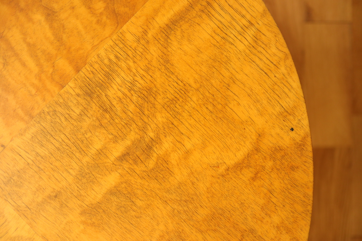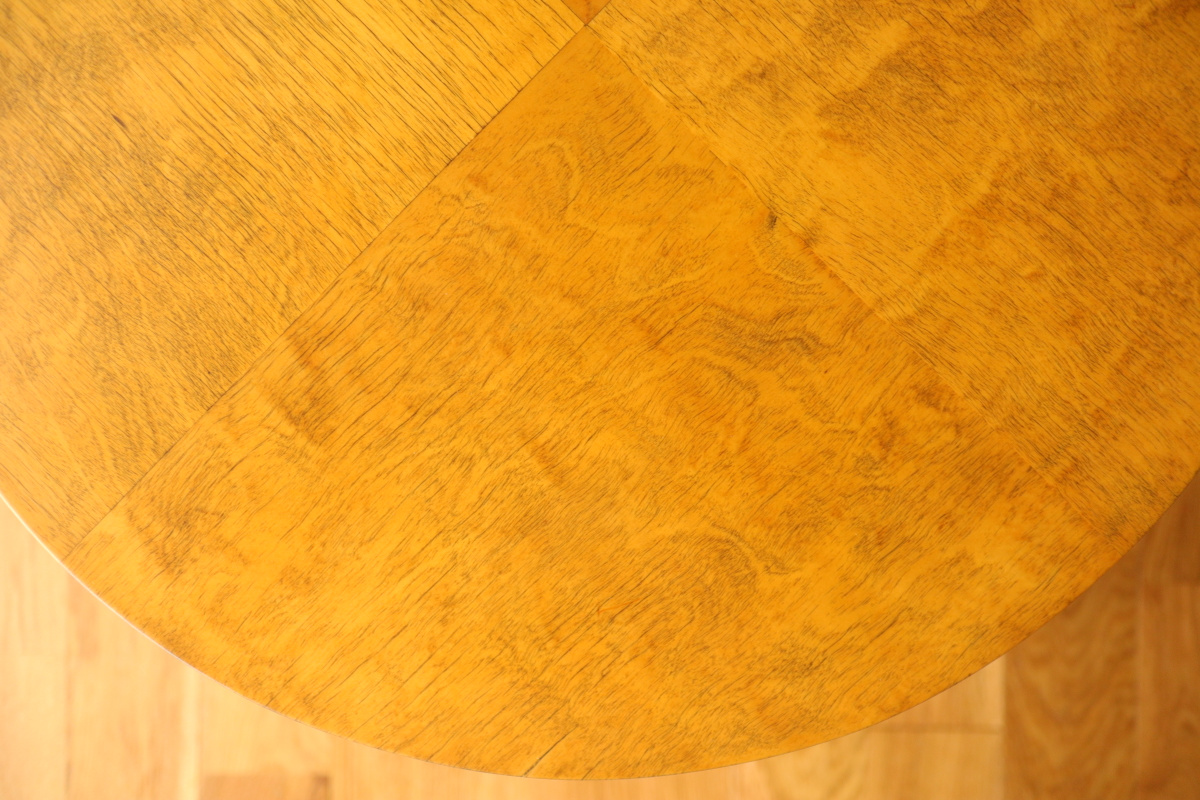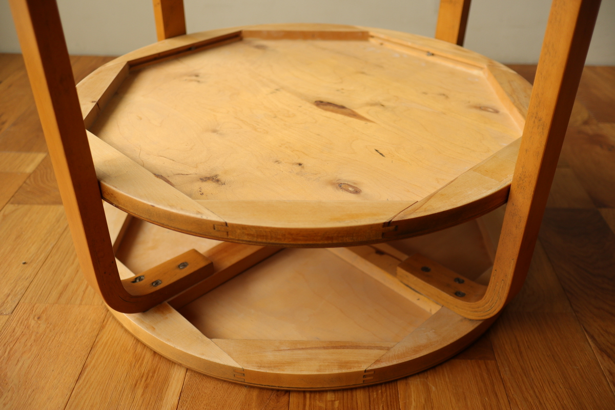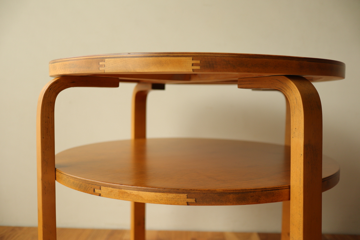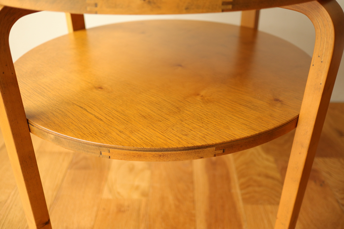 | 30年代のクラブテーブルです。 1,2段目共に同じ厚身のデザインでTable70とは違う種類になります。 1段目は突板が4等分になるデザインで初期のころに見られる仕様です。 当店入荷後、全体のリフィニッシュを行いましたので、 塗装もきれいで非常に好感が持てる一台です。 1段目の裏にスタンプがしっかりと残っております。。 |
