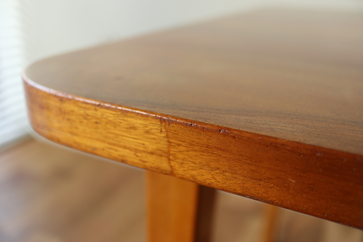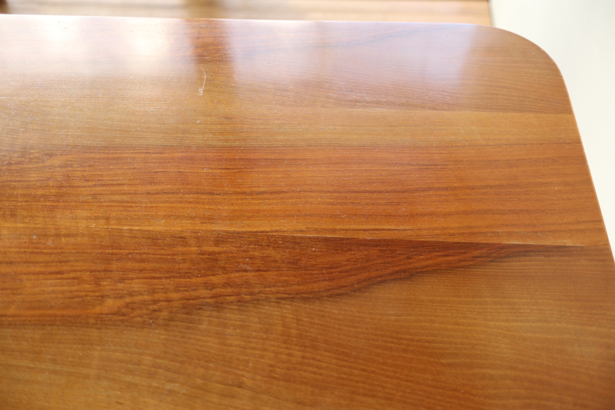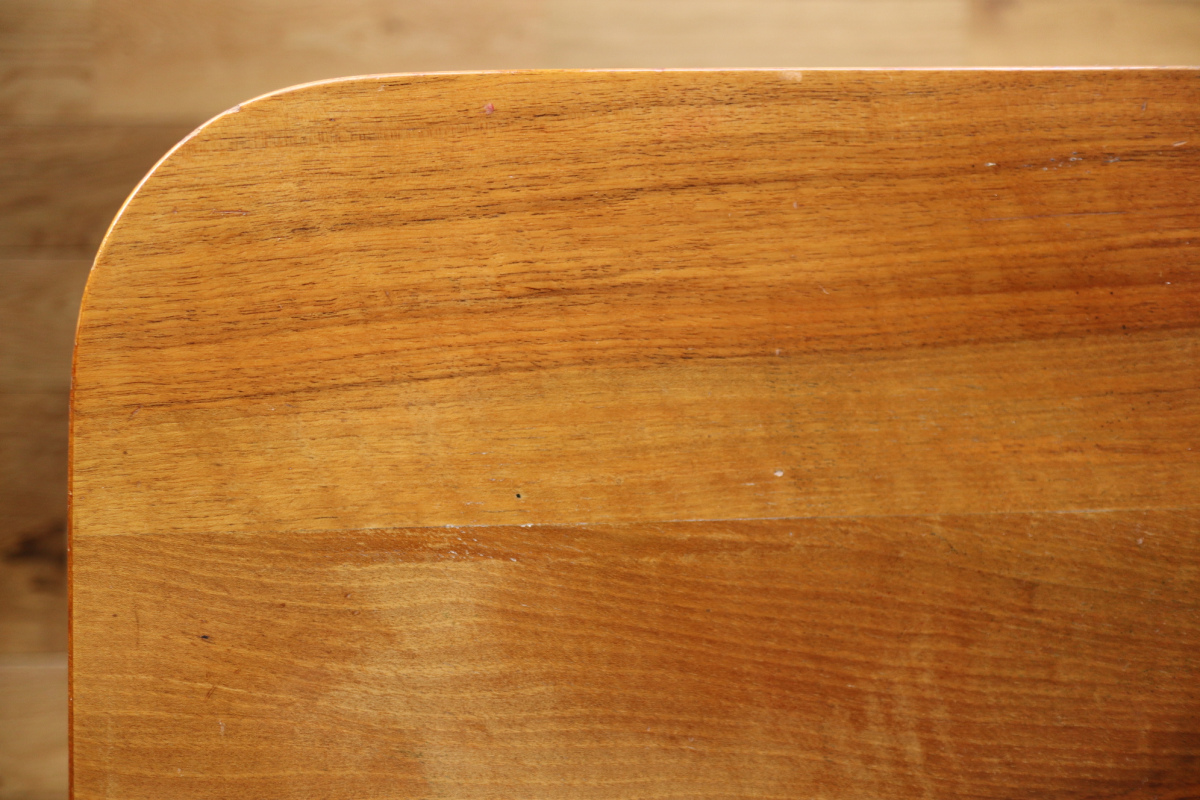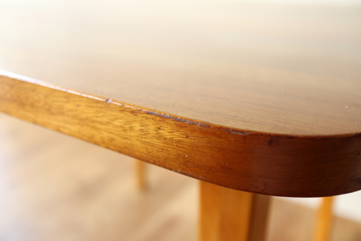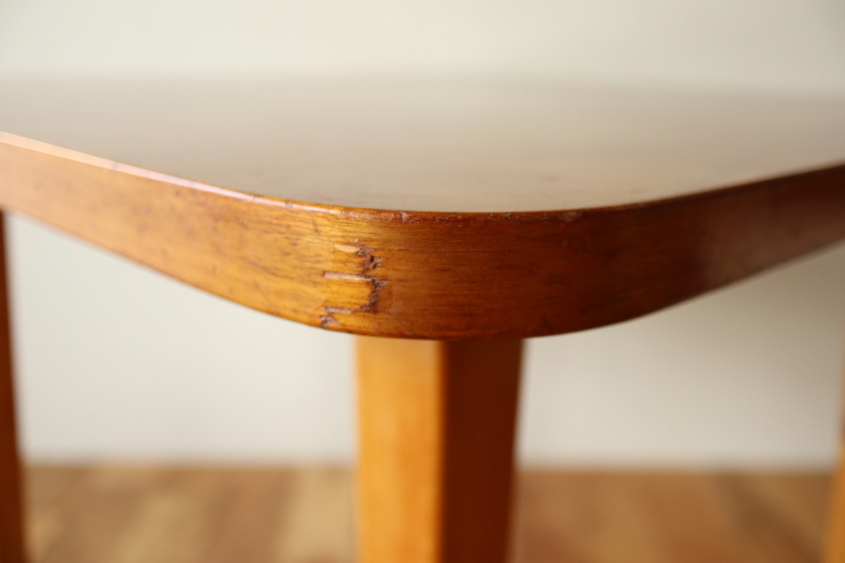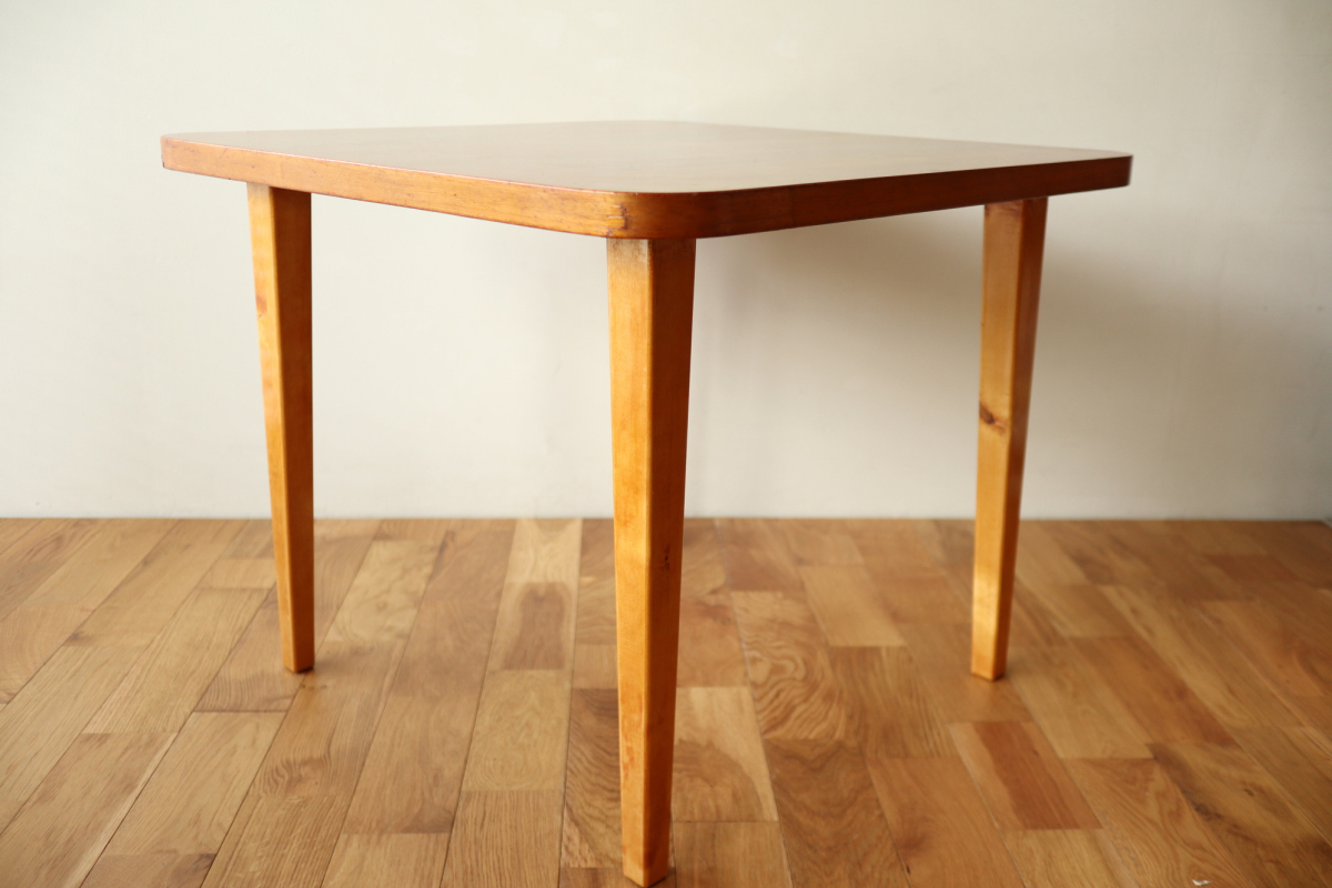 | 40-50年代のAino Aaltoのダイニングテーブルです。 ソファテーブルはまだ市場に出てくることがありますが、このシリーズのダイニングテーブルは大変希少です。 特に、エルムトップ仕様、さらに虎目のフレイムドエルムという強烈なルックスの一台。 アイノアアルト特有の曲げ木ではない無垢の脚で天板に差し込んで組み込むデザインのテーブルです。 89cm角の正方形ですので、4人が食事をできる大きさです。 おそらく今後の入荷はないと思います。 |