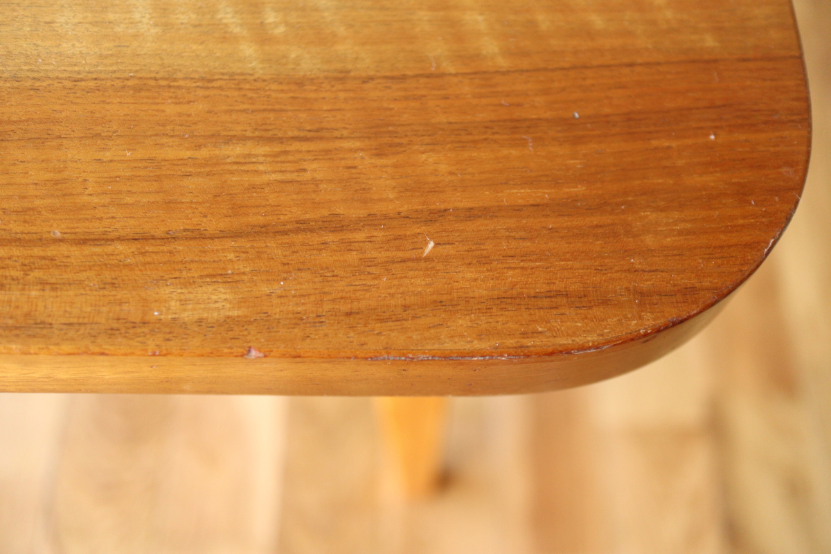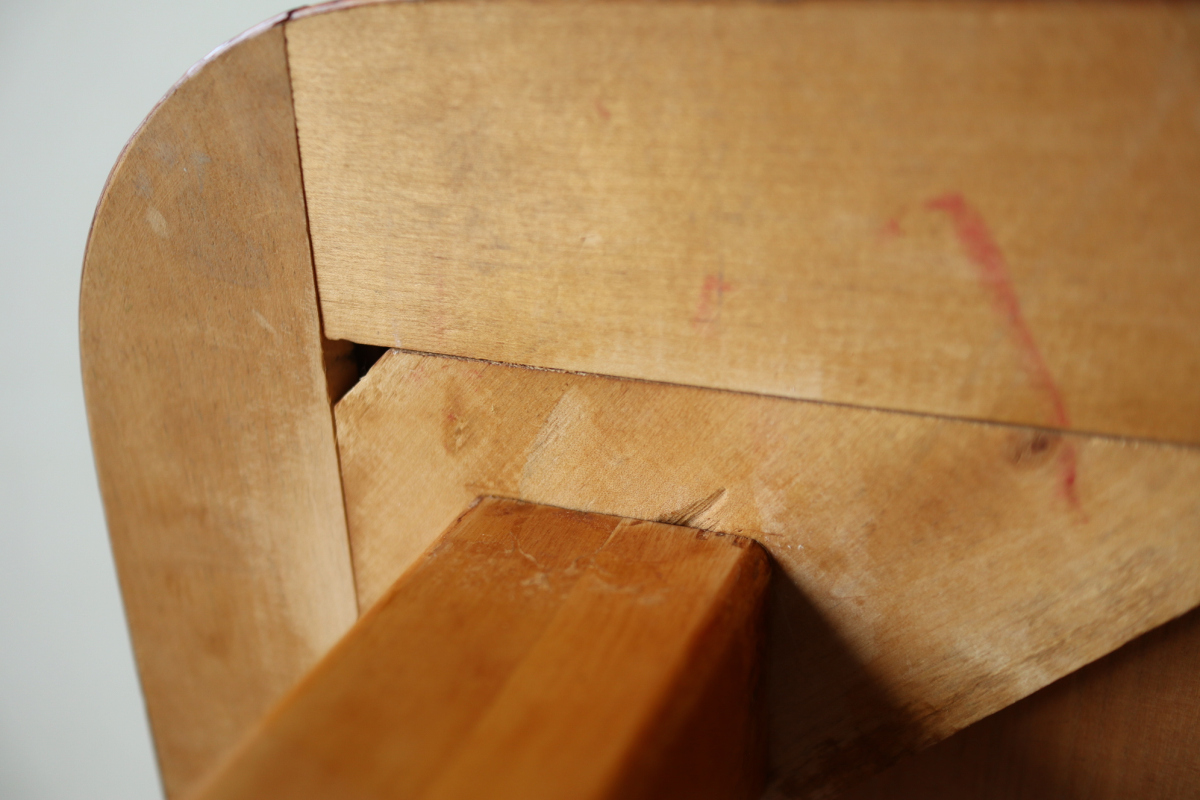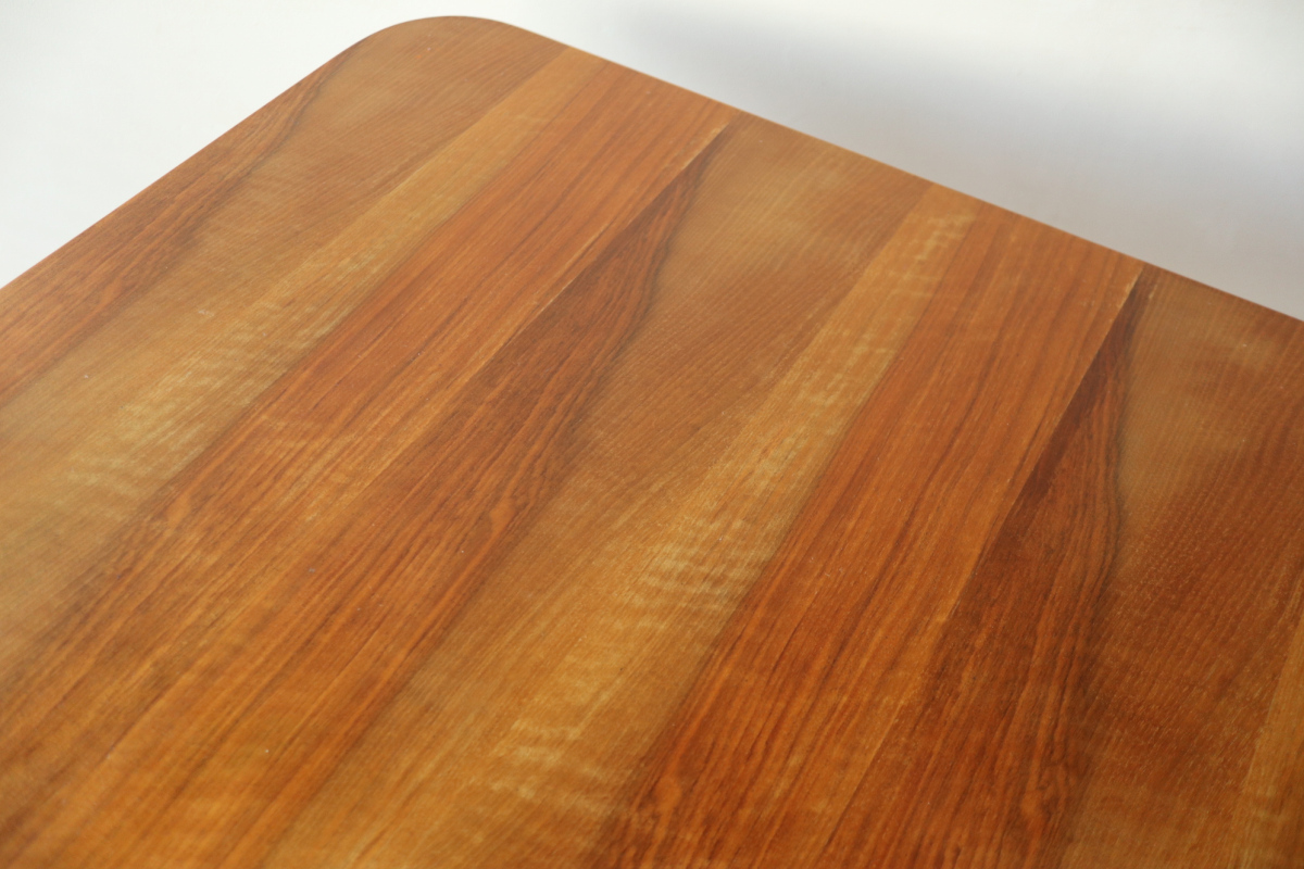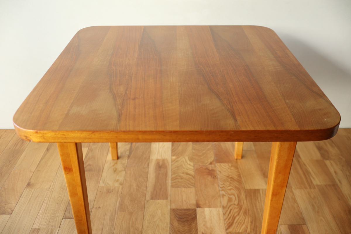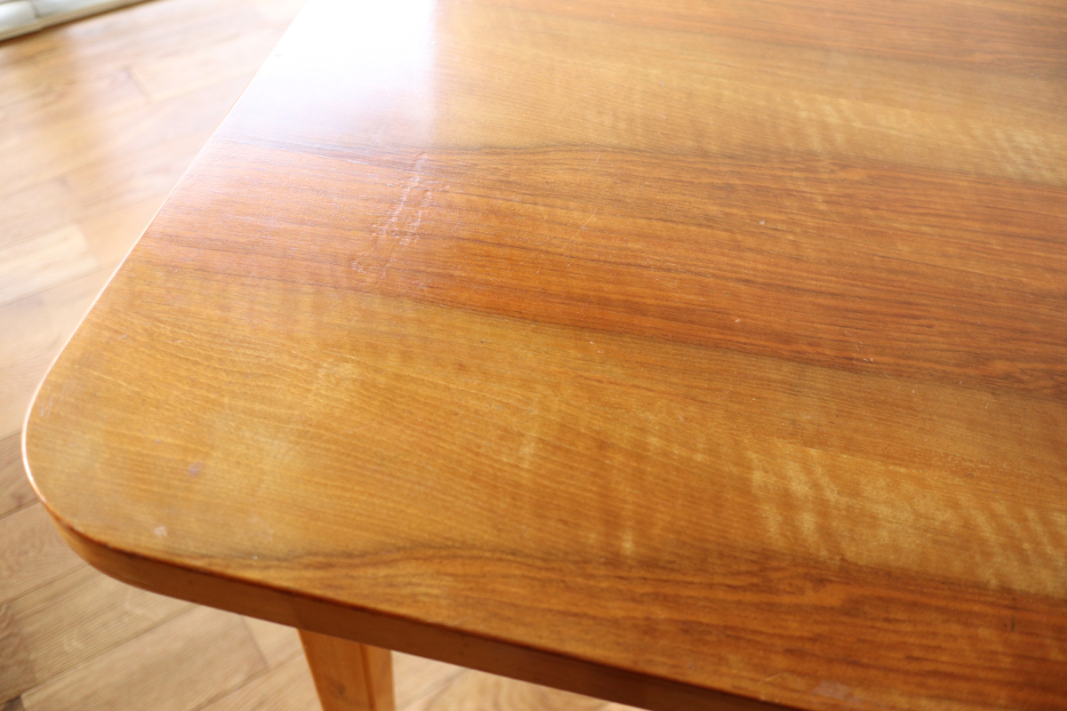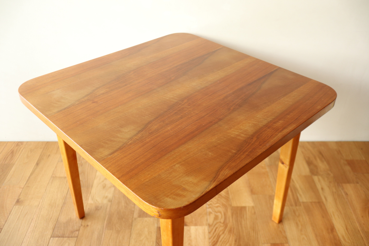 | 40-50年代のAino Aaltoのダイニングテーブルです。 ソファテーブルはまだ市場に出てくることがありますが、このシリーズのダイニングテーブルは大変希少です。 特に、エルムトップ仕様、さらに虎目のフレイムドエルムという強烈なルックスの一台。 アイノアアルト特有の曲げ木ではない無垢の脚で天板に差し込んで組み込むデザインのテーブルです。 89cm角の正方形ですので、4人が食事をできる大きさです。 おそらく今後の入荷はないと思います。 |