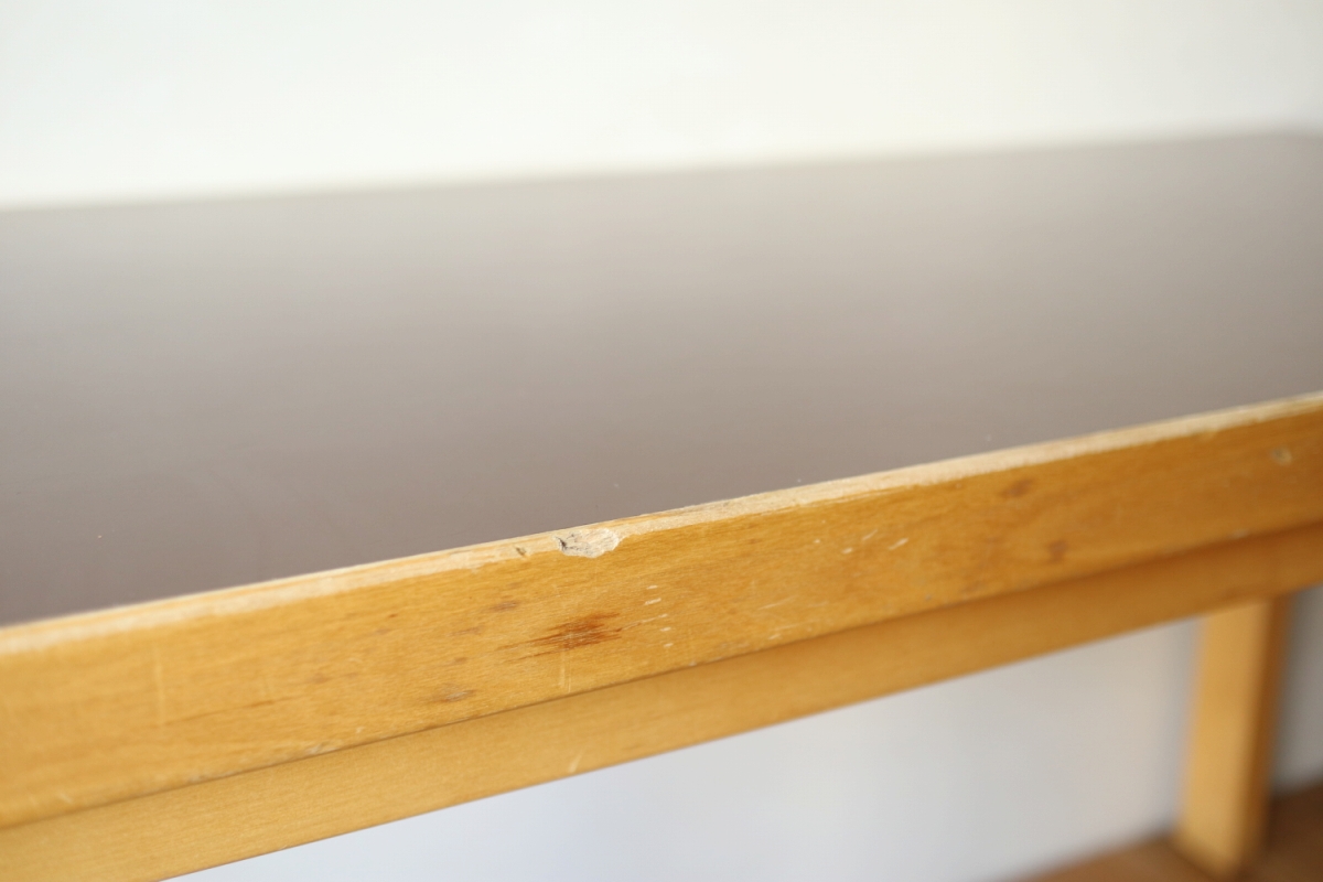 | 90-2000年代ごろのテーブルです。 勉強デスクや書斎、一人用のテーブルとして使いやすい120x60サイズ。 脚の取り付け位置が通常モデルとは異なり長手方向いっぱいに使用できるちょっとレアなモデルです。 ラミネートトップなのでメンテナンスも楽ちんです。 トップは線傷程度はありますが、致命的な傷はなくコンディション良好です。 |