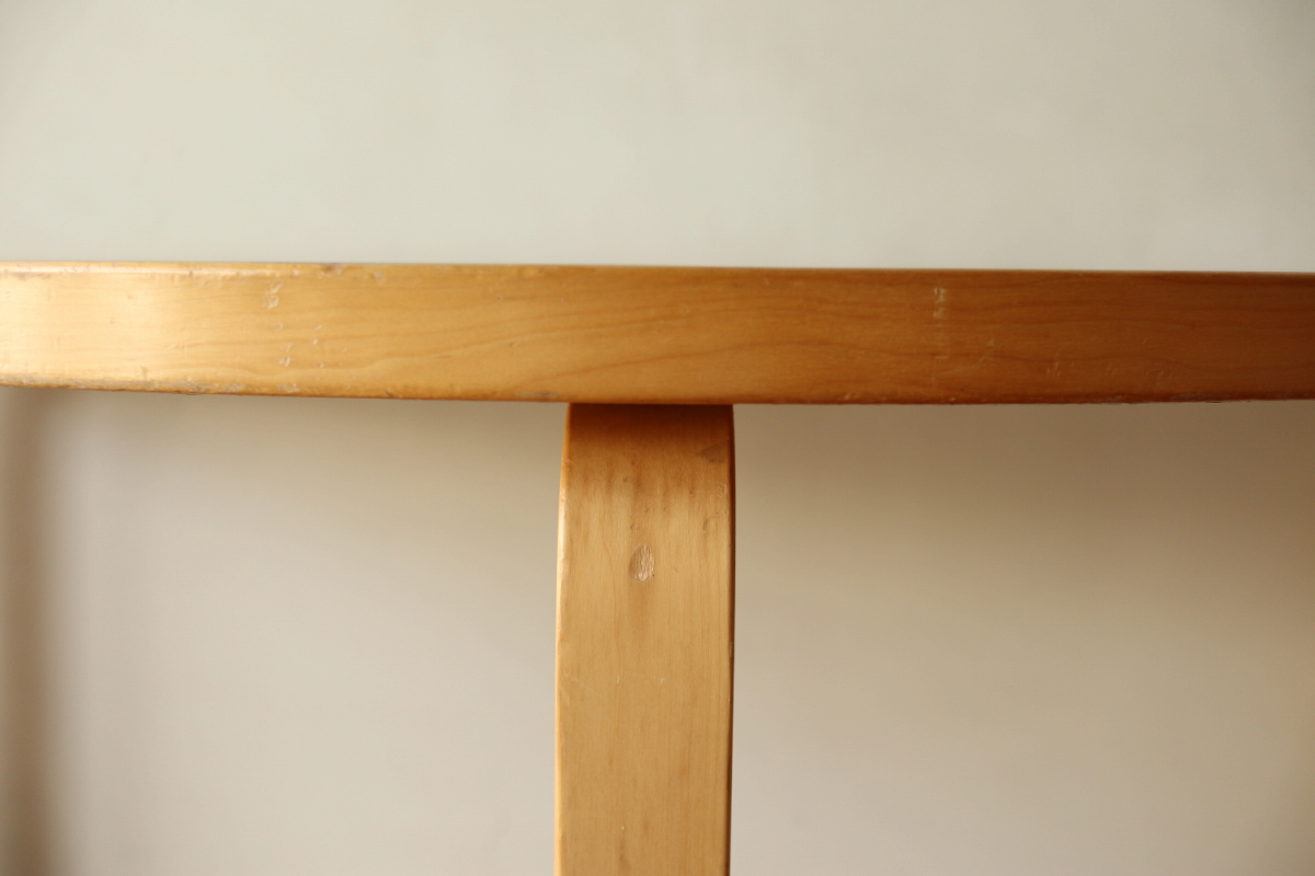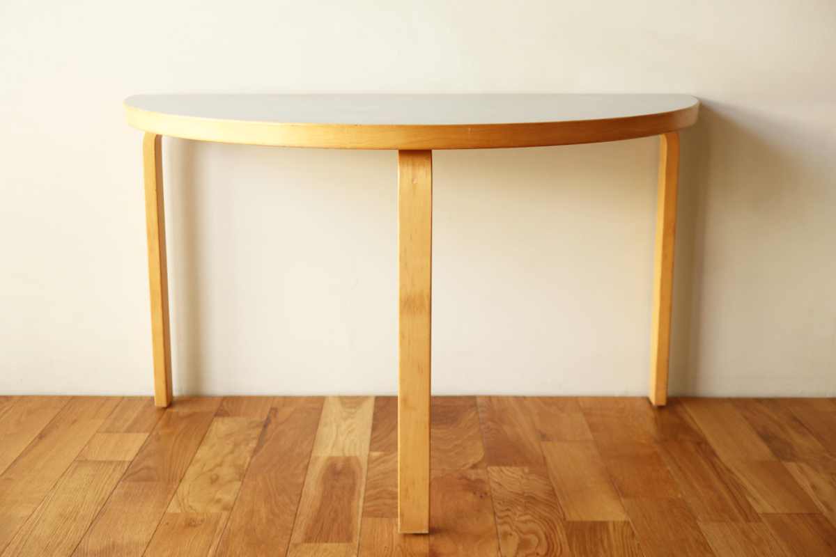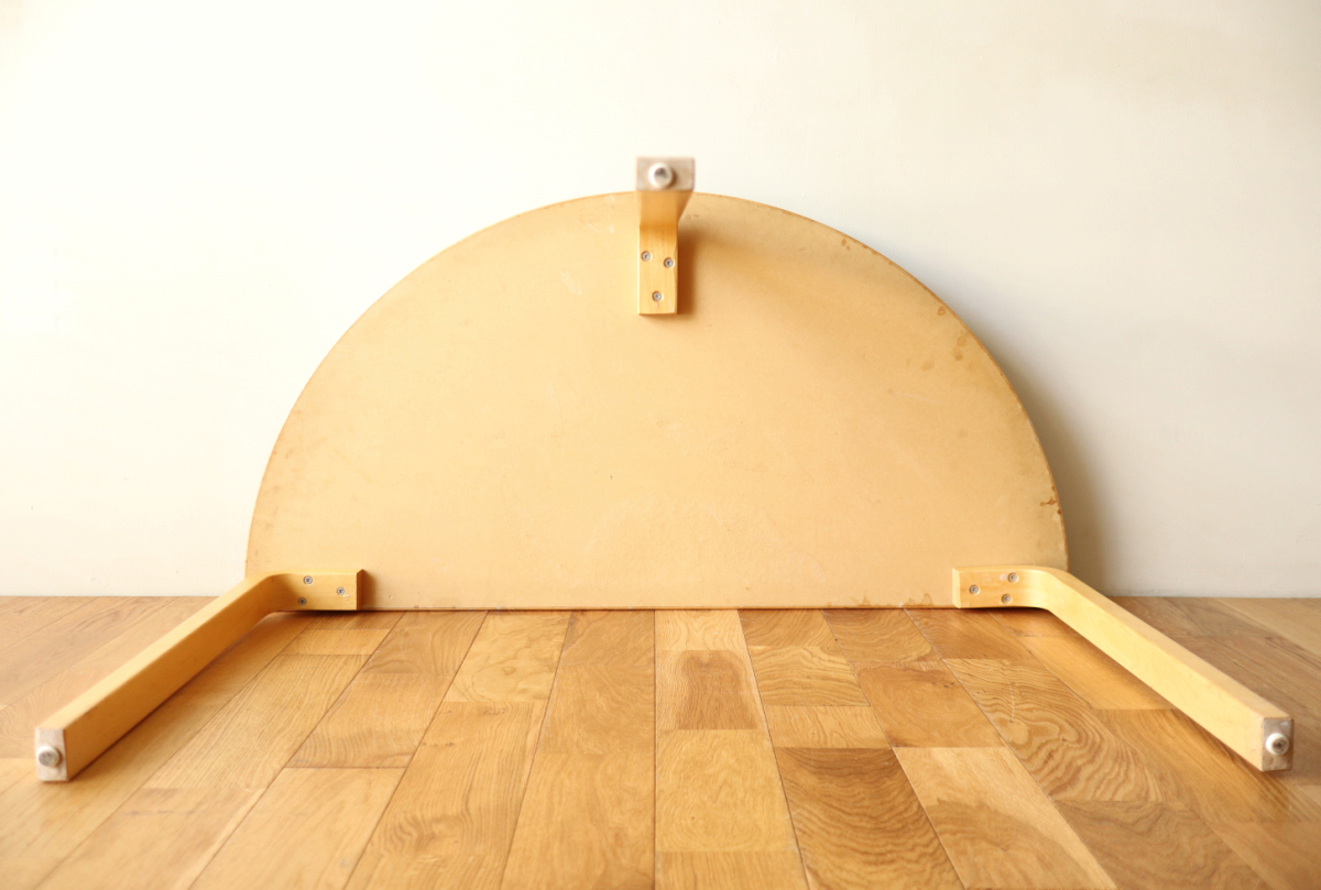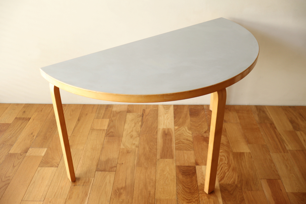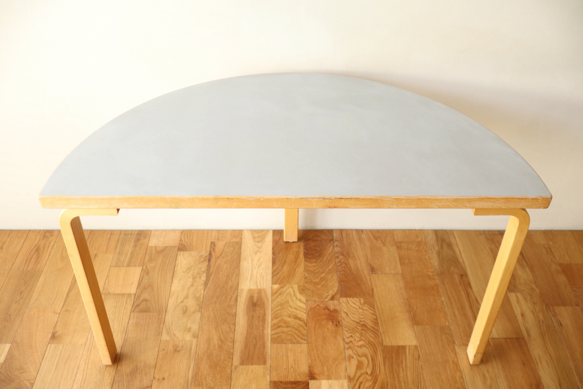 | 70-80年代のtable95 半円テーブルです。 壁際にテーブル空間を作ることができ、リビングや寝室のスペースを有効活用できます。 フィンランドでは子供の勉強コーナーなどにも使われてるのをよく目にします。 ダイニングテーブルの高さですのでちょっとした書斎コーナー的な使い方も可能です。 グレーのリノリウムですので、シンプルなお部屋に合わせやすく落ち着いた雰囲気があります。 1か所ネジ穴が追加されておりましたがきれいに処理しております。 足を取り付ければ見えないところですので、見た目にも問題ないと思います。 |