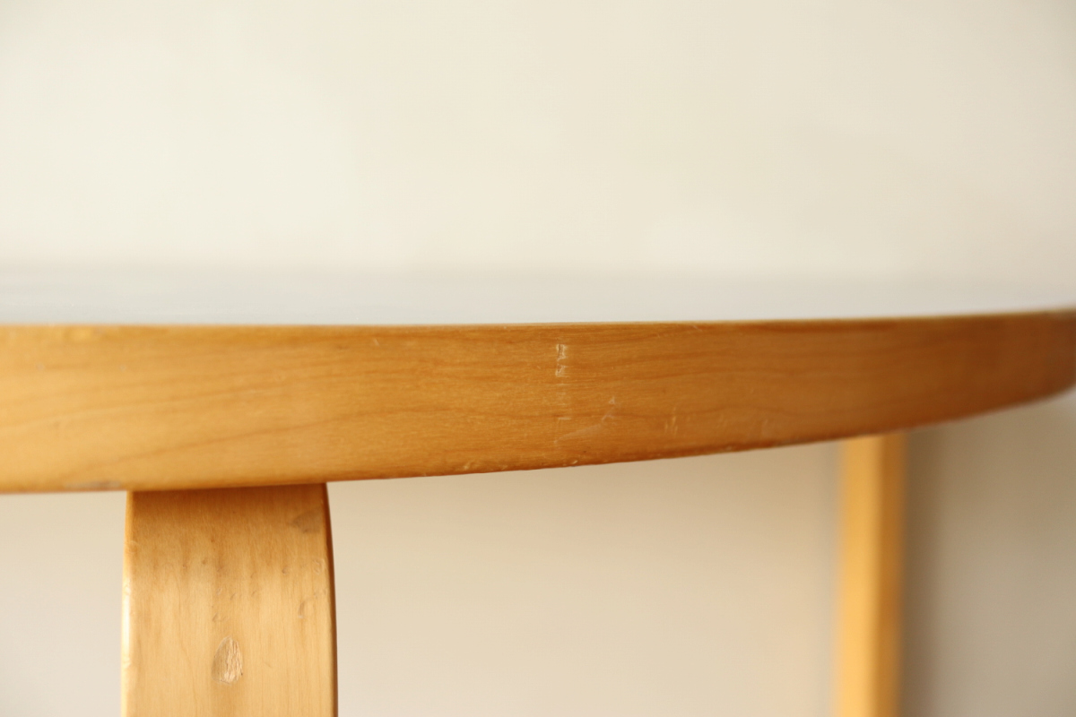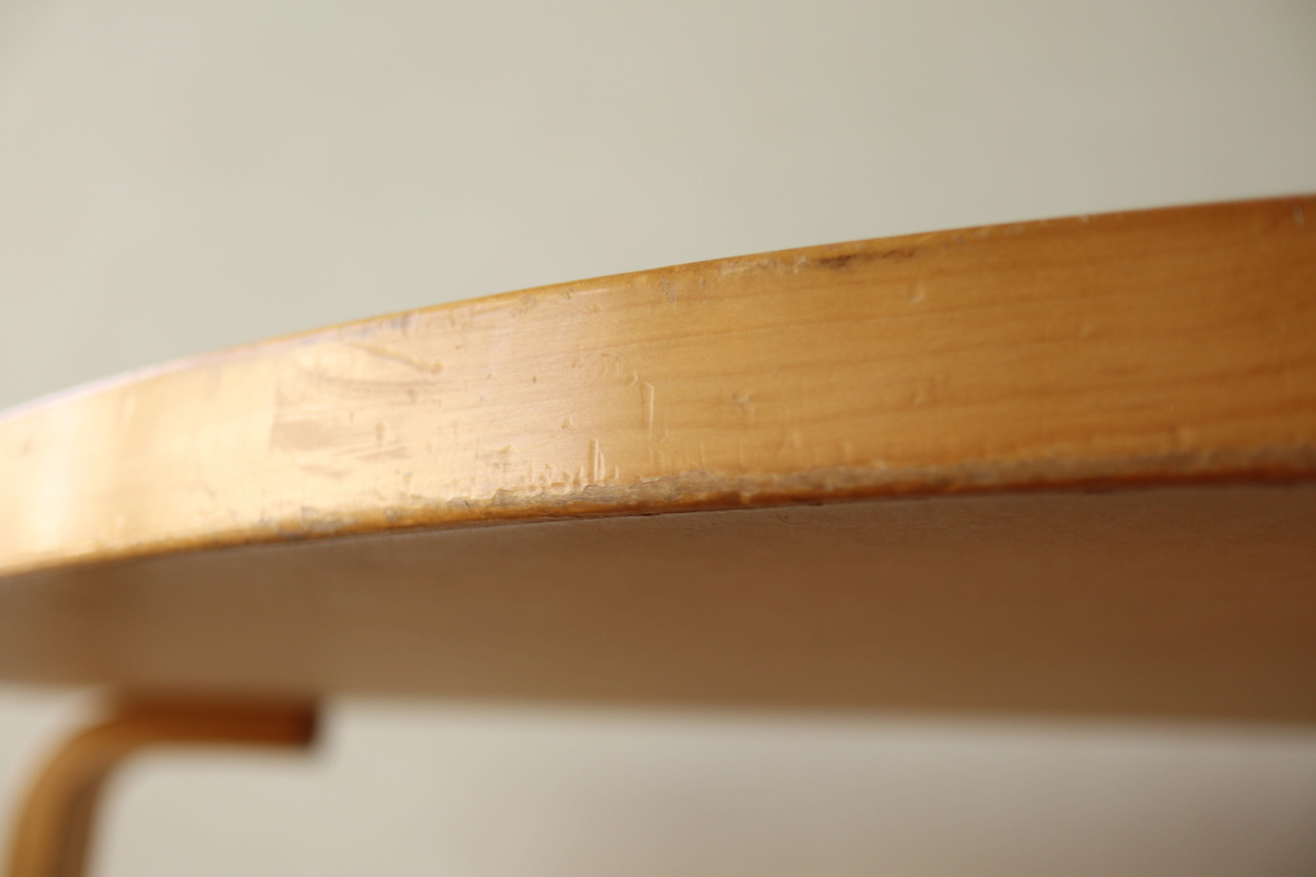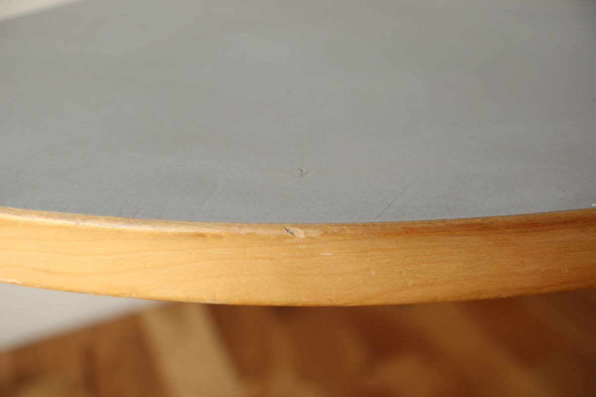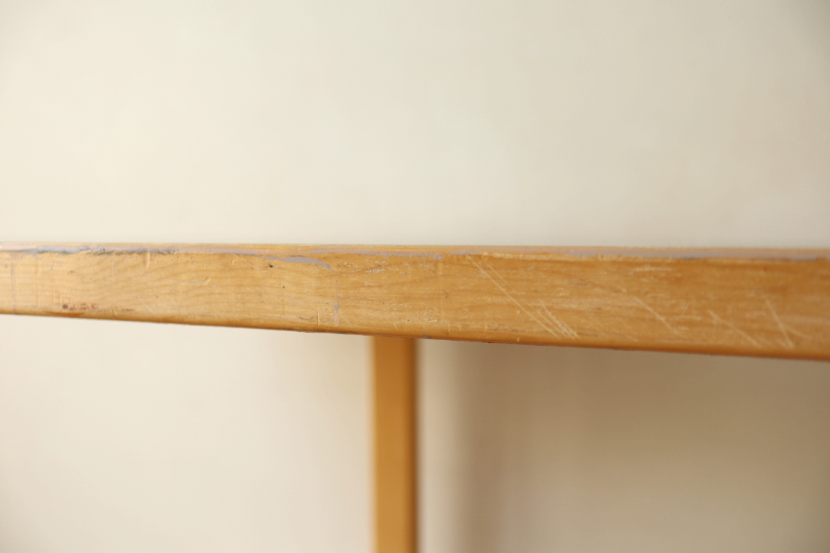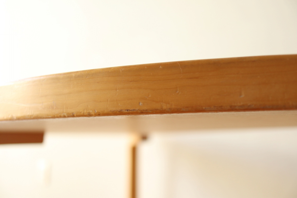 | 70-80年代のtable95 半円テーブルです。 壁際にテーブル空間を作ることができ、リビングや寝室のスペースを有効活用できます。 フィンランドでは子供の勉強コーナーなどにも使われてるのをよく目にします。 ダイニングテーブルの高さですのでちょっとした書斎コーナー的な使い方も可能です。 グレーのリノリウムですので、シンプルなお部屋に合わせやすく落ち着いた雰囲気があります。 1か所ネジ穴が追加されておりましたがきれいに処理しております。 足を取り付ければ見えないところですので、見た目にも問題ないと思います。 |