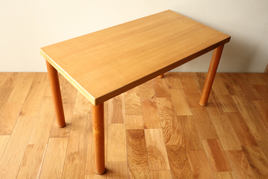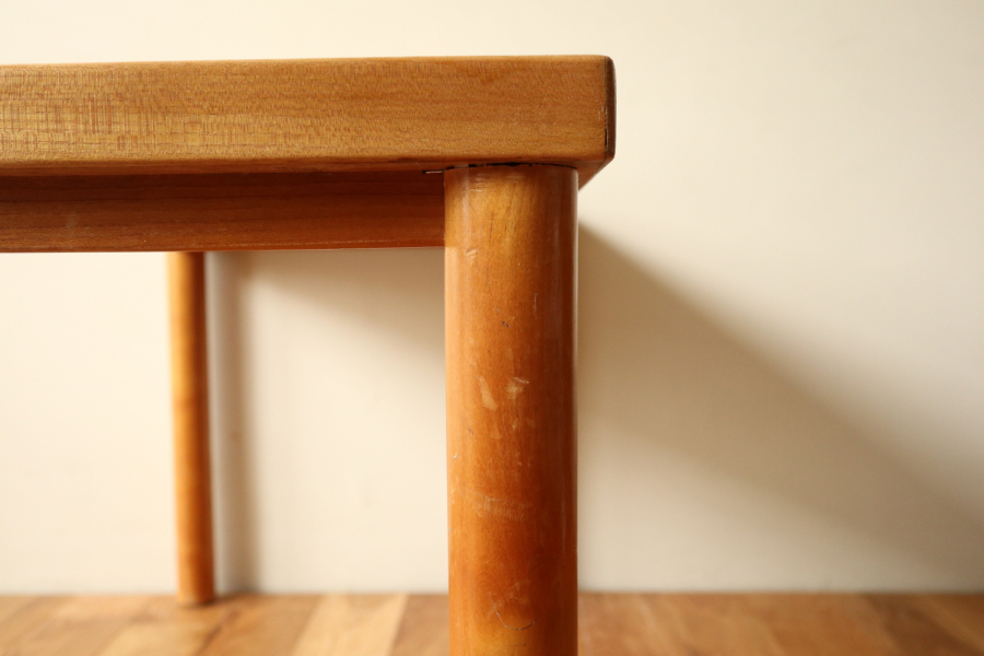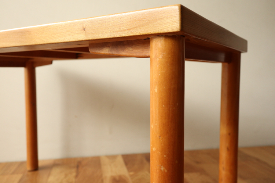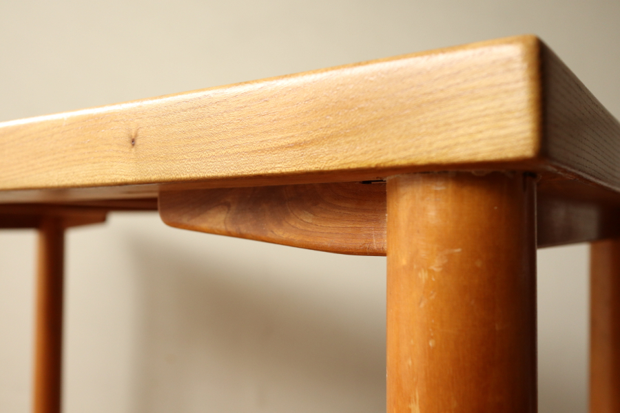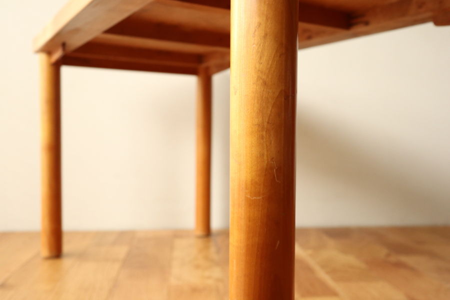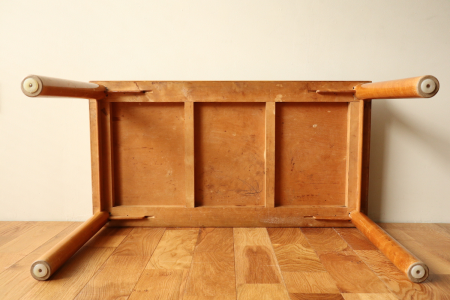 | 50年代頃の超希少なソファーテーブルです。 Aino Aaltoによってデザインされた作品で丸い脚が特徴です。 フィンのようなサポート材が構造的かつ意匠的にうまくデザインされています。 トップはこれまた希少なエルム材。 全体的なコンディションも申し分ありません。 天板裏側にはスタンプも残っています。 |