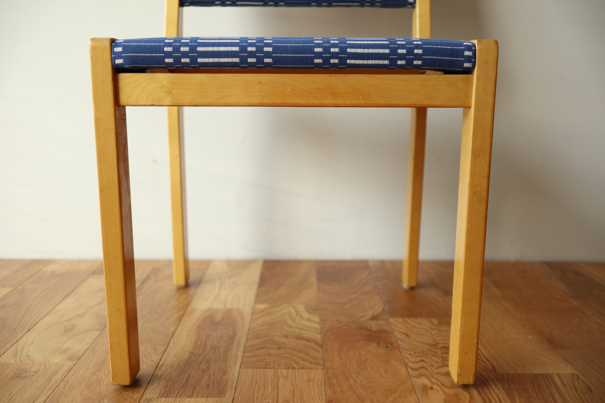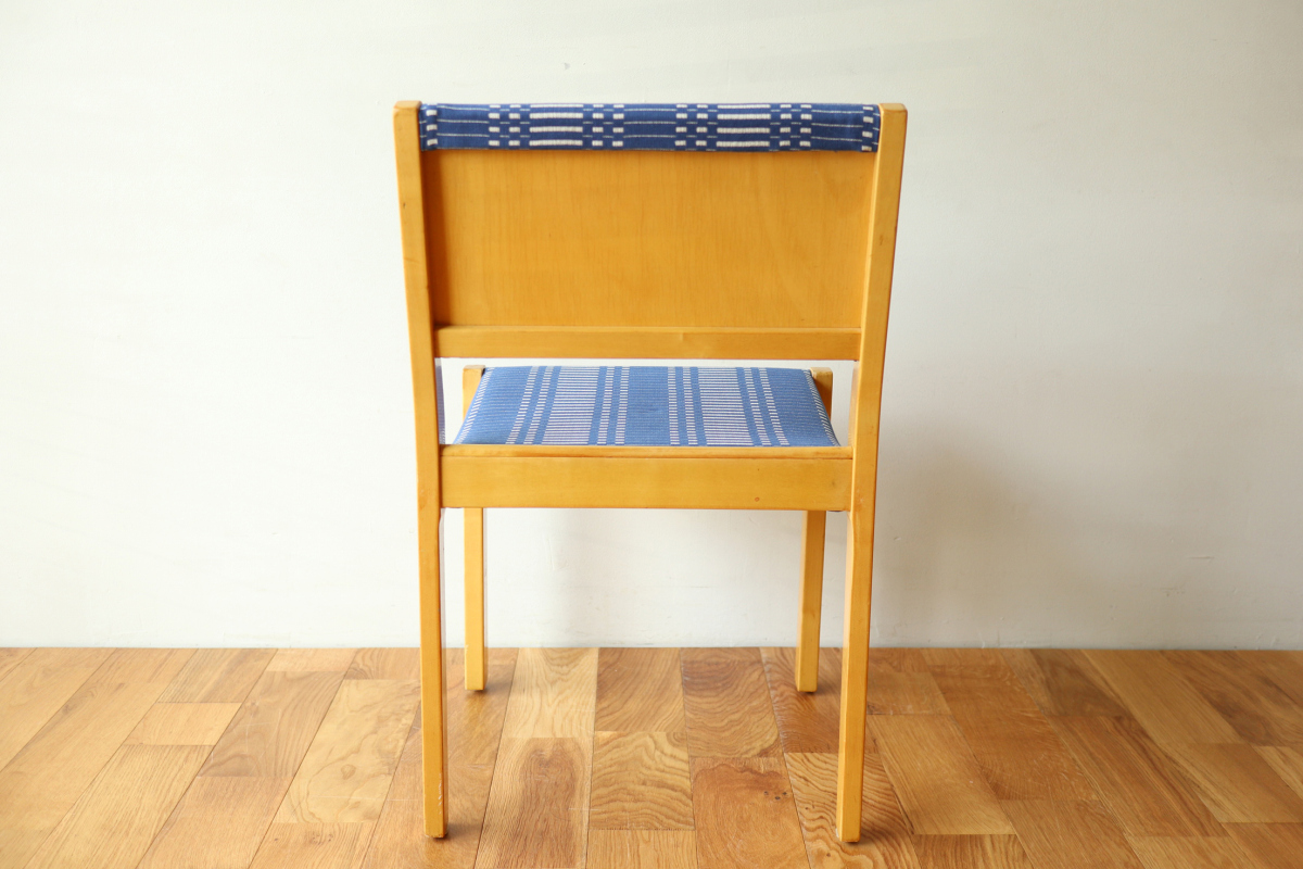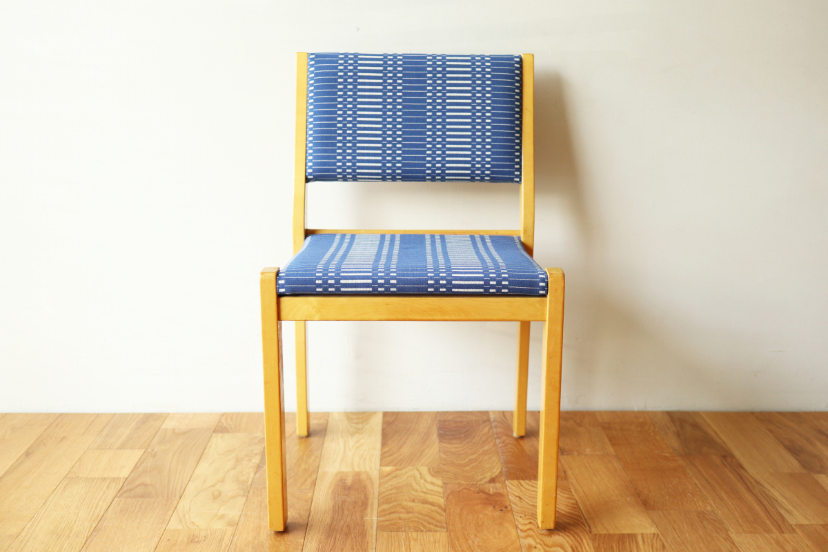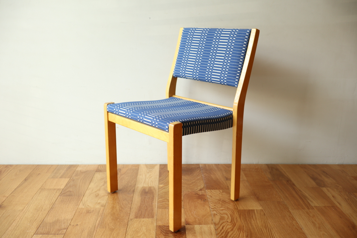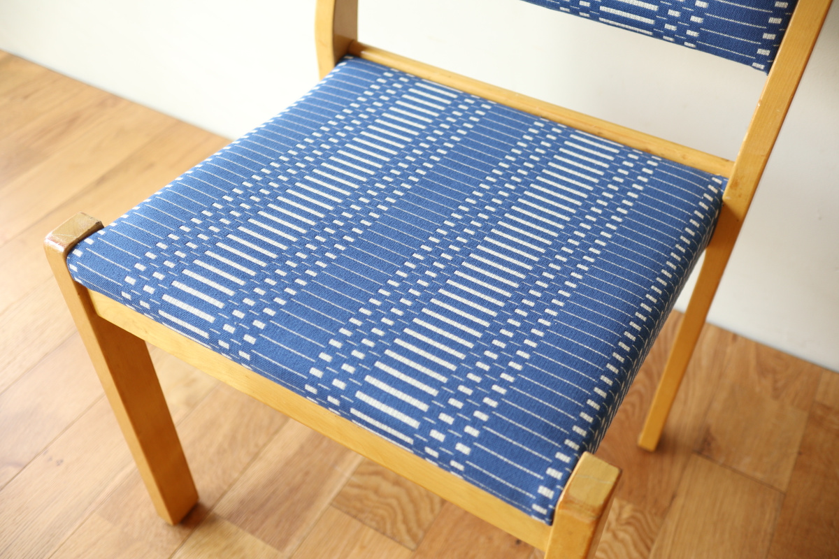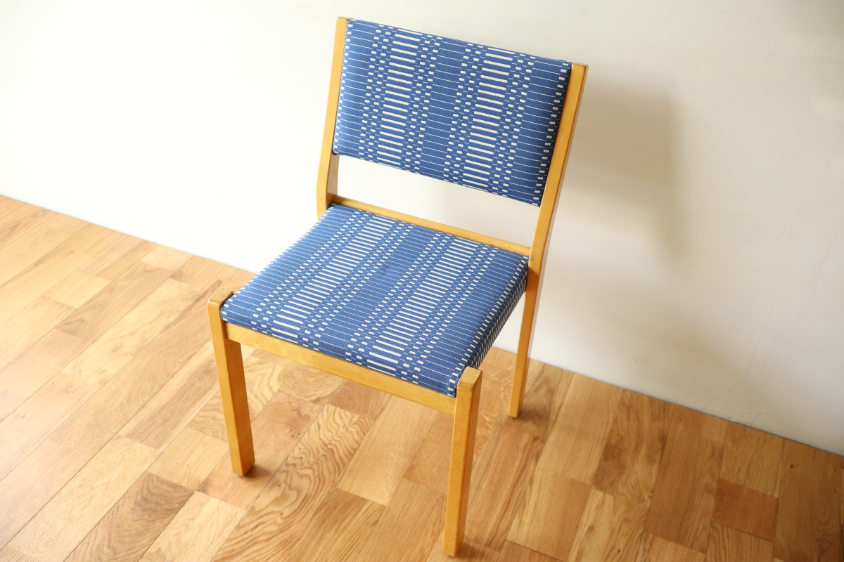 | Artekのスタンダードチェアの一つ、Chair 611です。 1930年代から生産されていた最古参のモデルの一つです。 現在は、ウェービングテープ仕様のみが生産されておりますが 当時は板座で製造されていました。 こちらは60年代後期から70年代頃の一台。 もともとファブリック仕様でしたが、当店入荷後 グリクセンの生地で張替えを行いました。 生地代だけでもなかなかの物ですのでかなりお買い得となっております。 |