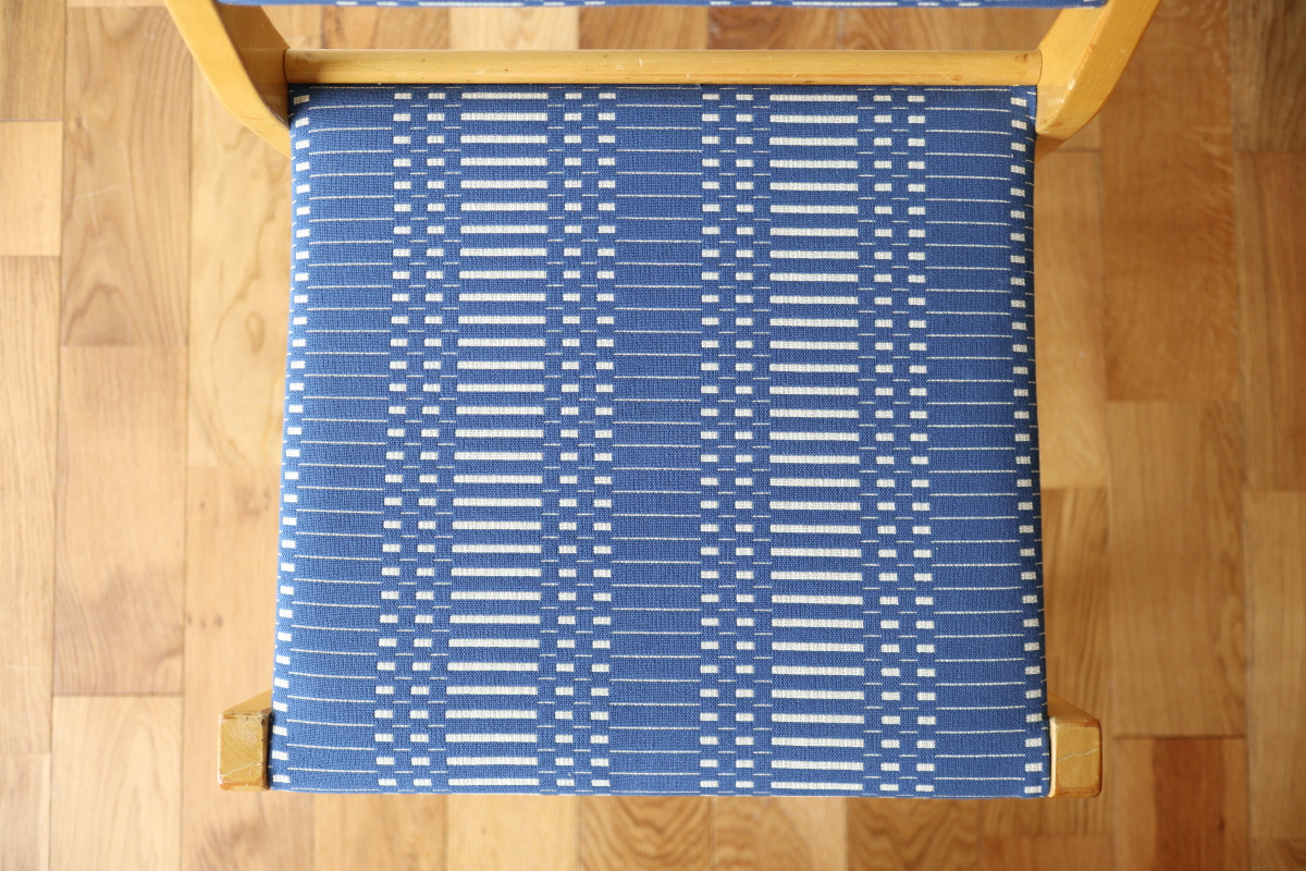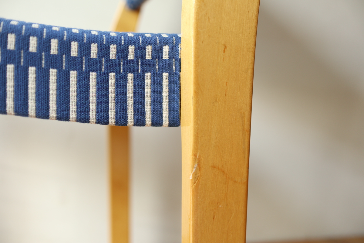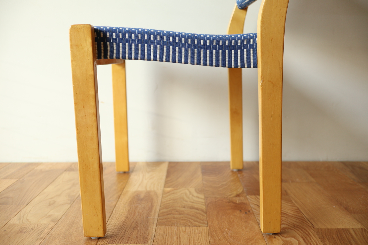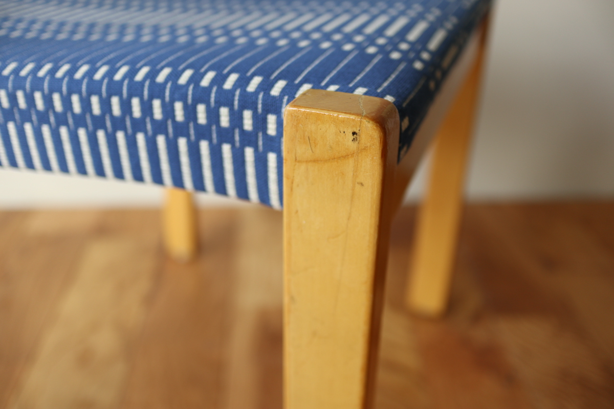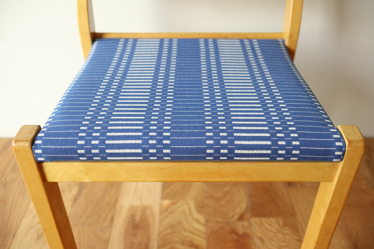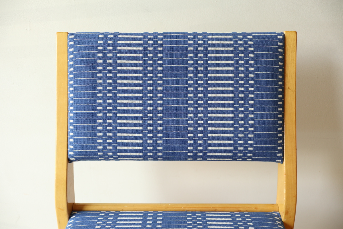 | Artekのスタンダードチェアの一つ、Chair 611です。 1930年代から生産されていた最古参のモデルの一つです。 現在は、ウェービングテープ仕様のみが生産されておりますが 当時は板座で製造されていました。 こちらは60年代後期から70年代頃の一台。 もともとファブリック仕様でしたが、当店入荷後 グリクセンの生地で張替えを行いました。 生地代だけでもなかなかの物ですのでかなりお買い得となっております。 |