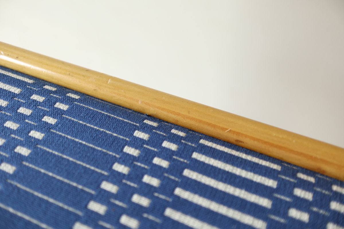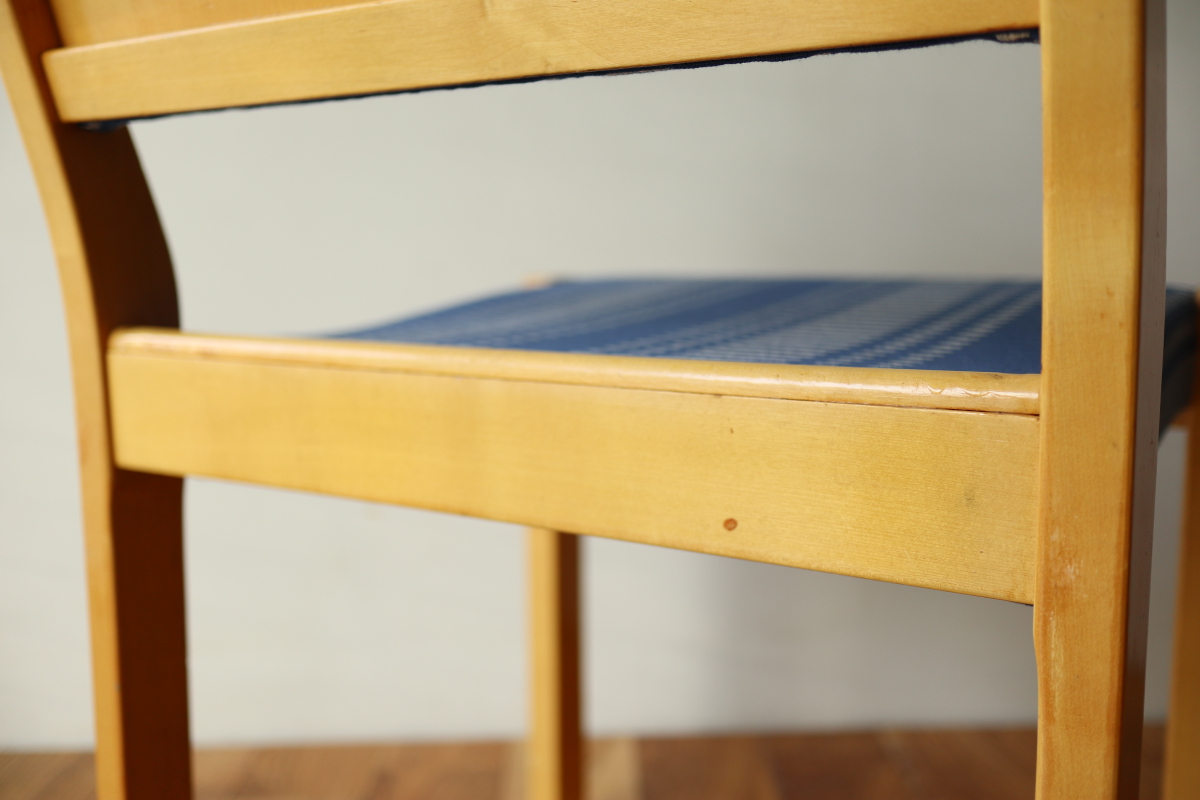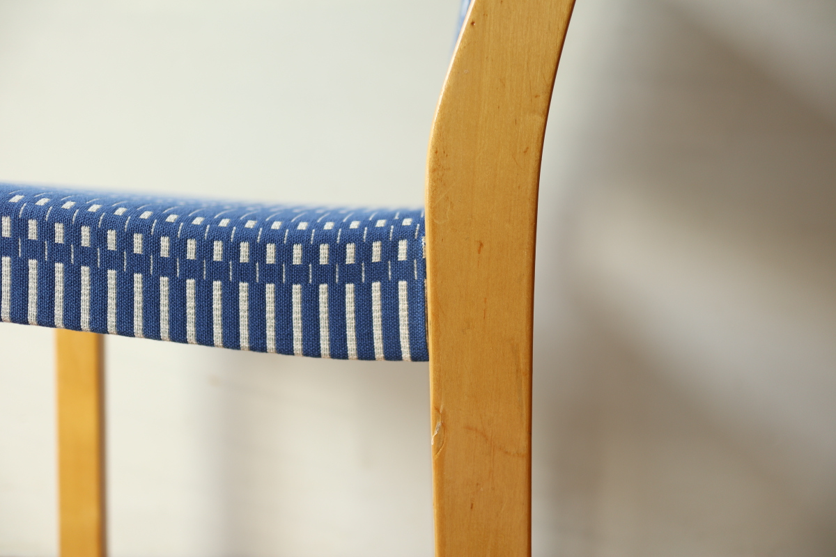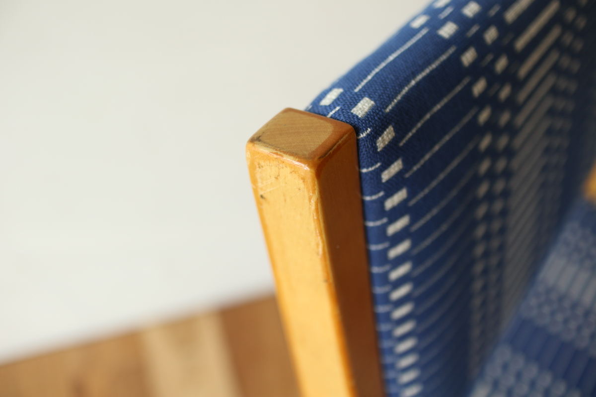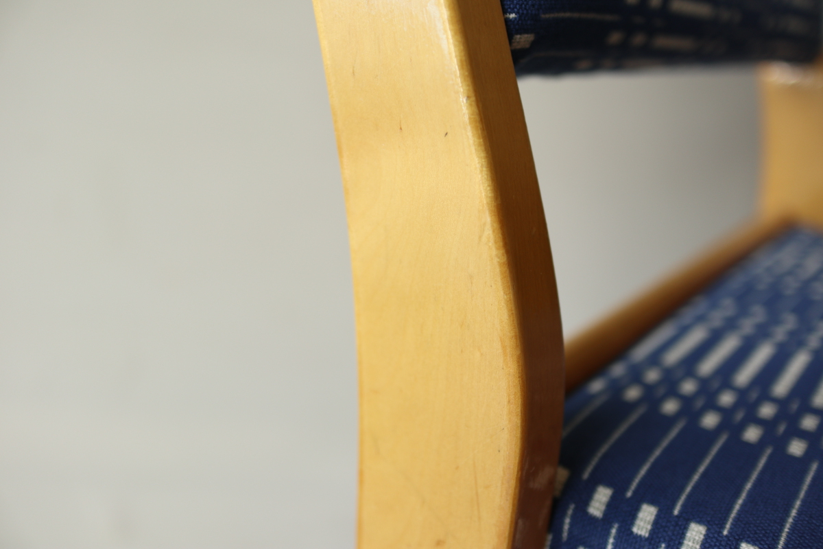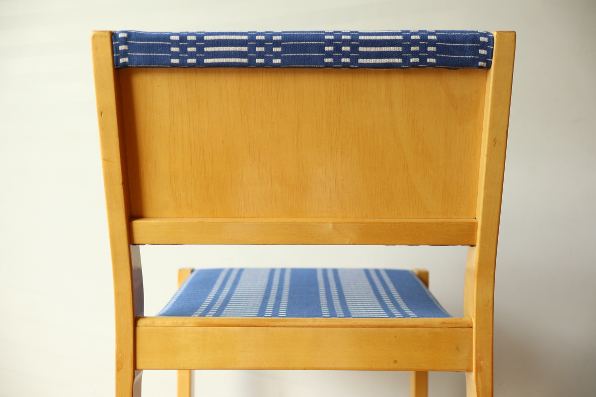| Artekのスタンダードチェアの一つ、Chair 611です。 1930年代から生産されていた最古参のモデルの一つです。 現在は、ウェービングテープ仕様のみが生産されておりますが 当時は板座で製造されていました。 こちらは60年代後期から70年代頃の一台。 もともとファブリック仕様でしたが、当店入荷後 グリクセンの生地で張替えを行いました。 生地代だけでもなかなかの物ですのでかなりお買い得となっております。 |