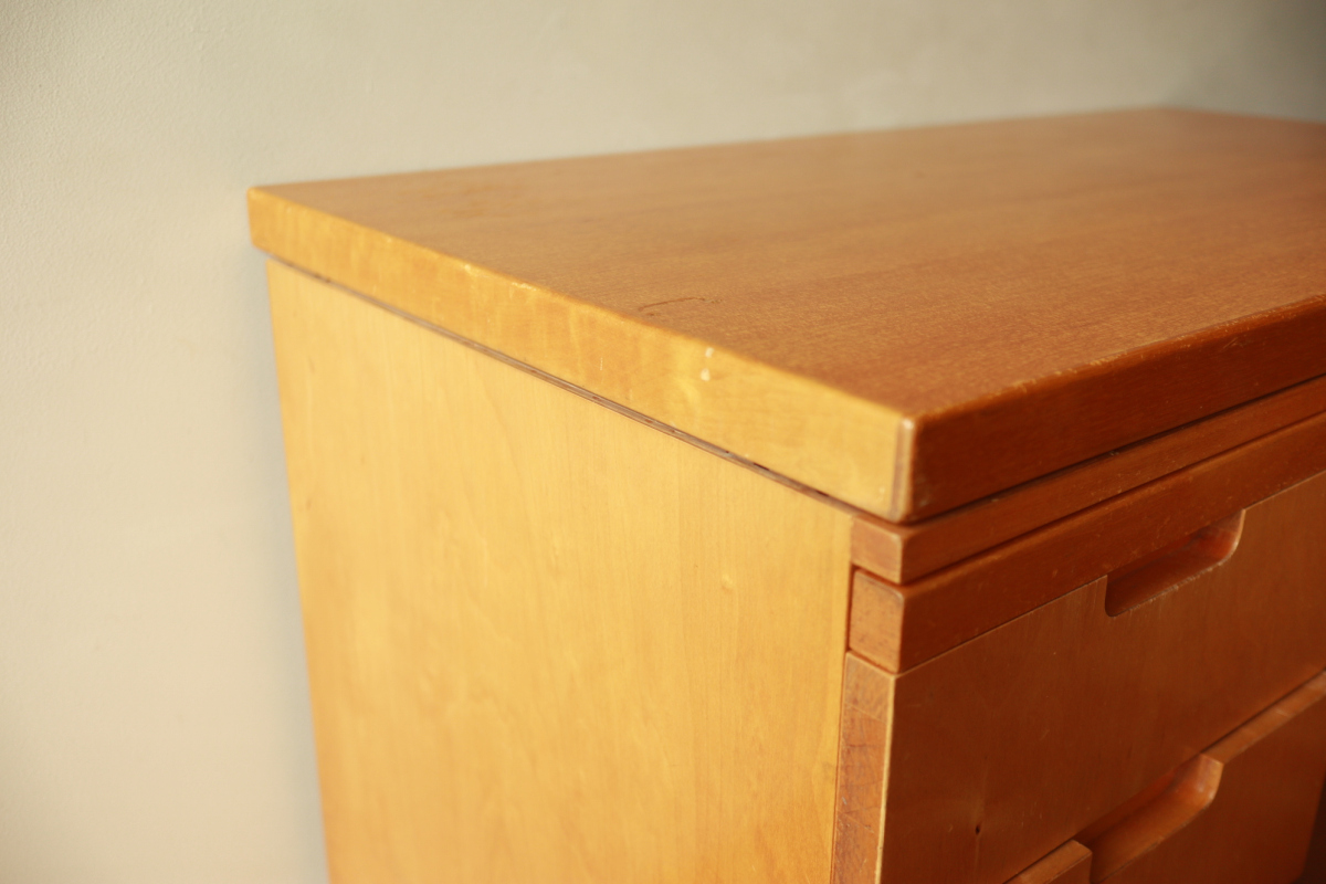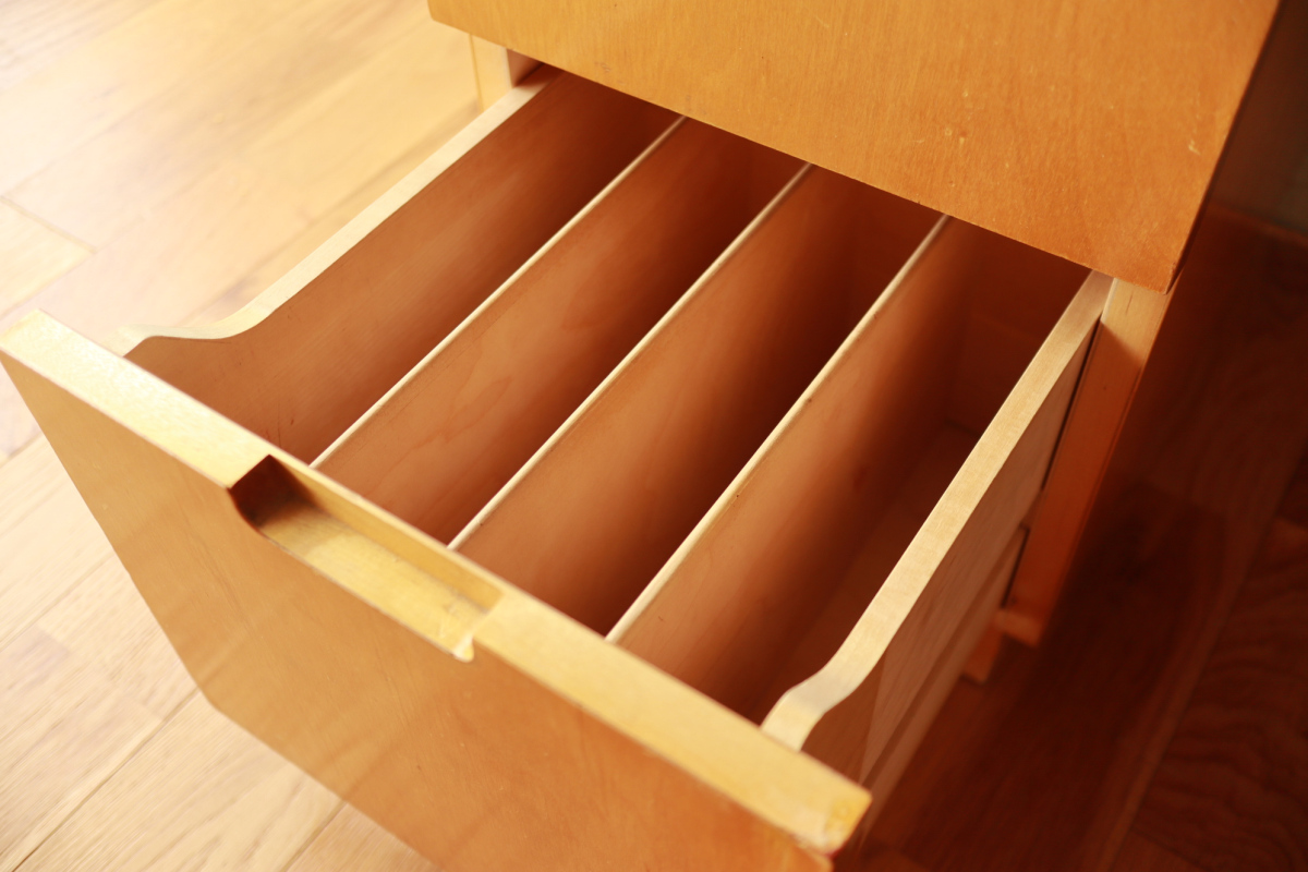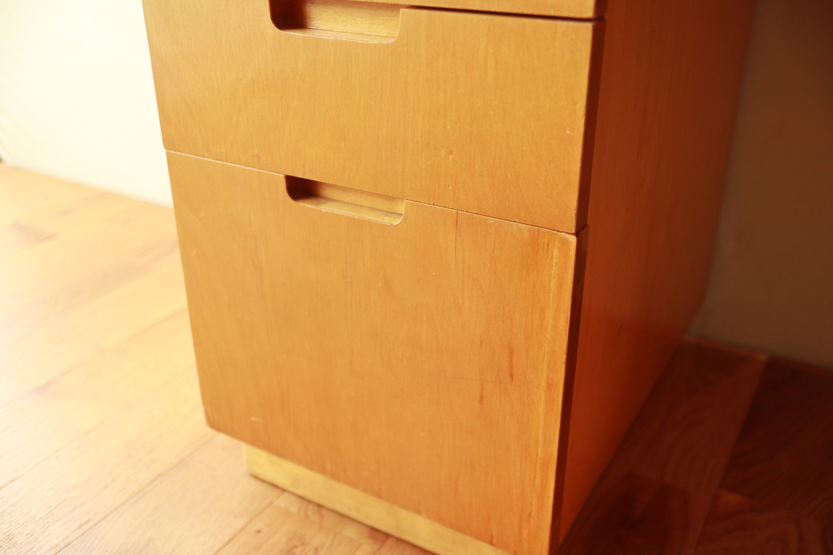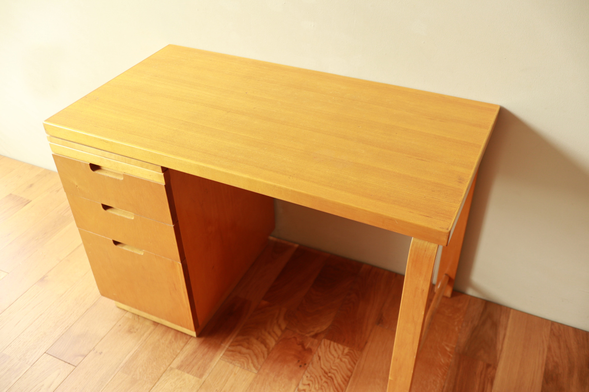 | Table & Deskboxのセットです。 40-50年代のカタログに掲載されており、型番は920。 デスクボックスの内部は間仕切りがあり書類整理の実用性が高いです。 また、引き出し式の拡張板も格納されております。 テーブルの脚には前後のつなぎがはいっており、他とは一線を画すデザインです。 標準的なデスクボックスとテーブルのセットではなく、モデル名を付与し 明確な意図をもってデザインされたシリーズです。 大変レアなモデルです。 |