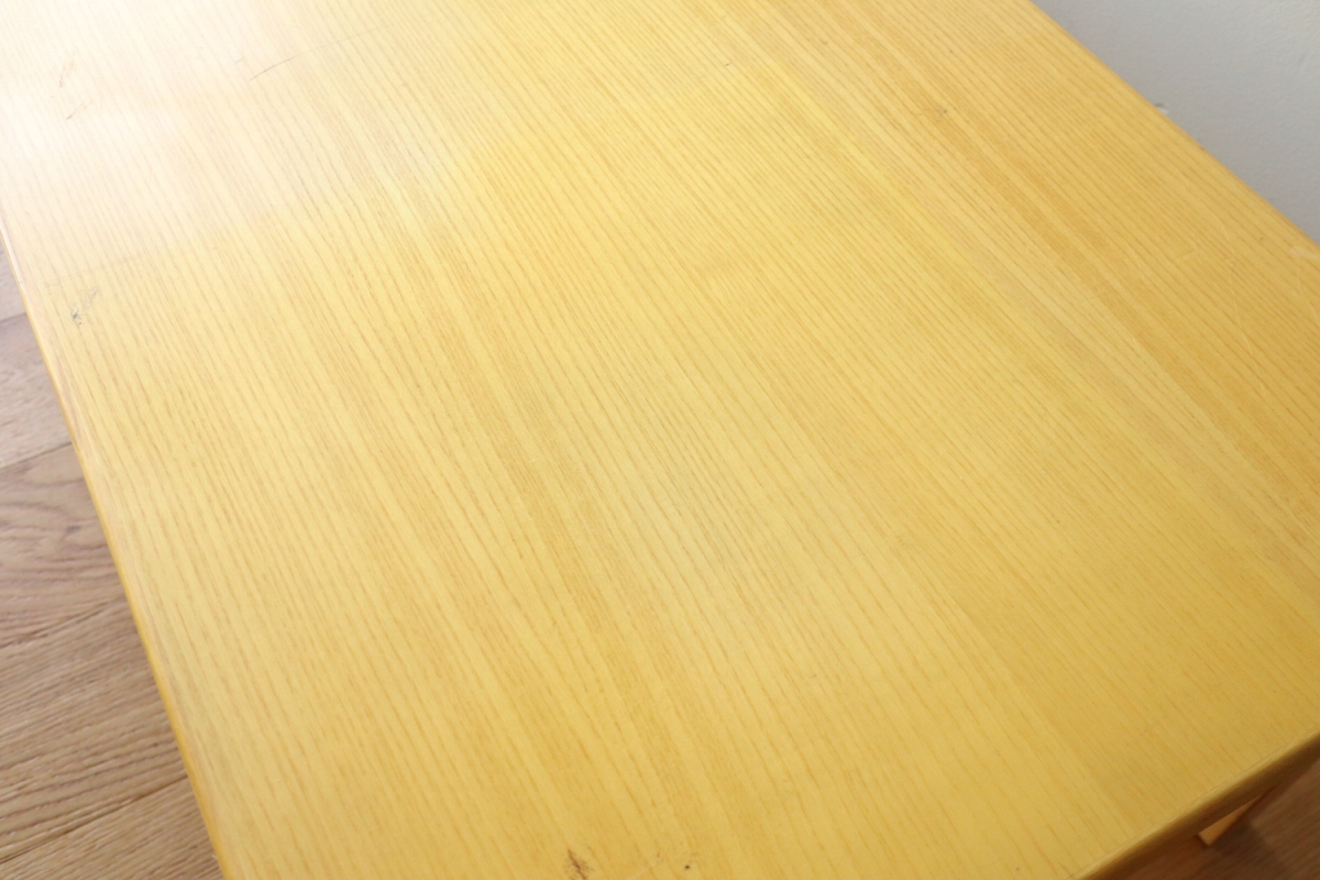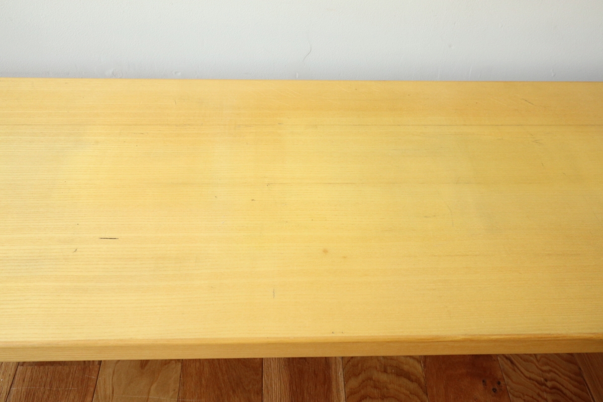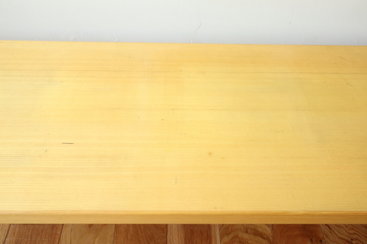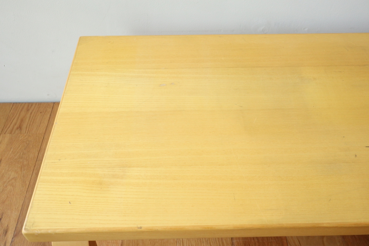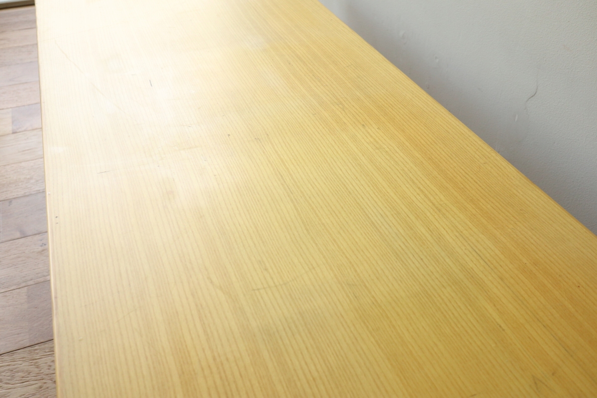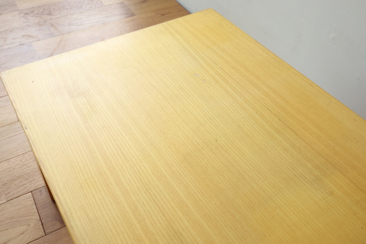 | 60-70年代頃のローテーブルです。アッシュトップです。 152cm x 45cmで72cm高さの規格テーブルはなく、 ダイニングテーブル仕様にしては天板が薄い、 また脚の処理も誰かがカットしたものではなくファクトリーオリジナルのクオリティであることから イレギュラーな高さの、当時のオーダー品と思われます。 壁際や窓際に寄せて飾り棚にしたり、ソファーテーブルや居間でちゃぶ台的に使ったりと 非常に使い勝手が良いサイズ感です。 こちらは分解せずに発送予定です。 分解をご希望の場合はお問い合わせください。 |