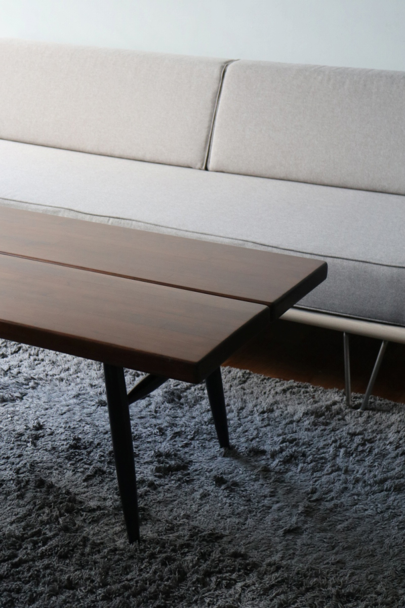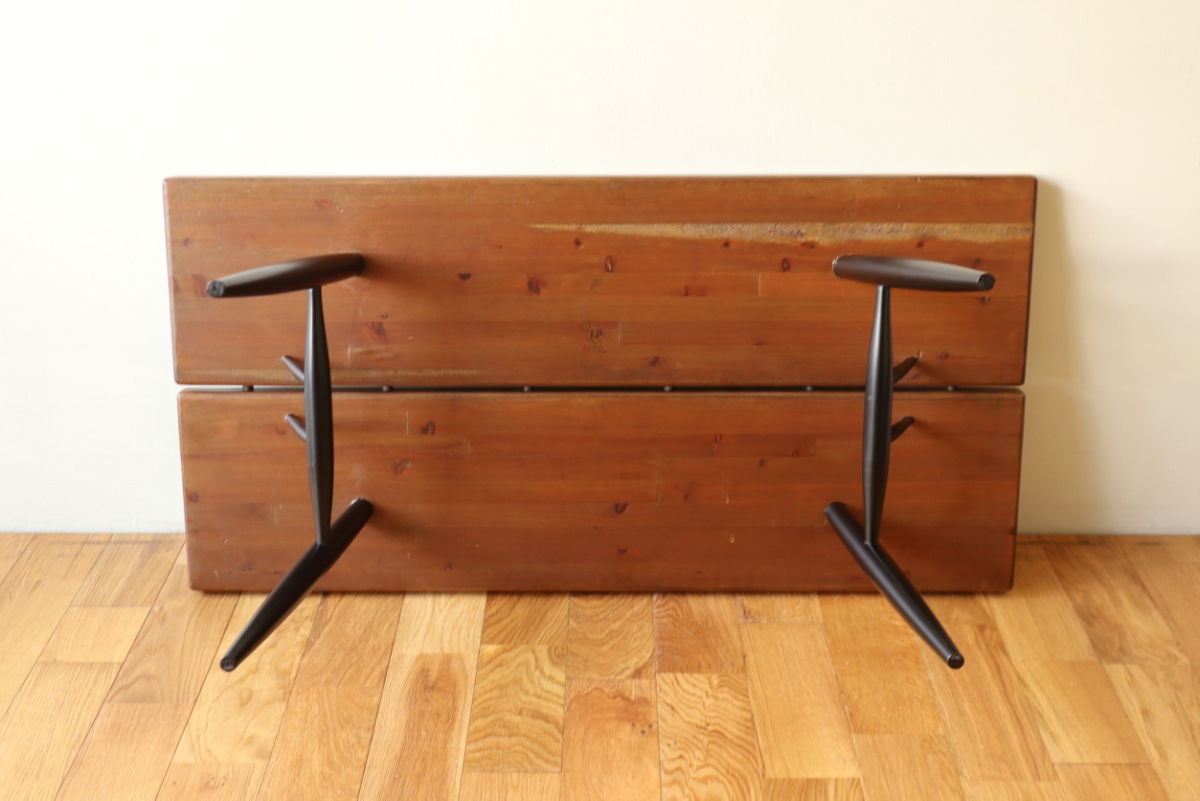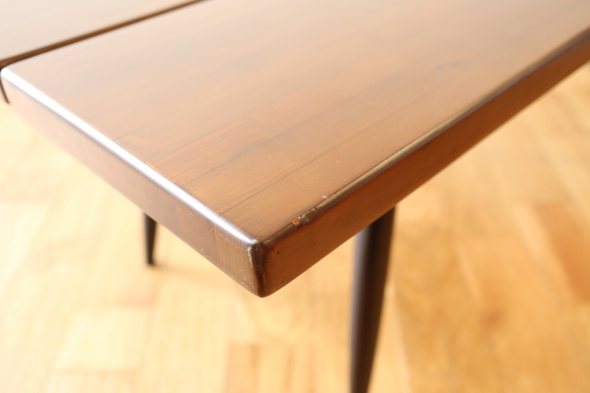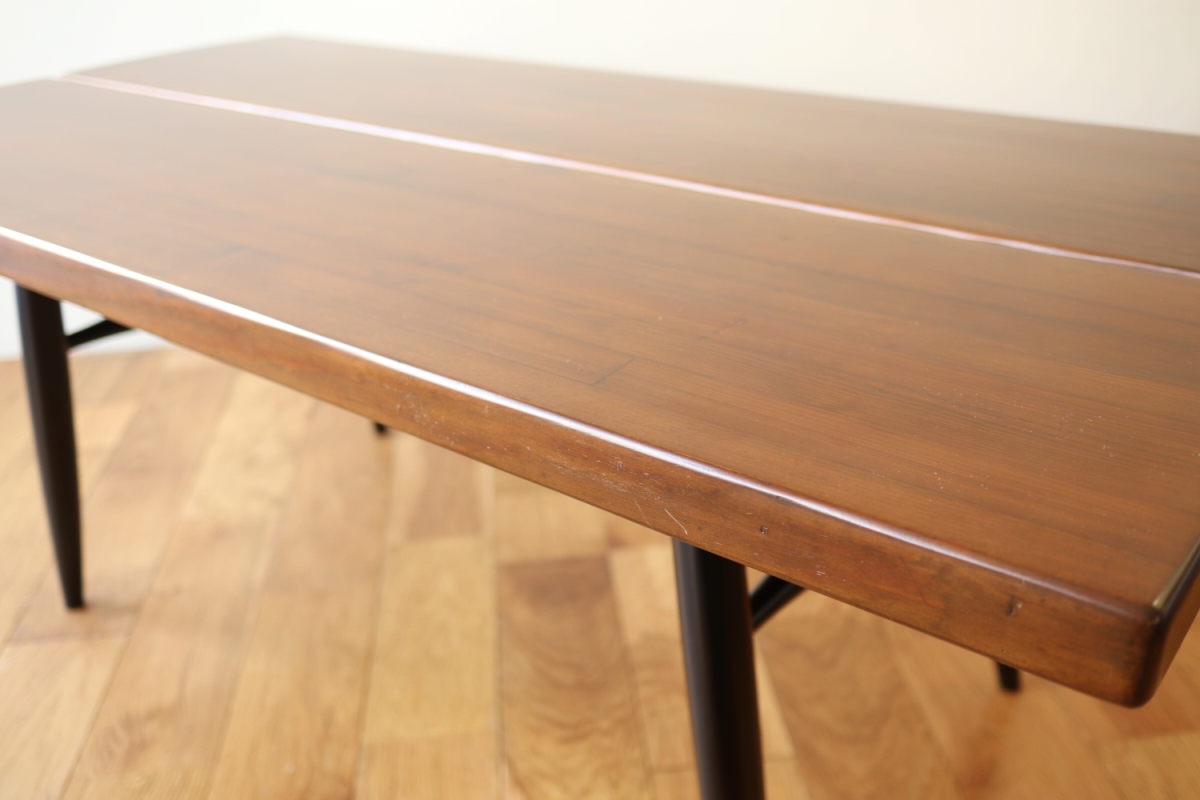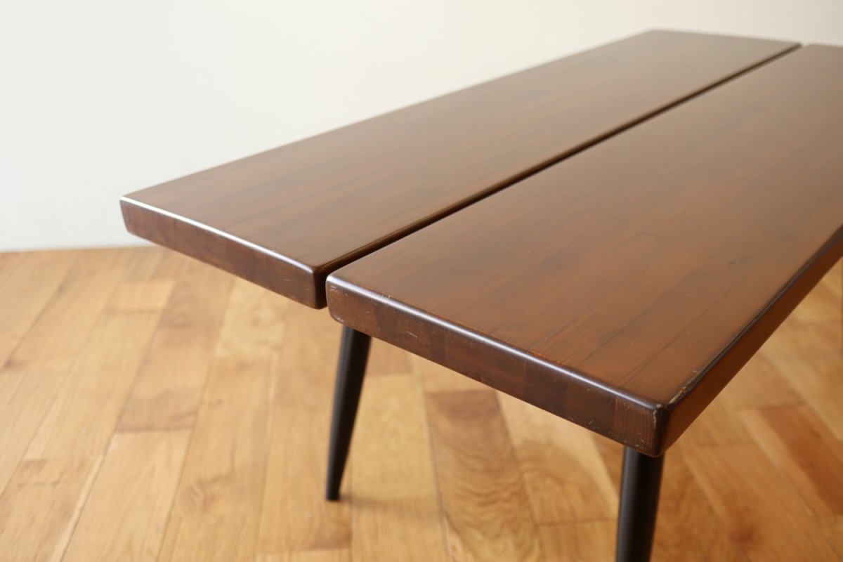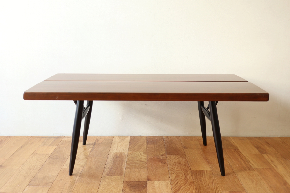 | イルマリ・タピオヴァーラの名作ピルッカシリーズのローテーブルです 50-60年代のラウカンプー社製のオリジナルヴィンテージで、ピルッカの中でラウンジチェアとともに 生産台数が少なく大変希少なモデルです。 120x60センチなのでコンパクトながらソファーテーブルとして十分な広さがあります。 当店入荷後、分解し各部調整、再塗装、組み立てをおこないましたので ぐらつきもなく安心してお使いいただけます。 再塗装済みなのでコップの水滴や和地味なども心配もなく日常使いにも対応します。 |
