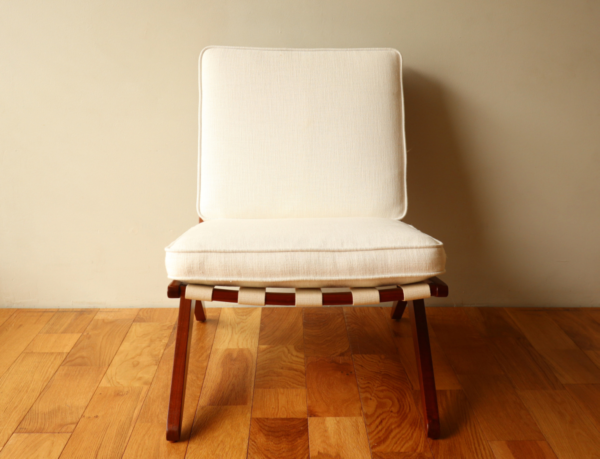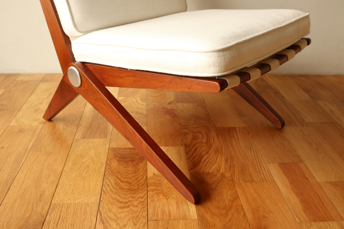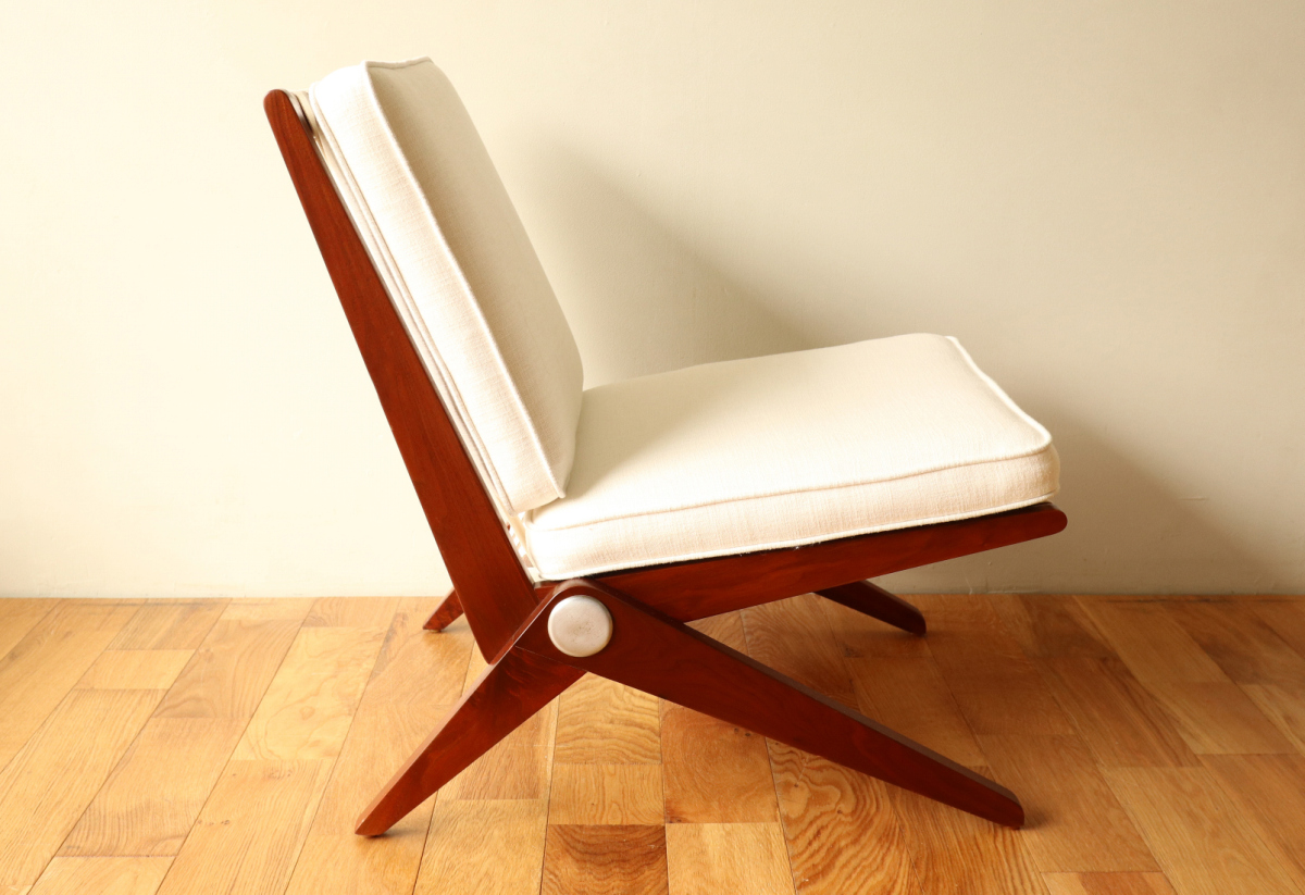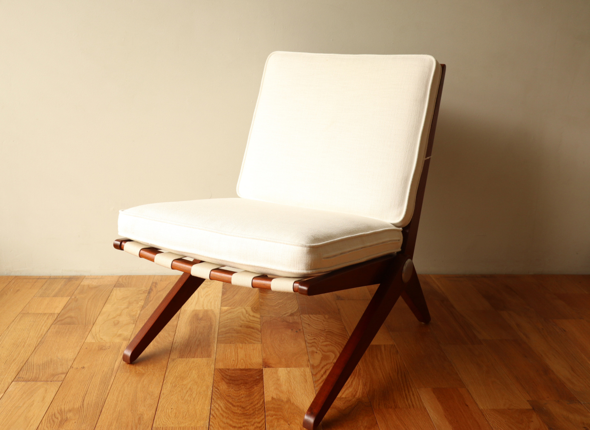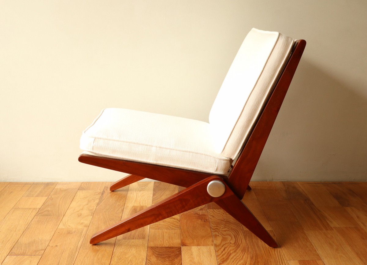 | ピエール・ジャンヌレによるシザーチェア。 交差するフレームによって構成されたシンプルな構造は、視覚的な軽やかさと力強さを同時に成立させています。 低く抑えられたプロポーションと傾斜のついた背は、ラウンジチェアとしての快適性と、空間に対する安定感をもたらします。 フレームは大変希少なチーク材。 脚のディテール、ラベルからみて50年代と判断しております。 フレームはオイルステインクリアラッカー、ウェービングテープ、クッション含めレストアされてから丁寧に使われていたようです。 シートクッションには木板は入っていませんので少し沈み込むようなゆったりした座り心地です。 背面にはKnoll Associates時代のラベルが確認できます。製造背景や流通経路を含め、 プロダクトとしての奥行きを感じさせるディテールのひとつと言えるでしょう。 ジャンヌレの家具に見られる「構造そのものが意匠となる」思想を体現した一脚。 単なるヴィンテージ家具に留まらず、空間を構成する要素として機能するプロダクトです。 |