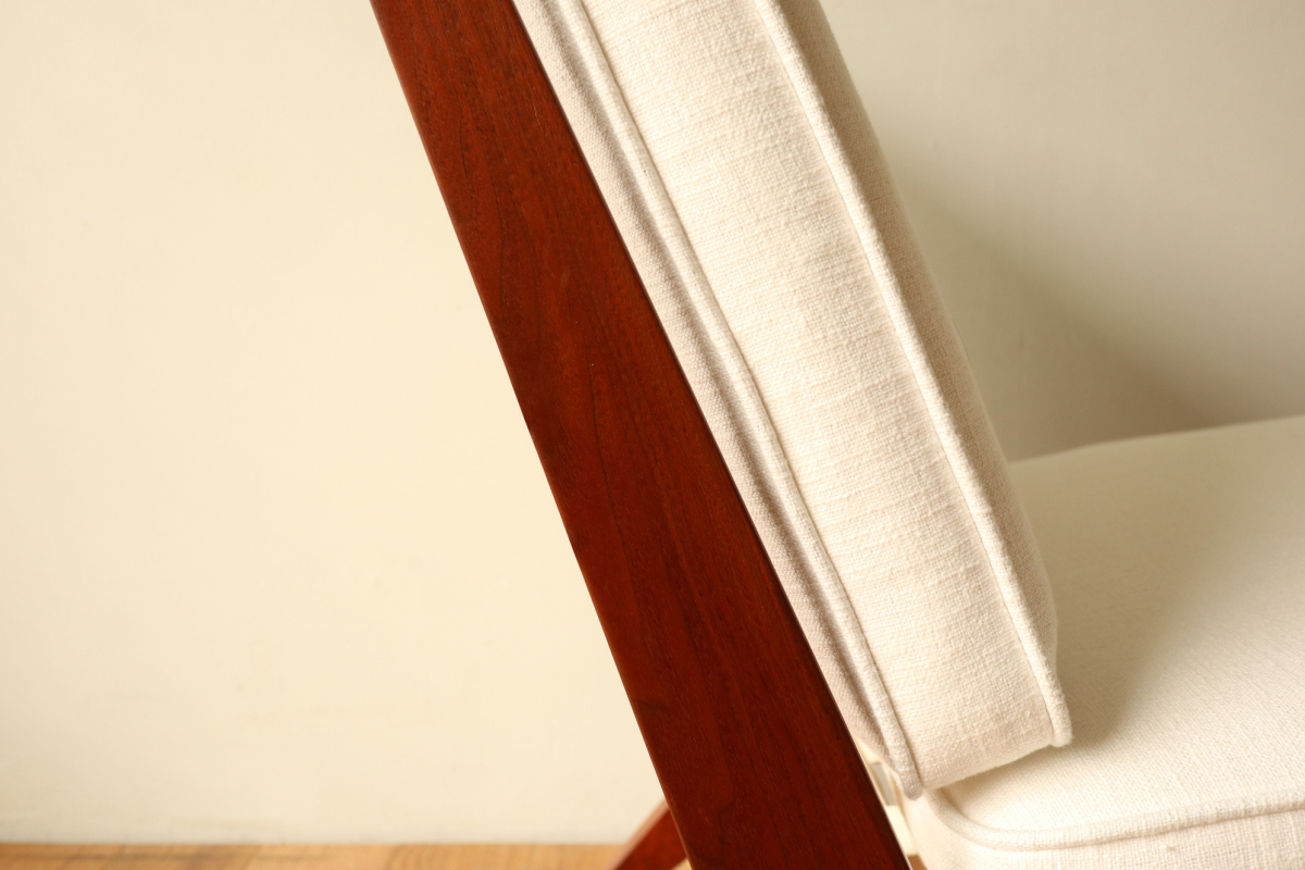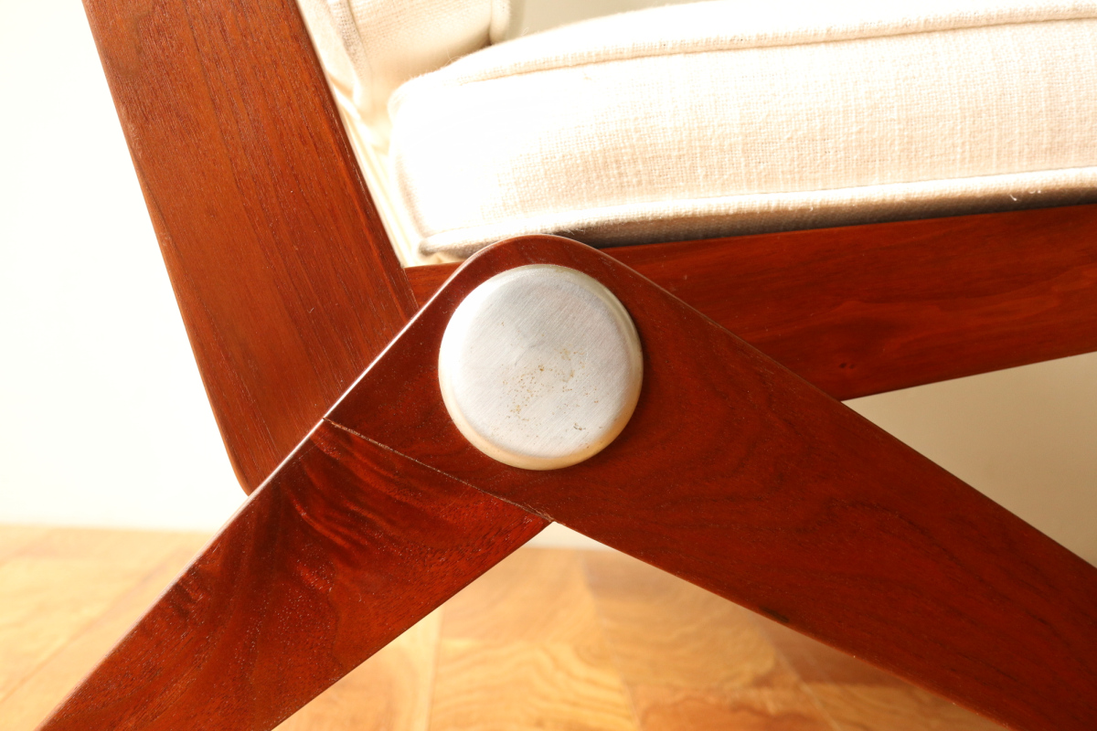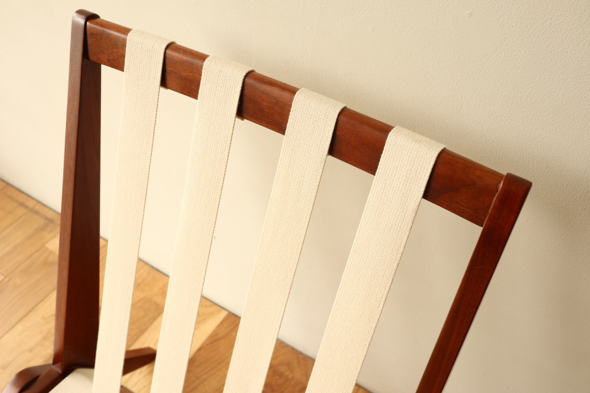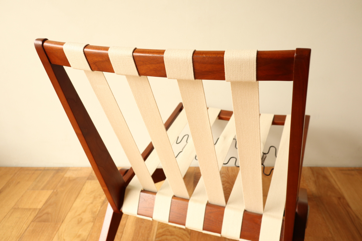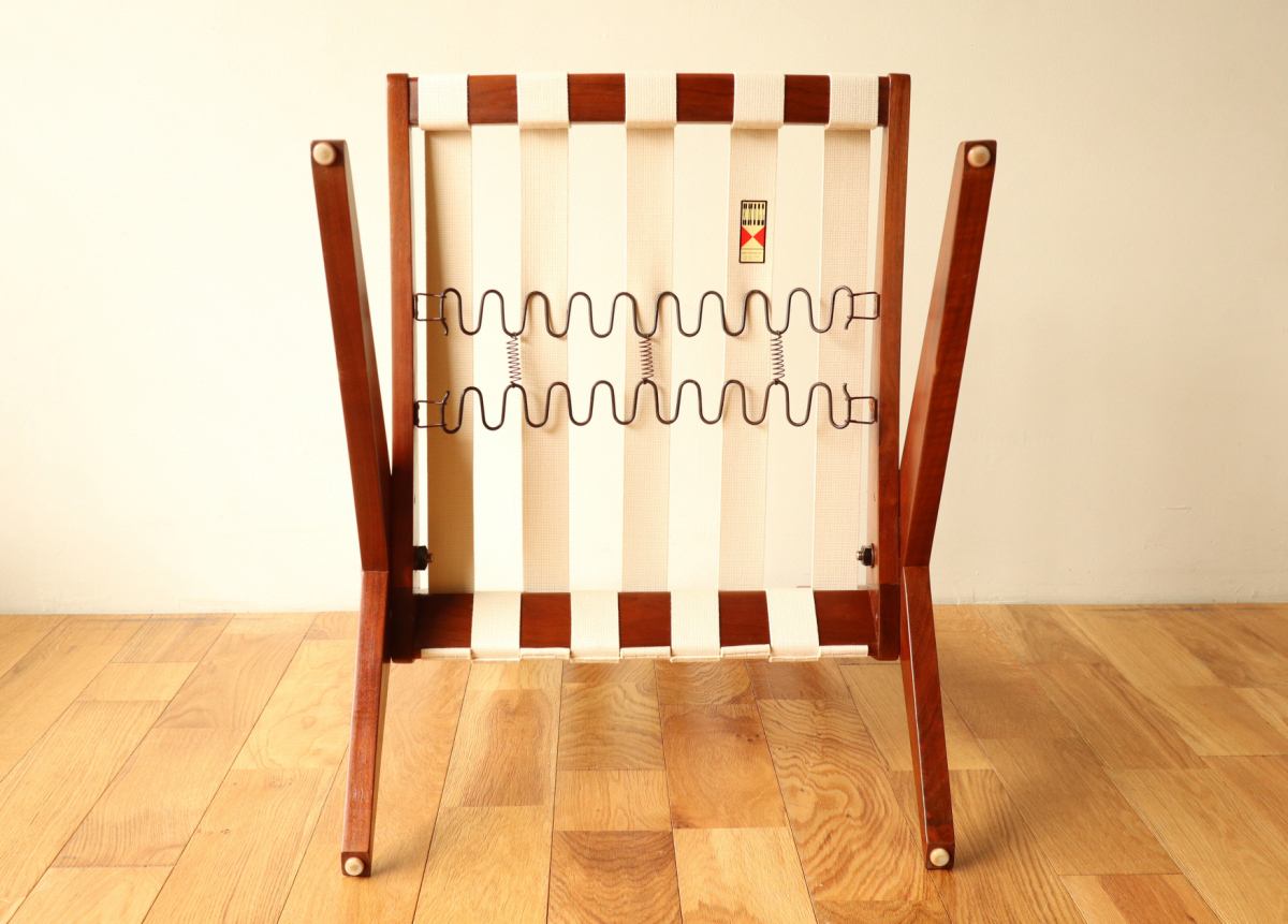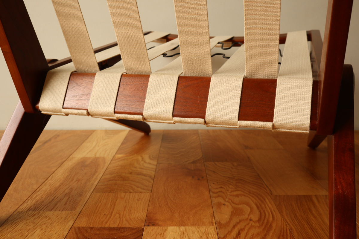| ピエール・ジャンヌレによるシザーチェア。 交差するフレームによって構成されたシンプルな構造は、視覚的な軽やかさと力強さを同時に成立させています。 低く抑えられたプロポーションと傾斜のついた背は、ラウンジチェアとしての快適性と、空間に対する安定感をもたらします。 フレームは大変希少なチーク材。 脚のディテール、ラベルからみて50年代と判断しております。 フレームはオイルステインクリアラッカー、ウェービングテープ、クッション含めレストアされてから丁寧に使われていたようです。 シートクッションには木板は入っていませんので少し沈み込むようなゆったりした座り心地です。 背面にはKnoll Associates時代のラベルが確認できます。製造背景や流通経路を含め、 プロダクトとしての奥行きを感じさせるディテールのひとつと言えるでしょう。 ジャンヌレの家具に見られる「構造そのものが意匠となる」思想を体現した一脚。 単なるヴィンテージ家具に留まらず、空間を構成する要素として機能するプロダクトです。 |